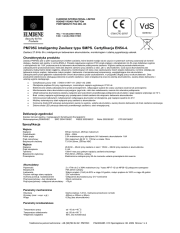 ELMDENE INTERNATIONAL LIMITED RODNEY ROAD FRATTON PORTSMOUTH PO4 8SS, UK TEL: + 44 (0) 2392 739412 FAX: + 44 (0) 2392 811631 PM705C Inteligentny Zasilacz typu SMPS. Certyfikacja EN54-4. Zasilacz 27.6Vdc 5A z inteligentnym ładowaniem akumulatorów, monitoringiem i zdalną sygnalizacją usterek. Charakterystyka produktu Zasilacz PM705C jest w pełni wyposażonym źródłem zasilania, które idealnie nadaje się do użycia w systemach ochrony pożarowej lub kontroli dostępu. Zasilacz jest zgodny z normą EN54-4. Posiada regulowane wyjście 27.6V prądu stałego o obciążalności do 5A oraz dodatkowo wyjście o obciążalności do 1.6A, przeznaczone do ładowania akumulatorów podtrzymania zasilania. Wyjście zasilacza posiada elektroniczne zabezpieczenie przeciwzwarciowe, które jest aktywne zarówno przy zasilaniu z sieci, jak i z akumulatorów. Czas życia akumulatorów jest wydłużany maksymalnie dzięki ciągłemu, aktywnemu monitoringowi ich stanu oraz zastosowaniu trzech etapów ładowania, na które składają się: ładowanie dużym prądem, ładowanie małym prądem i ładowanie z temperaturową kompensacją, uwzględniające stan akumulatora. Zabezpieczenie przed głębokim rozładowaniem chroni akumulatory przed uszkodzeniem, w przypadku długiej pracy na akumulatorach. Dwa przekaźniki elektroniczne obsługują zdarzenie (i) usterki zasilania z sieci energetycznej oraz (ii) usterkę akumulatorów, awarię układu ładowania i usterkę wyjścia zasilającego. Certyfikowany przez VdS i EN54-4:1997 +A1: 2002 +A2: 2006 Obciążenie prądowe 5A przy regulowanym, nominalnym napięciu wyjściowym 27.6V dc Elektroniczne układy zabezpieczenia przed przeciążeniem, odłączające wyjście do czasu usunięcia zwarcia lub przeciążenia Monitorowanie stanu akumulatora wykrywające: jego brak, niski stan naładowania, zwarcie lub odwrotne podłączenie. Układ ładowania akumulatora zasilany wyłącznie pod warunkiem prawidłowego podłączenia akumulatora i jego napięcia większego od 14 V. Brak zmiany napięcia wyjściowego przy przełączaniu źródeł zasilania lub włączaniu ładowania akumulatorów. Ochrona przed całkowitym rozładowaniem odłączająca akumulator od obciążenia, gdy napięcie spadnie do 21V. Możliwy automatyczny start wyłącznie przy zasilaniu z akumulatorów Czerwona dioda LED wskazuje pulsowaniem awarię na wyjściu, usterkę akumulatora, awarię obwodu ładowania lub brak zasilania sieciowego. Zielona dioda LED pokazuje obecność prawidłowego zasilania z sieci energetycznej. Deklaracje zgodności Zasilacz ten jest zgodny z następującymi Dyrektywami Europejskimi: Niskonapięciową 2006/95/EC EMC 2004/108/EC WEEE 2002/96/EC RoHs 2002/95/EC CPD 89/106/EC Specyfikacja Wejście Napięcie Częstotliwość Pobór prądu Prąd rozruchowy Bezpiecznik sieciowy 93Vac minimum, 264Vac maksimum 45Hz – 65Hz 2.5A maksimum przy obciążeniu 5A i ładowaniu akumulatorów 1.6A O 30A maksimum @ 25 C, 110Vac w czasie 10ms T3.15A 20mm, 250Vac HBC Wyjście Napięcie Prąd obciążenia Tętnienia Bezpiecznik wyjściowy Przeciążenie 26.0Vdc – 28vdc przy zasilaniu z sieci / 18Vdc – 26Vdc przy zasilaniu z akumulatorów 0 -5A 100mV max przy pełnym napięciu zasilania sieciowego F5A 20mm, 250Vac, szklany Elektroniczne odcięcie przy 8A do momentu ustania przeciążenia lub zwarcia Akumulatory Pojemność Bezpiecznik Ładowanie Poziom niskiego stanu napięcia Ochrona przed gł. rozładowaniem Prąd spoczynkowy –bez obciążenia Prąd spoczynkowy –odłączone akumulatory 2 x 17Ah do 2 x 38Ah maksimum (np. Yuasa NP17-12 lub NP38-12) połączone szeregowo F5A 20mm szklany Stałym prądem (1.6A) do 80% w ciągu 24 godzin, małym prądem do 100% w ciągu 48 godzin 23V nominalnie Odłączenie akumulatora przy 21V nominalnie 25mA nominalnie <70µA Parametry mechaniczne Obudowa Wymiary (szer. x wys. x gł.) Waga blacha stalowa 1.2mm, malowana proszkowo na biało 400mm x 420mm x 80mm 6.2kg (bez akumulatorów) Parametry środowiskowe O Temperatura pracy Temperatura składowania Wilgotność względna od -10 do +40 C O od -20 do +80 C 95%, bez kondensacji Telefoniczna pomoc techniczna: +48 (58)760 64 92 PM705C PAK200485 01C Sporządzono: 08. 2009 Strona 1 z 4 Wyprowadzenia Napięcie wyjściowe Wyjście przekaźnika elektronicznego (Power Supply Unit Fault – uszkodzenie zasilacza) Wyjście przekaźnika elektronicznego (External Power Supply Fault – uszkodzenie zasilania sieciowego) Do podłączenia czujnika temperatury akumulatorów Do podłączenia akumulatorów Niepodłączone O/P „+” i „-” PSU Fault EPS Fault Temp. sensor BATT „+” i „-” FAN „+” i „-” Cechy użytkowe Obsługa zdarzeń utraty i wahania napięcia zasilania W przypadku braku zasilania z sieci energetycznej, trwającego dłużej niż 10s, wykrywane jest zdarzenie “Utrata zasilania”, aktywowane jest wyjście EPS Fault i deaktywowana jest zielona dioda LED wskazującą zasilanie z sieci. Krótsze zaniki napięcia nie są sygnalizowane, dzięki czemu zmniejszono liczbę niepotrzebnych alarmów. Czerwona dioda LED powinna pulsować z częstotliwością około 1Hz wskazując poprawną pracę zasilacza na akumulatorach. Zasilanie awaryjne Po utracie zasilania z sieci energetycznej, zasilacz powinien automatycznie przełączyć się na zasilanie z akumulatorów i zasilać bez zakłóceń podłączone urządzenia – oczywiście pod warunkiem wystarczającego naładowania akumulatorów. Dioda LED na panelu przednim obudowy będzie pulsować, wskazując prawidłową pracę zasilacza na akumulatorach. Podczas pracy przy braku zasilania sieciowego, napięcie akumulatorów jest monitorowane w sposób ciągły. Jeżeli spadnie poniżej poziomu wyzwalania zdarzenia „Niski stan akumulatorów” (około 23V), sygnalizowana jest usterka na panelu przednim urządzenia i aktywowana jest dioda LED sygnalizująca niski poziom napięcia akumulatorów. Zarządzanie akumulatorami Akumulatory są regular