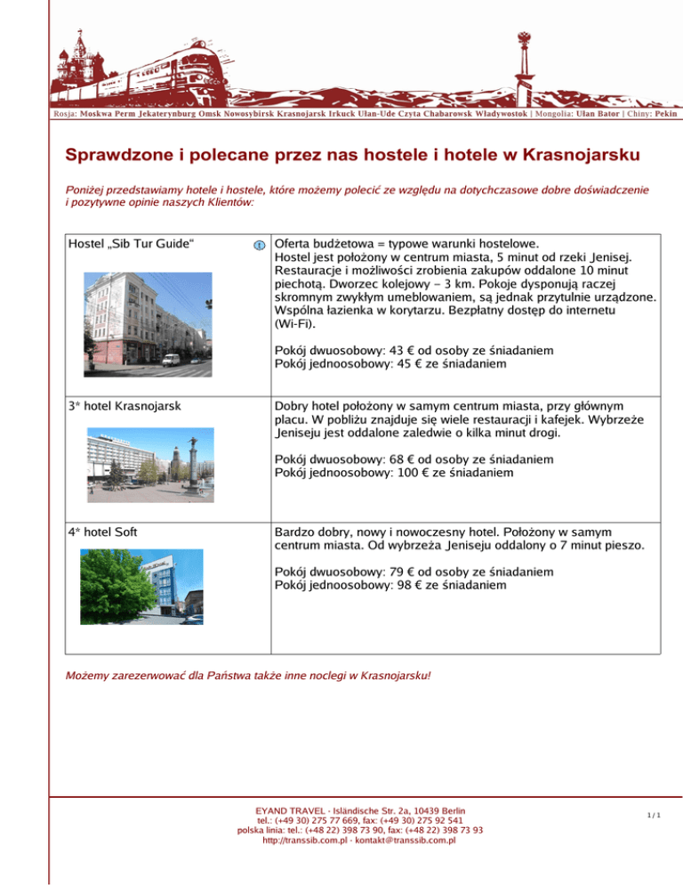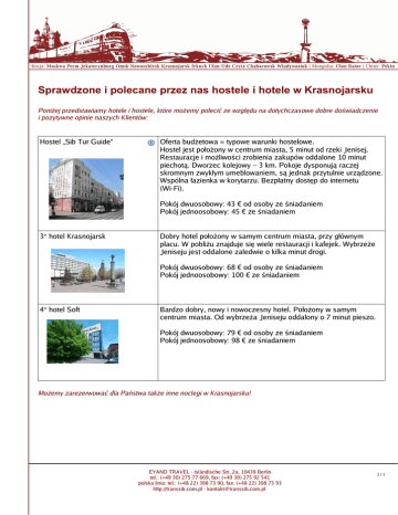 Sprawdzone i polecane przez nas hostele i hotele w Krasnojarsku Poniżej przedstawiamy hotele i hostele, które możemy polecić ze względu na dotychczasowe dobre doświadczenie i pozytywne opinie naszych Klientów: Hostel „Sib Tur Guide“ t Oferta budżetowa = typowe warunki hostelowe. Hostel jest położony w centrum miasta, 5 minut od rzeki Jenisej. Restauracje i możliwości zrobienia zakupów oddalone 10 minut piechotą. Dworzec kolejowy – 3 km. Pokoje dysponują raczej skromnym zwykłym umeblowaniem, są jednak przytulnie urządzone. Wspólna łazienka w korytarzu. Bezpłatny dostęp do internetu (Wi-Fi). Pokój dwuosobowy: 43 € od osoby ze śniadaniem Pokój jednoosobowy: 45 € ze śniadaniem 3* hotel Krasnojarsk Dobry hotel położony w samym centrum miasta, przy głównym placu. W pobliżu znajduje się wiele restauracji i kafejek. Wybrzeże Jeniseju jest oddalone zaledwie o kilka minut drogi. Pokój dwuosobowy: 68 € od osoby ze śniadaniem Pokój jednoosobowy: 100 € ze śniadaniem 4* hotel Soft Bardzo dobry, nowy i nowoczesny hotel. Położony w samym centrum miasta. Od wybrzeża Jeniseju oddalony o 7 minut pieszo. Pokój dwuosobowy: 79 € od osoby ze śniadaniem Pokój jednoosobowy: 98 € ze śniadaniem Możemy zarezerwować dla Państwa także inne noclegi w Krasnojarsku! EYAND TRAVEL · Isländische Str. 2a, 10439 Berlin tel.: (+49 30) 275 77 669, fax: (+49 30) 275 92 541 polska linia: tel.: (+48 22) 398 73 90, fax: (+48 22) 398 73 93 http://transsib.com.pl · [email protected] 1/1