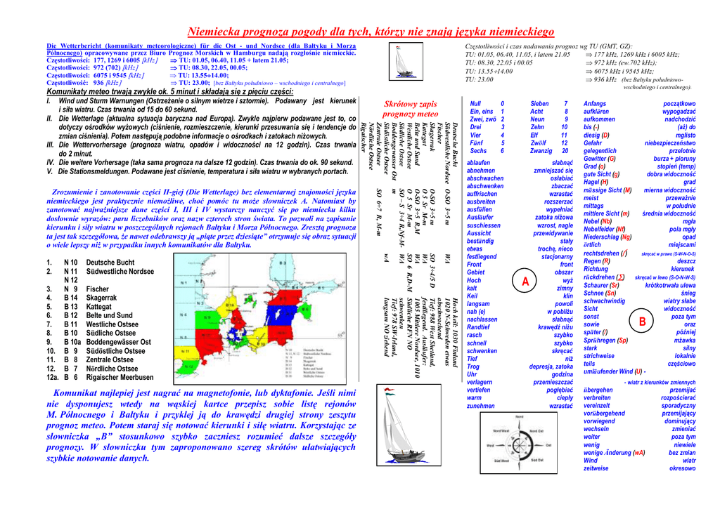 Niemiecka prognoza pogody dla tych, którzy nie znają języka niemieckiego Die Wetterbericht (komunikaty meteorologiczne) für die Ost - und Nordsee (dla Bałtyku i Morza Północnego) opracowywane przez Biuro Prognoz Morskich w Hamburgu nadają rozgłośnie niemieckie. Częstotliwości: 177, 1269 i 6005 kHz TU: 01.05, 06.40, 11.05 + latem 21.05; Częstotliwości: 972 (702) kHz TU: 08.30, 22.05, 00.05; Częstotliwości: 6075 i 9545 kHz TU: 13.5514.00; Częstotliwość: 936 kHz TU: 23.00; [bez Bałtyku południowo – wschodniego i centralnego] Częstotliwości i czas nadawania prognoz wg TU (GMT, GZ): TU: 01.05, 06.40, 11.05, i latem 21.05 177 kHz, 1269 kHz i 6005 kHz; TU: 08.30, 22.05 i 00.05 972 kHz (ew.702 kHz); TU: 13.5514.00 6075 kHz i 9545 kHz; TU: 23.00 936 kHz (bez Bałtyku południowowschodniego i centralnego). Komunikaty meteo trwają zwykle ok. 5 minut i składają się z pięciu części: I. III. IV. V. O-SO 3÷5 m Komunikat najlepiej jest nagrać na magnetofonie, lub dyktafonie. Jeśli nimi nie dysponujesz wtedy na wąskiej kartce przepisz sobie listę rejonów M. Północnego i Bałtyku i przyklej ją do krawędzi drugiej strony zeszytu prognoz meteo. Potem staraj się notować kierunki i siłę wiatru. Korzystając ze słowniczka „B” stosunkowo szybko zaczniesz rozumieć dalsze szczegóły prognozy. W słowniczku tym zaproponowano szereg skrótów ułatwiających szybkie notowanie danych. Hoch keil: 1030 Finland WA 1020 N-Schweden etwas abschwachend SO 3÷4/5 D Tief: 988 West Shetland, WA festlliegend. Ausläufer: WA 1005 Mittlere Nordsee, 1010 SO 6 R,D-M Südliche RFN NO WA schwenken Tief: 978 SW-Irland, langsam NO ziehend Fischer Skagerrak Kattegat Belte und Sund Westliche Ostsee Südliche Ostsee Boddengewässer Ost Südöstliche Ostsee Zentrale Ostsee Nördliche Ostsee Rigaischer Meerbusen wA Deutsche Bucht Südwestliche Nordsee O-SO 3÷5 m O 5 Sr M-m O-SO 3÷5 R,M O 5 Sr M-m SO – S 3÷4 R,Nf-Mm N 10 N 11 N 12 3. N 9 4. B 14 5. B 13 6. B 12 7. B 11 8. B 10 9. B 10a 10. B 9 11. B 8 12. B 7 12a. B 6 SO 6÷7 R, M-m Zrozumienie i zanotowanie części II-giej (Die Wetterlage) bez elementarnej znajomości języka niemieckiego jest praktycznie niemożliwe, choć pomóc tu może słowniczek A. Natomiast by zanotować najważniejsze dane części I, III i IV wystarczy nauczyć się po niemiecku kilku dosłownie wyrazów: paru liczebników oraz nazw czterech stron świata. To pozwoli na zapisanie kierunku i siły wiatru w poszczególnych rejonach Bałtyku i Morza Północnego. Zresztą prognoza ta jest tak szczegółowa, że nawet odebrawszy ją „piąte przez dziesiąte” otrzymuje się obraz sytuacji o wiele lepszy niż w przypadku innych komunikatów dla Bałtyku. 1. 2. Skrótowy zapis prognozy meteo Deutsche Bucht Südwestliche Nordsee Fischer Skagerrak Kattegat Belte und Sund Westliche Ostsee Südliche Ostsee Boddengewasser Ost Südöstliche Ostsee Zentrale Ostsee Nördliche Ostsee Rigaischer Meerbusen II. Wind und Sturm Warnungen (Ostrzeżenie o silnym wietrze i sztormie). Podawany jest kierunek i siła wiatru. Czas trwania od 15 do 60 sekund. Die Wetterlage (aktualna sytuacja baryczna nad Europą). Zwykle najpierw podawane jest to, co dotyczy ośrodków wyżowych (ciśnienie, rozmieszczenie, kierunki przesuwania się i tendencje do zmian ciśnienia). Potem następują podobne informacje o ośrodkach i zatokach niżowych. Die Wettervorhersage (prognoza wiatru, opadów i widoczności na 12 godzin). Czas trwania do 2 minut. Die weitere Vorhersage (taka sama prognoza na dalsze 12 godzin). Czas trwania do ok. 90 sekund. Die Stationsmeldungen. Podawane jest ciśnienie, temperatura i siła wiatru w wybranych portach. Null Ein, eins Zwei, zwö Drei Vier Fünf Sechs 0 1 2 3 4 5 6 ablaufen abnehmen abschwachen abschwenken auffrischen ausbreiten ausfüllen Ausläufer suschiessen Aussicht beständig etwas festliegend Front Gebiet Hoch kalt Keil langsam nah (e) nachlassen Randtief rasch schnell schwenken Tief Trog Uhr verlagern vertiefen warm zunehmen Sieben Acht Neun Zehn Elf Zwölf Zwanzig A 7 8 9 10 11 12 20 słabnąć zmniejszać się osłabiać zbaczać wzrastać rozszerzać wypełniać zatoka niżowa wzrost, nagle przewidywanie stały trochę, nieco stacjonarny front obszar wyż zimny klin powoli w pobliżu słabnąć krawędź niżu szybko szybko skręcać niż depresja, zatoka godzina przemieszczać pogłębiać ciepły wzrastać Anfangs początkowo aufklären wypogadzać aufkommen nadchodzić bis (-) (aż) do diesig (D) mglisto Gefahr niebezpieczeństwo gelegentlich przelotnie Gewitter (G) burza + pioruny Grad (o) stopień (temp) gute Sicht (g) dobra widoczność Hagel (H) grad mässige Sicht (M) mierna widoczność meist przeważnie mittags w południe mittlere Sicht (m) średnia widoczność Nebel (Nb) mgła Nebelfelder (Nf) pola mgły Niederschlag (Ng) opad örtlich miejscami rechtsdrehen ( ) skręcać w prawo (S-W-N-O-S) Regen (R) deszcz Richtung kierunek rückdrehen () skręcać w lewo (S-O-N-W-S) Schaurer (Sr) krótkotrwała ulewa Schnee (Sn) śnieg schwachwindig wiatry słabe Sicht widoczność sonst poza tym sowie oraz später (/) później Sprühregen (Sp) mżawka stark silny strichweise lokalnie teils częściowo umläufender Wind (U) - B - wiatr z kierunków zmiennych übergehen verbreiten vereinzelt vorübergehend vorwiegend wechseln weiter wenig wenige Änderung (wA) Wind zeitweise przemijać rozpościerać sporadyczny przemijający dominujący zmieniać poza tym niewiele bez zmian wiatr okresowo