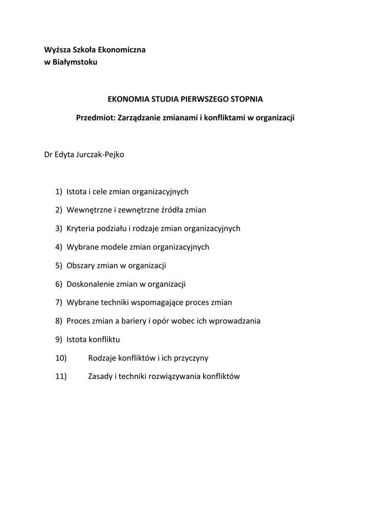Wyższa Szkoła Ekonomiczna w Białymstoku EKONOMIA STUDIA PIERWSZEGO STOPNIA Przedmiot: Zarządzanie zmianami i konfliktami w organizacji Dr Edyta Jurczak-Pejko 1) Istota i cele zmian organizacyjnych 2) Wewnętrzne i zewnętrzne źródła zmian 3) Kryteria podziału i rodzaje zmian organizacyjnych 4) Wybrane modele zmian organizacyjnych 5) Obszary zmian w organizacji 6) Doskonalenie zmian w organizacji 7) Wybrane techniki wspomagające proces zmian 8) Proces zmian a bariery i opór wobec ich wprowadzania 9) Istota konfliktu 10) Rodzaje konfliktów i ich przyczyny 11) Zasady i techniki rozwiązywania konfliktów Wyższa Szkoła Ekonomiczna w Białymstoku EKONOMIA STUDIA PIERWSZEGO STOPNIA Przedmiot: Analiza ekonomiczna (semestr IV) Dr Edyta Sidorczuk-Pietraszko 1. Wymieo grupy użytkowników informacji tworzonych w ramach analizy ekonomicznej i omów ich potrzeby informacyjne 2. Omów zasady i kierunki analizy porównawczej w badaniach ekonomicznych 3. Na czym polega analiza wstępna sprawozdao finansowych przedsiębiorstw? Jakie są kierunki analizy i interpretacji wyników? 4. Na czym polega złota i srebrna zasada bilansowa? 5. Jakie wskaźniki służą do oceny płynności? 6. Omów wskaźniki sprawności 7. Jakie wskaźniki wykorzystuje się do oceny zadłużenia? 8. Omów wskaźniki rentowności 9. Czym jest model Du Ponta? 10. Co to jest okres zwrotu i stopa zwrotu z inwestycji? 11. Na czym polegają metody NPV i IRR? Jakie są kryteria oceny efektywności inwestycji w przypadku wykorzystania tych metod? Wyższa Szkoła Ekonomiczna w Białymstoku EKONOMIA STUDIA PIERWSZEGO STOPNIA Przedmiot: Controlling 1. Historia i geneza oraz pojęcie controllingu w Polsce i na świecie. 2. Różnice między kontrolą i controllingiem. 3. Funkcje, zadania i podział controllingu. 4. Rola i zadania controllera 5. Wprowadzanie controllingu w przedsiębiorstwie – korzyści i bariery 6. Controlling strategiczny i operacyjny 7. Controlling personalny - funkcja informacyjna i sterująca 8. Controlling marketingu i sprzedaży - sterowanie działaniami handlowców 9. Controlling produkcji - analiza „wąskich gardeł”. 10. Controlling w praktyce Wyższa Szkoła Ekonomiczna w Białymstoku EKONOMIA STUDIA PIERWSZEGO STOPNIA Przedmiot: EKONOMETRIA (IV semestr) Beata Wiśniewska Katedra Metod Ilościowych 1. Przedmiot badao operacyjnych oraz etapy budowy modeli decyzyjnych. 2. Model (zadanie) programowania liniowego (PL). Zapis modelu PL, w tym zapis macierzowy. 3. Pojęcie rozwiązania (dopuszczalnego) zadania PL. Zbiór decyzji dopuszczalnych. Pojęcie rozwiązania optymalnego zadania PL. 4. Przypadki (typy) rozwiązao zadania PL. 5. Procedura określenia rozwiązania optymalnego metodą geometryczną. 6. Idea metody simpleks. 7. Analiza postoptymalizacyjna: możliwości zmian współczynników funkcji celu i wyrazów wolnych w ograniczeniach. 8. Dualizm w programowaniu liniowym. 9. Zagadnienie transportowe. Metody wyznaczania pierwszego bazowego rozwiązania dopuszczalnego (KPZ, MEM, VAM). Metoda potencjałów wyznaczania rozwiązania optymalnego. Trasy zakazane – metoda kar. 10. Regresja liniowa z jedną zmienną objaśniającą. Metoda najmniejszych kwadratów. Wyższa Szkoła Ekonomiczna w Białymstoku EKONOMIA STUDIA PIERWSZEGO STOPNIA Przedmiot: Formy ewidencji podatkowej w małych podmiotach /RiSF/ Dr Jolanta Sienkiewicz Katedra Finansów i Rachunkowości 1. 2. 3. 4. 5. 6. 7. 8. 9. 10. Formy organizacyjno - prawne podmiotów gospodarczych. Zjawisko konkurencji i jej wpływ na funkcjonowanie organizacji . Koszty zakładania i prowadzenia działalności gospodarczej. Koncesje, licencje, pozwolenia. Obowiązki ewidencyjne przedsiębiorcy. Ubezpieczenia społeczne i zdrowotne. Formy opodatkowania działalności. Podatkowa księga przychodów i rozchodów. Podatek od towarów i usług VAT. Amortyzacja środków trwałych i wartości niematerialnych i prawnych. Wyższa Szkoła Ekonomiczna w Białymstoku EKONOMIA STUDIA PIERWSZEGO STOPNIA Przedmiot: Gospodarka regionalna (semestr III) Dr Edyta Sidorczuk-Pietraszko 12. Definicja i typologia regionów 13. Zróżnicowania przestrzenne rozwoju w Polsce – przyczyny i wymiary zróżnicowao 14. Czynniki endogeniczne i egzogeniczne rozwoju regionalnego 15. Czym jest konkurencyjności regionu i jakie są jej czynniki? 16. Na czym polega współczesna polityka regionalna? 17. Omów instrumenty polityki regionalnej wykorzystywane w Polsce 18. Zasady współczesnej polityki regionalnej Unii Europejskiej 19. Omów fundusze strukturalne i inwestycyjne Unii Europejskiej 20. Jaka jest rola i kompetencje władz samorządu województwa w kreowaniu rozwoju regionu? 21. Omów główne elementy strategii rozwoju regionu Wyższa Szkoła Ekonomiczna w Białymstoku EKONOMIA STUDIA PIERWSZEGO STOPNIA Przedmiot: Komunikowanie się w organizacji (semestr V) Dr Edyta Jurczak-Pejko Katedra Ekonomii 1) Istota komunikacji i komunikowani a się 2) Rodzaje komunikacji i proces komunikowania się 3) Cele i poziomy komunikacji 4) Zalety i wady komunikacji werbalnej oraz niewerbalnej 5) Komunikacja formalna i nieformalna 6) Sieci komunikacyjne 7) Kanały i narzędzia komunikacji 8) Rodzaje barier komunikacyjnych 9) Skutki błędów komunikacyjnych 10) Istota i poziomy słuchania 11) Komunikacja w sytuacjach kryzysowych 12) Różnice międzykulturowe Wyższa Szkoła Ekonomiczna w Białymstoku EKONOMIA STUDIA PIERWSZEGO STOPNIA Przedmiot: Marketing Dr Edyta Jurczak-Pejko 1) Przedsiębiorstwo i jego otoczenie rynkowe 2) Istota, cele i funkcje marketingu 3) Produkt i opakowanie – istota i funkcje 4) Strategie cenowe i polityka cenowa 5) Dystrybucja bezpośrednia i pośrednia - zalety i wady 6) Komunikacja marketingowa - narzędzia 7) Rynek docelowy i konkurencja – analiza grupy docelowej i konkurencji 8) Badania marketingowe 9) Plan marketingowy – struktura Wyższa Szkoła Ekonomiczna w Białymstoku EKONOMIA STUDIA PIERWSZEGO STOPNIA Przedmiot: Matematyka Dr Edmund Woronowicz Za