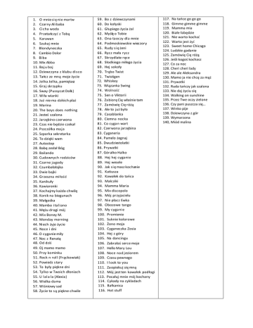 1. O mnie s i ę ni e martw 2. Czarny Al i baba 3. Ci cha woda 4. Przetaoczyć z Tobą 5. Karawan 6. Szukaj mnie 7. Blondyneczka 8. Cambio Dolor 9. Bi ba 10. Mix Abba 11. Ba j u ba j 12. Dziewczyna z klubu di s co 13. Taocz ze mną moje życie 14. Jol ka Jol ka , pamiętasz 15. Gra j skrzypku 16. Sway (Pussycat Dolls ) 17. Wiła wianki 18. Już nie ma dzikich plaż 19. Marina 20. The boys does nothing 21. Jesteś szalona 22. Jarzębino czerwona 23. Czas nie będzie czekał 24. Pszczółka ma j a 25. Szparka sekretarka 26. To dzięki wam 27. Autostop 28. Babę zesłał Bóg 29. Bailando 30. Cudownych rodziców 31. Czarne j a gody 32. Czumbałałajka 33. Dwie bajki 34. Grzeszna mi łoś d 35. Kanikuły 36. Kawiarenki 37. Kochajmy każda chwilę 38. Konik na biegunach 39. Małgośka 40. Mambo i ta l i ano 41. Mężu drogi mój 42. Mi x Boney M. 43. Monday morning 44. Ni ech żyje życie 45. Noce i dni 46. O cyga nie miły 47. Noc z Renatą 48. Od dziś 49. Oj mamo mamo 50. Przy kominku 51. Rock n rol l (Frąckowiak) 52. Powiedz s tary 53. To były piękne dni 54. Tyl ko w Twoich dłoniach 55. U l a l a l a (Alexia ) 56. Wielka da ma 57. Wiśniowy sad 58. Życie to s ą piękne chwile 59. Bo z dziewczynami 60. Do kołyski 61. Głupiego życia żal 62. Myślę o Tobie 63. Ona ta oczy dl a mnie 64. Podmoskiewskie wieczory 65. Rudy s i ę żeni 66. Rycz mała rycz 67. Skrzydlate ręce 68. Słodkiego miłego życia 69. Hej sokoły 70. Trąbo Twist 71. Twistigen 72. Whiskey 73. Wiązanka Swing 74. Wolność 75. Sen o Viktorii 76. Za biorę Cię właśnie tam 77. Za mówię Cię różą 78. Ale to już było 79. Casablanka 80. Ciemna nocka 81. Co cyga n wart 82. Czerwona jarzębina 83. Cyganeria 84. Pamelo żegnaj 85. Dwudziestolatki 86. Prywatki 87. Góralko Halko 88. Hej hej cyga ni e 89. Hej wesele 90. Jak s i ę masz kochanie 91. Katiusza 92. Kawałek do taoca 93. Malcziki 94. Mamma Maria 95. Mix discopolo 96. Mój przyjacielu 97. Ni e płacz Ewka 98. Obozowe tango 99. My cyga ni e 100. Promienie 101. Suknie kolorowe 102. Żono moja 103. Cyganeczka Zosia 104. Hej z góry 105. Na dancingu 106. Zabrałaś serce moje 107. Hello Mary Lou 108. Noce na d j eziorem 109. Czasu pewnego 110. I l ook to you 111. Za opiekuj się mną 112. Mój jest ten kawałek podłogi 113. Pocałuj mnie mój kochany 114. Cykady na cykladach 115. Bałkanica 116. Hot stuff 117. Na taoce go go go 118. Gimme gimme gimme 119. Mamma mia 120. Białe łabędzie 121. Nie warto kochać 122. Warto jest żyć 123. Sweet home Chicago 124. Ludzkie gadanie 125. Zamówię Cię różą 126. Jeśli kogoś kochasz 127. Co za noc 128. Cheri cheri lady 129. Ale ale Aleksandra 130. Mamo ja nie chcę za mąż 131. Prywatki 132. Ruda taoczy jak szalona 133. Nie daj życiu się 134. Walking on sunshine 135. Przez Twe oczy zielone 136. Czy pani puszcza się… 137. Winko pije 138. Dziewczyna z gór 139. Wymarzona 140, Miód malina