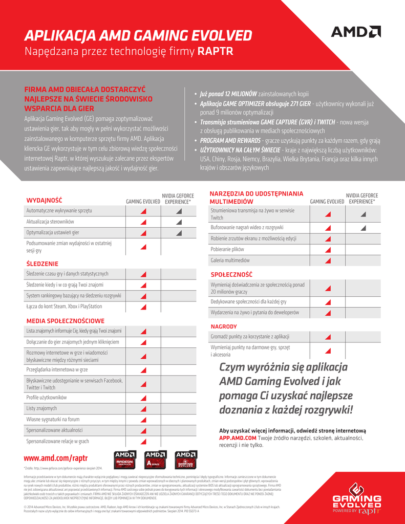 APLIKACJA AMD GAMING EVOLVED Napędzana przez technologię firmy RAPTR FIRMA AMD OBIECAŁA DOSTARCZYĆ NAJLEPSZE NA ŚWIECIE ŚRODOWISKO WSPARCIA DLA GIER Aplikacja Gaming Evolved (GE) pomaga zoptymalizować ustawienia gier, tak aby mogły w pełni wykorzystać możliwości zainstalowanego w komputerze sprzętu firmy AMD. Aplikacja kliencka GE wykorzystuje w tym celu zbiorową wiedzę społeczności internetowej Raptr, w której wyszukuje zalecane przez ekspertów ustawienia zapewniające najlepszą jakość i wydajność gier. WYDAJNOŚĆ Automatyczne wykrywanie sprzętu Aktualizacja sterowników Optymalizacja ustawień gier Podsumowanie zmian wydajności w ostatniej sesji gry NVIDIA GEFORCE GAMING EVOLVED EXPERIENCE* • Już ponad 12 MILIONÓW zainstalowanych kopii • Aplikacja GAME OPTIMIZER obsługuje 271 GIER - użytkownicy wykonali już ponad 9 milionów optymalizacji • Transmisja strumieniowa GAME CAPTURE (GVR) i TWITCH - nowa wersja z obsługą publikowania w mediach społecznościowych • PROGRAM AMD REWARDS - gracze uzyskują punkty za każdym razem, gdy grają • UŻYTKOWNICY NA CAŁYM ŚWIECIE - kraje z największą liczbą użytkowników: USA, Chiny, Rosja, Niemcy, Brazylia, Wielka Brytania, Francja oraz kilka innych krajów i obszarów językowych NARZĘDZIA DO UDOSTĘPNIANIA MULTIMEDIÓW Strumieniowa transmisja na żywo w serwisie Twitch Buforowanie nagrań wideo z rozgrywki Robienie zrzutów ekranu z możliwością edycji Pobieranie plików ŚLEDZENIE Galeria multimediów Śledzenie czasu gry i danych statystycznych SPOŁECZNOŚĆ Śledzenie kiedy i w co grają Twoi znajomi Wymieniaj doświadczenia ze społecznością ponad 20 milionów graczy System rankingowy bazujący na śledzeniu rozgrywki Łącza do kont Steam, Xbox i PlayStation MEDIA SPOŁECZNOŚCIOWE Lista znajomych informuje Cię, kiedy grają Twoi znajomi Dołączanie do gier znajomych jednym kliknięciem Rozmowy internetowe w grze i wiadomości błyskawiczne między różnymi sieciami Przeglądarka internetowa w grze Błyskawiczne udostępnianie w serwisach Facebook, Twitter i Twitch Profile użytkowników Listy znajomych Własne sygnaturki na forum Spersonalizowane aktualności Spersonalizowane relacje w grach NVIDIA GEFORCE GAMING EVOLVED EXPERIENCE* Dedykowane społeczności dla każdej gry Wydarzenia na żywo i pytania do deweloperów NAGRODY Gromadź punkty za korzystanie z aplikacji Wymieniaj punkty na darmowe gry, sprzęt i akcesoria Czym wyróżnia się aplikacja AMD Gaming Evolved i jak pomaga Ci uzyskać najlepsze doznania z każdej rozgrywki! Aby uzyskać więcej informacji, odwiedź stronę internetową APP.AMD.COM Twoje źródło narzędzi, szkoleń, aktualności, recenzji i nie tylko. www.amd.com/raptr *Źródło: http://www.geforce.com/geforce-experience sierpień 2014. Informacje przedstawione w tym dokumencie mają charakter wyłącznie poglądowy i mogą zawierać nieprecyzyjne sformułowania techniczne, pominięcia i błędy typograficzne. Informacje zamieszczone w tym dokumencie mogą ulec zmianie lub okazać się nieprecyzyjne z różnych przyczyn, w tym między innymi z powodu zmian wprowadzonych w obecnych i planowanych produktach, zmian wersji podzespołów i płyt głównych, wprowadzenia na rynek nowych modeli i/lub produktów, różnic między produktami oferowanymi przez różnych producentów, zmian w oprogramowaniu, aktualizacji systemów BIOS lub aktualizacji oprogramowania sprzętowego. Firma AMD nie jest zobowiązana aktualizować ani poprawiać przedstawionych informacji. Firma AMD zastrzega sobie jednak prawo do korygowania tych informacji i okresowego modyfikowania zawartości dokumentu bez powiadamiania jakichkolwiek osób trzecich o takich poprawkach i zmianach. FIRMA AMD NIE SKŁADA ŻADNYCH OŚWIADCZEŃ ANI NIE UDZIELA ŻADNYCH GWARANCJI DOTYCZĄCYCH TREŚCI TEGO DOKUMENTU ORAZ NIE PONOSI ŻADNEJ ODPOWIEDZIALNOŚCI ZA JAKIEKOLWIEK NIEPRECYZYJNE INFORMACJE, BŁĘDY LUB POMINIĘCIA W TYM DOKUMENCIE. © 2014 Advanced Micro Devices, Inc. Wszelkie prawa zastrzeżone. AMD, Radeon, logo AMD Arrow i ich kombinacje są znakami towarowymi firmy Advanced Micro Devices, Inc. w Stanach Zjednoczonych i/lub w innych krajach. Pozostałych nazw użyto wyłącznie do celów informacyjnych i mogą one być znakami towarowymi odpowiednich podmiotów. Sierpień 2014. PID 55073-A