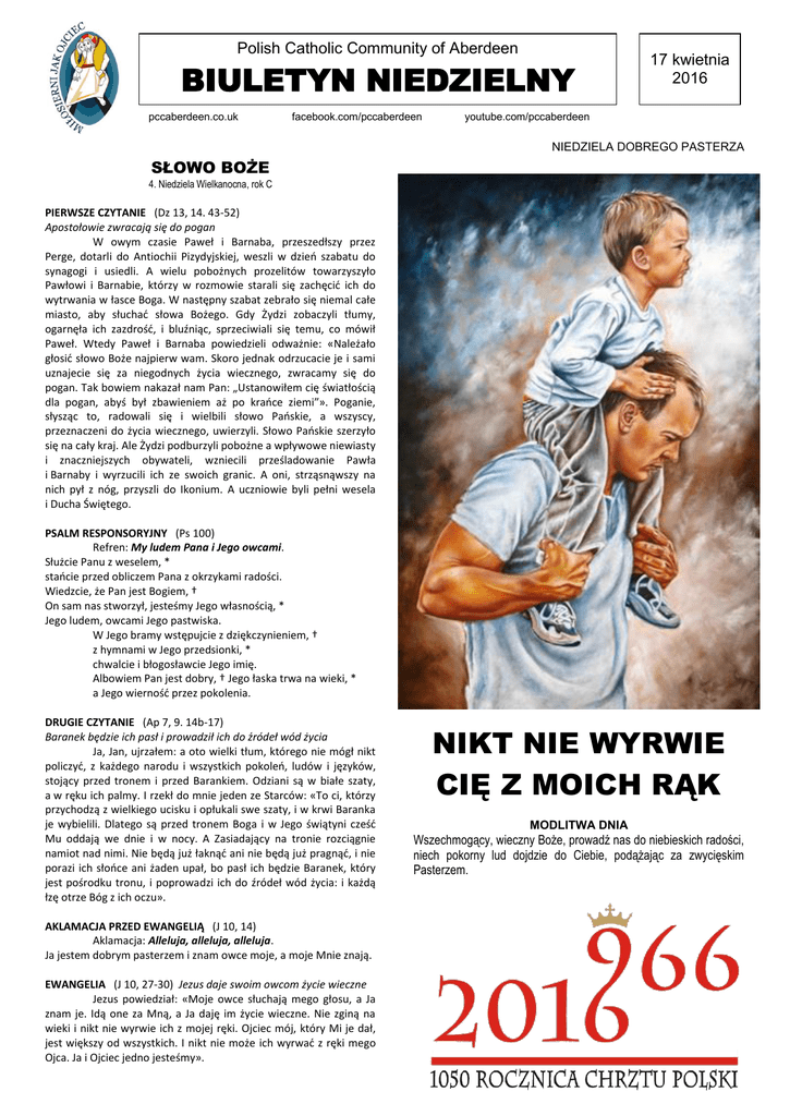 Polish Catholic Community of Aberdeen BIULETYN NIEDZIELNY pccaberdeen.co.uk facebook.com/pccaberdeen 17 kwietnia 2016 youtube.com/pccaberdeen NIEDZIELA DOBREGO PASTERZA SŁOWO BOŻE 4. Niedziela Wielkanocna, rok C PIERWSZE CZYTANIE (Dz 13, 14. 43-52) Apostołowie zwracają się do pogan W owym czasie Paweł i Barnaba, przeszedłszy przez Perge, dotarli do Antiochii Pizydyjskiej, weszli w dzień szabatu do synagogi i usiedli. A wielu pobożnych prozelitów towarzyszyło Pawłowi i Barnabie, którzy w rozmowie starali się zachęcić ich do wytrwania w łasce Boga. W następny szabat zebrało się niemal całe miasto, aby słuchać słowa Bożego. Gdy Żydzi zobaczyli tłumy, ogarnęła ich zazdrość, i bluźniąc, sprzeciwiali się temu, co mówił Paweł. Wtedy Paweł i Barnaba powiedzieli odważnie: «Należało głosić słowo Boże najpierw wam. Skoro jednak odrzucacie je i sami uznajecie się za niegodnych życia wiecznego, zwracamy się do pogan. Tak bowiem nakazał nam Pan: „Ustanowiłem cię światłością dla pogan, abyś był zbawieniem aż po krańce ziemi”». Poganie, słysząc to, radowali się i wielbili słowo Pańskie, a wszyscy, przeznaczeni do życia wiecznego, uwierzyli. Słowo Pańskie szerzyło się na cały kraj. Ale Żydzi podburzyli pobożne a wpływowe niewiasty i znaczniejszych obywateli, wzniecili prześladowanie Pawła i Barnaby i wyrzucili ich ze swoich granic. A oni, strząsnąwszy na nich pył z nóg, przyszli do Ikonium. A uczniowie byli pełni wesela i Ducha Świętego. PSALM RESPONSORYJNY (Ps 100) Refren: My ludem Pana i Jego owcami. Służcie Panu z weselem, * stańcie przed obliczem Pana z okrzykami radości. Wiedzcie, że Pan jest Bogiem, † On sam nas stworzył, jesteśmy Jego własnością, * Jego ludem, owcami Jego pastwiska. W Jego bramy wstępujcie z dziękczynieniem, † z hymnami w Jego przedsionki, * chwalcie i błogosławcie Jego imię. Albowiem Pan jest dobry, † Jego łaska trwa na wieki, * a Jego wierność przez pokolenia. DRUGIE CZYTANIE (Ap 7, 9. 14b-17) Baranek będzie ich pasł i prowadził ich do źródeł wód życia Ja, Jan, ujrzałem: a oto wielki tłum, którego nie mógł nikt policzyć, z każdego narodu i wszystkich pokoleń, ludów i języków, stojący przed tronem i przed Barankiem. Odziani są w białe szaty, a w ręku ich palmy. I rzekł do mnie jeden ze Starców: «To ci, którzy przychodzą z wielkiego ucisku i opłukali swe szaty, i w krwi Baranka je wybielili. Dlatego są przed tronem Boga i w Jego świątyni cześć Mu oddają we dnie i w nocy. A Zasiadający na tronie rozciągnie namiot nad nimi. Nie będą już łaknąć ani nie będą już pragnąć, i nie porazi ich słońce ani żaden upał, bo pasł ich będzie Baranek, który jest pośrodku tronu, i poprowadzi ich do źródeł wód życia: i każdą łzę otrze Bóg z ich oczu». AKLAMACJA PRZED EWANGELIĄ (J 10, 14) Aklamacja: Alleluja, alleluja, alleluja. Ja jestem dobrym pasterzem i znam owce moje, a moje Mnie znają. EWANGELIA (J 10, 27-30) Jezus daje swoim owcom życie wieczne Jezus powiedział: «Moje owce słuchają mego głosu, a Ja znam je. Idą one za Mną, a Ja daję im życie wieczne. Nie zginą na wieki i nikt nie wyrwie ich z mojej ręki. Ojciec mój, który Mi je dał, jest większy od wszystkich. I nikt nie może ich wyrwać z ręki mego Ojca. Ja i Ojciec jedno jesteśmy». NIKT NIE WYRWIE CIĘ Z MOICH RĄK MODLITWA DNIA Wszechmogący, wieczny Boże, prowadź nas do niebieskich radości, niech pokorny lud dojdzie do Ciebie, podążając za zwycięskim Pasterzem. BIAŁO-CZERWONI w Aberdeen: 1050. rocznica CHRZTU POLSKI. Kąpiel w Morzu Północnym, czas zanurzenia 10:50. Gratulujemy odważnym! OPANOWANIE, WOLNOŚĆ, RADOŚĆ Słyszałem kiedyś świadectwo mężczyzny wyzwolonego z nałogu samogwałtu: „Ludzie, nie mówcie, że brak działań seksualnych to brak atrakcji, radości. Nie ma większej radości od poczucia wolności! Ja wreszcie, po 20 latach opętania, nie muszę działać. Mogę zacząć normalnie żyć i… kochać”. Tylko człowiek wolny, panujący nad bodźcami zewnętrznymi i pobudzeniami wewnętrznymi, zdolny jest do miłości. Tylko będąc panem siebie, może się w miłości ofiarować, aż do śmierci, drugiemu człowiekowi lub wprost Bogu. Może uczciwie obiecać i zrealizować dozgonną wierność, może żyć w czystości. O radości płynącej z wolności nie mają pojęcia samozwańczy eksperci od seksu. Zachwalając „spontaniczność” (bezrozumność i bezwolność) działań oraz „wolną miłość”, w gruncie rzeczy popychają ludzi w nałóg uzależnienia od działań seksualnych. Każdy nałóg, odbierając wolność, unieszczęśliwia. Jacek Pulikowski, Warto zadbać o „te sprawy”. Głęboka jest radość z wolności wewnętrznej W SPRAWIE ABORCJI Zapytano Jezusa: „Czy wolno zabić dziecko w niektórych przypadkach?”. On odpowiedział: „Czy nie czytaliście, że na początku Bóg stworzył mężczyznę i kobietę i rzekł do nich: ‘Bądźcie płodni i rozmnażajcie się’? Współżycie seksualne jest po to, żeby narodził się człowiek. Jeśli więc ktoś nie jest gotowy urodzić dziecka, to nie powinien współżyć”. Odparli Mu: „Papież i biskupi jednak pozwolili na kompromis aborcyjny”. Odpowiedział Jezus: „Przez wzgląd na zatwardziałość serc Waszych powstał kompromis, ale od początku tak nie było.” Wtedy nawet uczniowie zaczęli kontestować: „Jeśli tak ma się sprawa ze współżyciem, to nie opłaca się współżyć”. Na to Jezus odpowiedział: „Nie wszyscy to pojmują, ale ci, którym to jest dane. Niektórzy nie powinni współżyć, bo druga strona tego nie chce, inni dlatego, że nie dojrzeli do bycia ojcem lub matką, a jeszcze inni ze względu na Królestwo niebieskie. Kto może pojąć niech pojmuje”. Ks. Wojciech Węgrzyniak, Gość Niedzielny REKOLEKCJE IGNACJAŃSKIE W ŻYCIU CODZIENNYM Czas głębszej przyjaźni ze Słowem Bożym. Cz