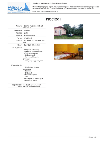 Weekend na Mazurach, Domki letniskowe Mazury to przepiękny region. Szukając noclegu na Mazurach koniecznie skorzystaj z naszej witryny Mazury noclegi i czartery jachtów. Domki letniskowe, restauracje, atrakcje! www.www.weekendnamazurach.pl Noclegi Nazwa: Kategoria: Domki Ruciane Nida ul. Wiejska 8 Noclegi Powiat: piski Miasto: Ruciane Nida Adres: Telefon: Ceny: Wiejska 8 87 4231 756 lub 506 562 577 Od:40zł - Do:130zł Cel wyjazdu: - Wyjazd rodzinny - Wyjazd ze znajomymi - Tylko we dwoje - Odpoczynek - W poszukiwaniu przygód - Aktywny wypoczynek Wyposażenie: - Kuchnia / Aneks kuchenny - Parking - Internet - Łazienka / WC - TV - Akceptacja zwierzęta - Balkon / Taras Współrzędne 53.63967245715558, GPS: 21.54145001904908 strona 1 / 1 Powered by TCPDF (www.tcpdf.org)