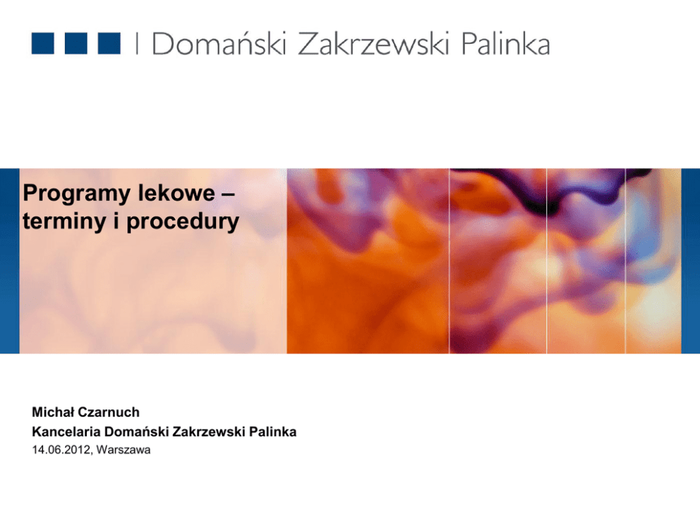 Programy lekowe – terminy i procedury Michał Czarnuch Kancelaria Domański Zakrzewski Palinka 14.06.2012, Warszawa Program lekowy – główne założenia Nowe kategorie dostępności refundacyjnej wprowadzone przez Ustawę refundacyjną m.in.: lek, środek spożywczy specjalnego przeznaczenia żywieniowego stosowany w ramach programu lekowego; lek stosowany w ramach chemioterapii (i) w całym zakresie zarejestrowanych wskazań i przeznaczeń (ii) we wskazaniu określonym stanem klinicznym; Definicja programu lekowego: program zdrowotny w rozumieniu przepisów ustawy z dnia 27 sierpnia 2004 r. o świadczeniach opieki zdrowotnej finansowanych ze środków publicznych obejmujący technologię lekową, w której substancja czynna nie jest składową kosztową innych świadczeń gwarantowanych lub środek spożywczy specjalnego przeznaczenia żywieniowego, który nie jest składową kosztową innych świadczeń gwarantowanych Program lekowy – postępowanie o objęcie refundacją Wnioskodawca: podmiot odpowiedzialny przedstawiciel podmiotu odpowiedzialnego podmiot uprawniony do importu równoległego Wyłącznie podmioty wskazane powyżej, nie może być wnioskodawcą np. konsultant medyczny. Terminy: 180 dni możliwość zawieszenia konieczność uzupełnienia danych + zawieszenie do czasu uzgodnienia treści programu lekowego pomiędzy wnioskodawcą a MZ. Uzgodnienia nie dłużej niż 60 dni; brak – MZ wydaje decyzję odmowną. Wnioskodawca może przed złożeniem wniosku zwrócić się o wstępną opinię nt. projektu programu lekowego Objęcie refundacją w formie decyzji administracyjnej + umieszczenie w obwieszczeniu. Program lekowy – ceny urzędowe maksymalne Cena maksymalna zakupu produktów, które posiadają urzędową cenę zbytu nadaną decyzją administracyjną. (i) refundacja apteczna, (ii) programy lekowe; (iii) chemioterapia od podmiotu urzędowa cena zbytu produktu stanowiącego prowadzącego obrót podstawę limitu powiększona o marżę nie hurtowy wyższą niż urzędowa marża hurtowa od podmiotu innego urzędowa cena zbytu produktu stanowiącego niż prowadzący obrót podstawę limitu hurtowy Komunikat MZ z 16 marca 2012 r. „(…) należy uznać, że rozstrzygającym w kwestii maksymalnej ceny po jakiej szpital może zakupić lek jest ust. 1 art. 9 ustawy o refundacji, natomiast ust. 2 tego przepisu opisuje sytuację jedynie w przypadku, gdy lek z daną substancją czynną stanowi podstawę limitu lub też koszt jednego DDD leku jest niższy niż koszt DDD leku stanowiącego podstawę limitu. W przypadku, gdy lek będący przedmiotem zakupu posiada inną substancję czynną niż lek stanowiący podstawę limitu w danej grupie limitowej lub limit jest ustalony na wyższej dawce leku, niż ta która ma być przedmiotem zakupu[wyróżnienie – M.C.], cena takiego leku powinna zostać określona w oparciu o przepis art. 9 ust. 1 ustawy o refundacji. Powyższe oznacza, iż cena takiego leku jedynie nie może być wyższa niż urzędowa cena zbytu powiększona o marżę nie wyższą niż urzędowa marża hurtowa[wyróżnienie – M.C.]. ” Sposób liczenia ceny maksymalnej Zarządzenie NFZ Sposób liczenia ceny maksymalnej Zarządzenie NFZ Powstaje rozbieżność pomiędzy sposobem określenia ceny maksymalnej w oparciu o DDD a sposobem określenia jednostki finansowania przez NFZ - mg. Świadczeniodawcy mogą mieć problemy w przeliczaniu poszczególnych wartości. Zmieniony system rozliczeń ma być gotowy pod względem technicznym przed 30 czerwca 2012 r. NFZ przeprowadzi w lipcu 2012 serię szkoleń dla świadczeniodawców w zakresie korzystania z nowego systemu rozliczeń. Prezes NFZ zasugerował także konieczność przeprowadzenia przez poszczególne firmy działań edukacyjnych wśród świadczeniodawców co do sposobu rozliczania poszczególnych leków w programach (żródło spotkanie z dnia 21 maja 2012 r.) Sposób liczenia ceny maksymalnej Zarządzenie NFZ Co w przypadku sprzeczności pomiędzy ceną maksymalną wynikająca z Ustawy – (i) według interpretacji literalnej, lub (ii) zgodnej z komunikatem a ceną wynikającą z zarządzenia NFZ. Zgodnie z hierarchią źródeł prawa Ustawa ma pierwszeństwo przez Zarządzeniem. W przypadku ewentualnego sporu można się powoływać na przepisy Ustawy refundacyjnej. Program lekowy – ceny urzędowe maksymalne Nowy system refundacji został tak skonstruowany, aby w chemioterapii i programach lekowych finansowane były wyłącznie leki z ceną urzędową. Lek nie posiadający ceny urzędowej, co prawda może być zakupiony przez świadczeniodawcę, ale koszt leku nie zostanie „jednostce” zrefundowany. Projekt obwieszczenia w sprawie wykazu refundowanych leków, środków spożywczych specjalnego przeznaczenia żywieniowego oraz wyrobów medycznych, które ma obowiązywać od 1 maja 2012 r. zawiera już programy lekowe. Terminy wejścia w życie decyzji w zakresie chemioterapii i programów lekowych: 1 stycznia 2012 r. 1 lipca 2012 r. Przepisy przejściowe dla finansowania niektórych świadczeń (1) Ustawa refundacyjna przewiduje okres przejściowy dla umów szpitali z NFZ dotyczących finansowania wybranych świadczeń: świadczenia opieki zdrowotnej z zakresu programów zdrowotnych w części dotyczącej terapeutycznych programów zdrowotnych świadczenia opieki zdrowotnej z zakresu leczenia szpitalnego i ambulatoryjnej opieki specjalistycznej w części dotyczącej leków stosowanych w chemioterapii Warunek: zawarcie umowy przed 1 stycznia 2012 r! Realizacja powyższych świadczeń na dotychczasowych zasadach nie dłużej niż do 30 czerwca 2012 r. Przepisy przejściowe dla finansowania niektórych świadczeń (2) Okresy przejściowe zostały przewidziane także dla chemioterapii niestandardowej. Świadczenia wchodzące w jej zakres, realizowane przed 1 stycznia 2012 r. będą realizowane na dotychczasowych zasadach, nie dłużej jednak niż do 31 grudnia 2013 r. Szpitale mogą składać wnioski d