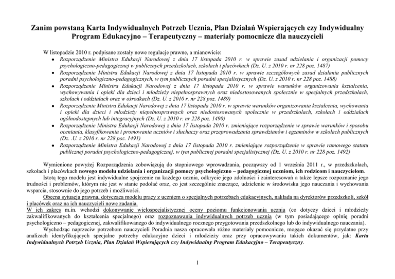 Zanim powstaną Karta Indywidualnych Potrzeb Ucznia, Plan Działań Wspierających czy Indywidualny Program Edukacyjno – Terapeutyczny – materiały pomocnicze dla nauczycieli W listopadzie 2010 r. podpisane zostały nowe regulacje prawne, a mianowicie: Rozporządzenie Ministra Edukacji Narodowej z dnia 17 listopada 2010 r. w sprawie zasad udzielania i organizacji pomocy psychologiczno-pedagogicznej w publicznych przedszkolach, szkołach i placówkach (Dz. U. z 2010 r. nr 228 poz. 1487) Rozporządzenie Ministra Edukacji Narodowej z dnia 17 listopada 2010 r. w sprawie szczegółowych zasad działania publicznych poradni psychologiczno-pedagogicznych, w tym publicznych poradni specjalistycznych (Dz. U. z 2010 r. nr 228 poz. 1488) Rozporządzenie Ministra Edukacji Narodowej z dnia 17 listopada 2010 r. w sprawie warunków organizowania kształcenia, wychowywania i opieki dla dzieci i młodzieży niepełnosprawnych oraz niedostosowanych społecznie w specjalnych przedszkolach, szkołach i oddziałach oraz w ośrodkach (Dz. U. z 2010 r. nr 228 poz. 1489) Rozporządzenie Ministra Edukacji Narodowej z dnia 17 listopada 2010 r. w sprawie warunków organizowania kształcenia, wychowania i opieki dla dzieci i młodzieży niepełnosprawnych oraz niedostosowanych społecznie w przedszkolach, szkołach i oddziałach ogólnodostępnych lub integracyjnych (Dz. U. z 2010 r. nr 228 poz. 1490) Rozporządzenie Ministra Edukacji Narodowej z dnia 17 listopada 2010 r. zmieniające rozporządzenie w sprawie warunków i sposobu oceniania, klasyfikowania i promowania uczniów i słuchaczy oraz przeprowadzania sprawdzianów i egzaminów w szkołach publicznych (Dz. .U. z 2010 r. nr 228 poz. 1491) Rozporządzenie Ministra Edukacji Narodowej z dnia 17 listopada 2010 r. zmieniające rozporządzenie w sprawie ramowego statutu publicznej poradni psychologiczno-pedagogicznej, w tym publicznej poradni specjalistycznej (Dz. U. z 2010 r. nr 228 poz. 1492) Wymienione powyżej Rozporządzenia zobowiązują do stopniowego wprowadzania, począwszy od 1 września 2011 r., w przedszkolach, szkołach i placówkach nowego modelu udzielania i organizacji pomocy psychologiczno – pedagogicznej uczniom, ich rodzicom i nauczycielom. Istotą tego modelu jest indywidualne spojrzenie na każdego ucznia, odkrycie jego zdolności i zainteresowań a także lepsze rozpoznanie jego trudności i problemów, którym nie jest w stanie podołać oraz, co jest szczególnie znaczące, udzielenie w środowisku jego nauczania i wychowania wsparcia, stosownie do jego potrzeb i możliwości. Obecna sytuacja prawna, dotycząca modelu pracy z uczniem o specjalnych potrzebach edukacyjnych, nakłada na dyrektorów przedszkoli, szkół i placówek oraz na ich nauczycieli nowe zadania. W ich zakres m.in. wchodzi dokonywanie wielospecjalistycznej oceny poziomu funkcjonowania ucznia (co dotyczy dzieci i młodzieży zakwalifikowanych do kształcenia specjalnego) oraz rozpoznawania indywidualnych potrzeb ucznia (w tym posiadającego opinię poradni psychologiczno – pedagogicznej, zakwalifikowanego do indywidualnego rocznego przygotowania przedszkolnego lub do indywidualnego nauczania). Wychodząc naprzeciw potrzebom nauczycieli Poradnia nasza opracowała różne materiały pomocnicze, mogące okazać się przydatne przy analizach identyfikujących specjalne potrzeby edukacyjne dzieci i młodzieży oraz przy opracowywaniu takich dokumentów, jak: Karta Indywidualnych Potrzeb Ucznia, Plan Działań Wspierających czy Indywidualny Program Edukacyjno – Terapeutyczny. 1 I. Określenie indywidualnych potrzeb dzieci i młodzieży wymaga rozpoznania ich możliwości psychofizycznych (w tym np. indywidualnych uzdolnień albo trudności edukacyjnych). Wyniki rozpoznania pozwalają na sformułowanie dla ucznia Planu Działań Wspierających. Owo rozpoznanie może się dokonywać w trzech obszarach, tj. warunki uczenia się, przebieg uczenia się, wyniki procesu uczenia się. Obrazuje to poniższe zestawienie. Obszary rozpoznawania indywidualnych potrzeb ucznia 1. Warunki uczenia się – czynniki wpływające na proces uczenia się Wewnętrzne (emocjonalno-motywacyjne, poznawcze) Zewnętrzne (środowiskowe) motywacja do uczenia się rodzinne kontrola emocjonalna, radzenie sobie w sytuacjach trudnych zainteresowania spostrzeganie uwaga pamięć rówieśnicze myślenie mowa/komunikacja czytanie 2 pisanie szkolne liczenie wiadomości i umiejętności szkolne 2. Przebieg uczenia się – proces nabywania wiadomości i umiejętności szkolnych Dynamika działań ucznia, w jaki sposób je prowadzi, jak realizuje swoje zadania, jakie decyzje podejmuje w związku z uczestniczeniem w procesie edukacyjnym w kontekście: zaangażowania procesów emocjonalno-motywacyjnych zaangażowania procesów poznawczych charakter funkcjonowania ucznia w środowisku rodzinnym, rówieśniczym, szkolnym 3. Wyniki procesu uczenia się – osiągnięcia edukacyjne techniki szkolne (czytanie, pisanie, liczenie) wiadomości i umiejętności pożądane cechy osobowe i zachowania społeczne, zainteresowania, aspiracje, wartości, postawy 3 Uwzględniając w/w obszary rozpoznania pedagodzy i psycholodzy naszej Poradni opracowali Arkusz pomocniczy do rozpoznawania indywidualnych potrzeb ucznia, który może okazać się pomocny w postępowaniu diagnostycznym nauczycieli. Arkusz zawiera przykładowe wskaźniki pożądanego i niepożądanego funkcjonowania ucznia w odniesieniu do poszczególnych czynników konkretnych obszarów. Prezentujemy go poniżej. ARKUSZ POMOCNICZY DO ROZPOZNAWANIA INDYWIDUALNYCH POTRZEB UCZNIA IMIĘ I NAZWISKO UCZNIA…………………………………………….. SZKOŁA…………………………………………………………………… KLASA……………………………….. DATA OPRACOWANIA ARKUSZA........................................................ OBSZARY 1. WARUNKI UCZENIA SIĘ – CZYNNIKI WPŁYWAJĄCE NA PROCES UCZENIA SIĘ Czynniki wewnętrzne 