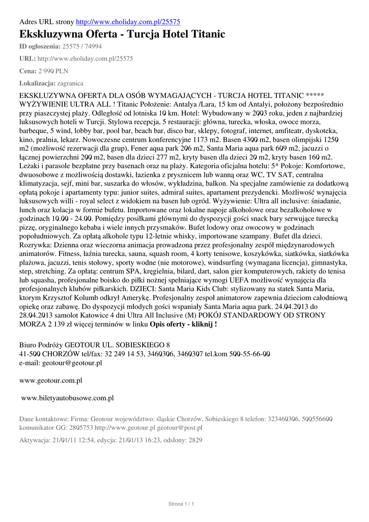 Adres URL strony http://www.eholiday.com.pl/25575 Ekskluzywna Oferta - Turcja Hotel Titanic ID ogłoszenia: 25575 / 74994 URL: http://www.eholiday.com.pl/25575 Cena: 2 990 PLN Lokalizacja: zagranica EKSKLUZYWNA OFERTA DLA OSÓB WYMAGAJĄCYCH - TURCJA HOTEL TITANIC ***** WYŻYWIENIE ULTRA ALL ! Titanic Położenie: Antalya /Lara, 15 km od Antalyi, położony bezpośrednio przy piaszczystej plaży. Odległość od lotniska 10 km. Hotel: Wybudowany w 2003 roku, jeden z najbardziej luksusowych hoteli w Turcji. Stylowa recepcja, 5 restauracji: główna, turecka, włoska, owoce morza, barbeque, 5 wind, lobby bar, pool bar, beach bar, disco bar, sklepy, fotograf, internet, amfiteatr, dyskoteka, kino, pralnia, lekarz. Nowoczesne centrum konferencyjne 1173 m2. Basen 4300 m2, basen olimpijski 1250 m2 (możliwość rezerwacji dla grup), Fener aqua park 206 m2, Santa Maria aqua park 609 m2, jacuzzi o łącznej powierzchni 200 m2, basen dla dzieci 277 m2, kryty basen dla dzieci 20 m2, kryty basen 160 m2. Leżaki i parasole bezpłatne przy basenach oraz na plaży. Kategoria oficjalna hotelu: 5* Pokoje: Komfortowe, dwuosobowe z możliwością dostawki, łazienka z prysznicem lub wanną oraz WC, TV SAT, centralna klimatyzacja, sejf, mini bar, suszarka do włosów, wykładzina, balkon. Na specjalne zamówienie za dodatkową opłatą pokoje i apartamenty typu: junior suites, admiral suites, apartament prezydencki. Możliwość wynajęcia luksusowych willi - royal select z widokiem na basen lub ogród. Wyżywienie: Ultra all inclusive: śniadanie, lunch oraz kolacja w formie bufetu. Importowane oraz lokalne napoje alkoholowe oraz bezalkoholowe w godzinach 10.00 - 24.00. Pomiędzy posiłkami głównymi do dyspozycji gości snack bary serwujące turecką pizzę, oryginalnego kebaba i wiele innych przysmaków. Bufet lodowy oraz owocowy w godzinach popołudniowych. Za opłatą alkohole typu 12-letnie whisky, importowane szampany. Bufet dla dzieci. Rozrywka: Dzienna oraz wieczorna animacja prowadzona przez profesjonalny zespół międzynarodowych animatorów. Fitness, łaźnia turecka, sauna, squash room, 4 korty tenisowe, koszykówka, siatkówka, siatkówka plażowa, jacuzzi, tenis stołowy, sporty wodne (nie motorowe), windsurfing (wymagana licencja), gimnastyka, step, stretching. Za opłatą: centrum SPA, kręgielnia, bilard, dart, salon gier komputerowych, rakiety do tenisa lub squasha, profesjonalne boisko do piłki nożnej spełniające wymogi UEFA możliwość wynajęcia dla profesjonalnych klubów piłkarskich. DZIECI: Santa Maria Kids Club: stylizowany na statek Santa Maria, ktorym Krzysztof Kolumb odkrył Amerykę. Profesjonalny zespoł animatorow zapewnia dzieciom całodniową opiekę oraz zabawę. Do dyspozycji młodych gości wspaniały Santa Maria aqua park. 24.04.2013 do 28.04.2013 samolot Katowice 4 dni Ultra All Inclusive (M) POKÓJ STANDARDOWY OD STRONY MORZA 2 139 zł więcej terminów w linku Opis oferty - kliknij ! Biuro Podróży GEOTOUR UL. SOBIESKIEGO 8 41-500 CHORZÓW tel/fax: 32 249 14 53, 3460306, 3460307 tel.kom 500-55-66-00 e-mail: [email protected] www.geotour.com.pl www.biletyautobusowe.com.pl Dane kontaktowe: Firma: Geotour województwo: śląskie Chorzów, Sobieskiego 8 telefon: 323460306, 500556600 komunikator GG: 2805753 http://www.geotour.pl [email protected] Aktywacja: 21/01/11 12:54, edycja: 21/01/13 16:23, odsłony: 2829 Strona 1 / 1