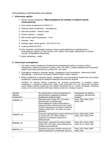 OPIS MODUŁU KSZTAŁCENIA (SYLABUS) I. Informacje ogólne 1. Nazwa modułu kształcenia Wprowadzenie do wiedzy o historii sztuki nowoczesnej 2. Kod modułu kształcenia 05-HSNO-23 3. Rodzaj modułu kształcenia – obowiązkowy 4. Kierunek studiów – historia sztuki 5. Poziom studiów – I stopień 6. Rok studiów (jeśli obowiązuje) – II rok 7. Semestr – letni 8. Rodzaje zajęć i liczba godzin - 60 h W 30 h Ćw. 9. Liczba punktów ECTS 6 10. Imię, nazwisko, tytuł/stopień naukowy, adres e-mail wykładowcy (wykładowców) / prowadzących zajęcia: dr Filip Lipiński, prof. UAM dr hab. Agata Jakubowska, dr Dorota Łuczak, dr Magdalena Radomska 11. Język wykładowy - polski II. Informacje szczegółowe 1. Cel (cele) modułu kształcenia: Dostarczenie podstawowej wiedzy za zakresu kultury artystycznej i sztuki powszechnej i polski w XIX i XX wieku, a także podstawowych kierunków badań nad sztuką powszechną i polską XIX i XX wieku. 2. Wymagania wstępne w zakresie wiedzy, umiejętności oraz kompetencji społecznych (jeśli obowiązują) – ukończone 3 semestry studiów historii sztuki I stopnia 3. Efekty kształcenia w zakresie wiedzy, umiejętności oraz kompetencji społecznych dla modułu kształcenia i odniesienie do efektów kształcenia dla kierunku studiów (UWAGA: nie dzielimy efektów kształcenia dla modułów (przedmiotów) na kategorie wiedzy, umiejętności i kompetencji społecznych; każdy moduł (przedmiot) nie musi obejmować wszystkich trzech kategorii efektów kształcenia; jeśli efektem kształcenia jest np. analiza wymagająca określonej wiedzy, to nie trzeba oddzielnie definiować efektów kształcenia w kategorii wiedzy) Symbol efektów kształcenia* HSNOPO_01 HSNOPO_02 HSNOPO_03 HSNOPO_04 1 Po zakończeniu modułu (przedmiotu) i potwierdzeniu osiągnięcia efektów kształcenia student potrafi: Periodyzować sztukę XIX i XX wieku. Wskazywać na odmienność poszczególnych części danej epoki w zakresie kultury artystycznej oraz sztuki, , a także wskazywać na różnice kulturowe między sztuką XIX i XX wieku a innymi epokami. Omawiać najważniejsze prądy artystyczne w sztuce XIX i XX wieku, także w szerszym kontekście kulturowym i historycznym Wymieniać i opisywać kluczowe dzieła sztuki XIX i XX wieku oraz poddawać je analizie porównawczej Omawiać kluczowe ośrodki artystyczne, szkoły artystyczne, środowiska, grupy, a Odniesienie do efektów kształcenia dla kierunku # studiów Hiszt_W07,Hiszt_W09 Hiszt_U09, Hiszt_W04,Hiszt_W09 Hiszt_U04, Hiszt_W15 Hiszt_W11,Hiszt_W06, Hiszt_W12, Hiszt_U06 Hiszt_W11,Hiszt_W09 Hiszt_U09 także wskazywać na wzajemne relacje. HSNOPO_05 Wskazywać na główne kierunki badań nad Hiszt_W08,Hiszt_W02 sztuką XIX i XX wieku, samodzielnie Hiszt_W07, Hiszt_U06, adaptować je w procesie interpretacji. Hiszt_K01, Hiszt_K05 UWAGA! Zaleca się, aby, w zależności od modułu, liczba efektów kształcenia zawierała się w przedziale: 5-10. 4. Treści kształcenia Nazwa modułu kształcenia: Symbol treści kształcenia* Opis treści kształcenia TK_01 Sztuka przedrewolucyjnej, rewolucyjnej i napoleońskiej Francji. TK_02 TK_03 Architektura klasycystyczna. Malarstwo pejzażowe w pierwszej połowie XIX wieku Wątki patriotyczne w sztuce polskiej od TK_04 1764 do 1863 Historyzm w XIX-wiecznej architekturze TK_05 TK_06 TK_07 TK_08 TK_09 Romantyczne malarstwo i rzeźba. Rzeźba II połowy XIX w. Kierunki i tendencje w malarstwie II poł. XIX wieku: realizm, impresjonizm, postimpresjonizm symbolizm, Charakterystyka architektury w najważniejszych ośrodkach secesji w Europie i w Polsce. Odniesienie do efektów # kształcenia modułu HSNOPO_01, HSNOPO_02, HSNOPO_03, HSNOPO_04, HSNOPO_05 HSNOPO_01, HSNOPO_02, HSNOPO_03, HSNOPO_04, HSNOPO_05 HSNOPO_01, HSNOPO_02, HSNOPO_03, HSNOPO_04, HSNOPO_05 HSNOPO_01, HSNOPO_02, HSNOPO_03, HSNOPO_04, HSNOPO_05 HSNOPO_01, HSNOPO_02, HSNOPO_03, HSNOPO_04, HSNOPO_05 HSNOPO_01, HSNOPO_02, HSNOPO_03, HSNOPO_04, HSNOPO_05 HSNOPO_01, HSNOPO_02, HSNOPO_03, HSNOPO_04, HSNOPO_05 HSNOPO_01, HSNOPO_02, HSNOPO_03, HSNOPO_04, HSNOPO_05 HSNOPO_01, HSNOPO_02, HSNOPO_03, HSNOPO_04, HSNOPO_05 TK_10 Malarstwo historyczne i realistyczne w Polsce TK_11 Sztuka a fotografia w II połowie XIX wieku HSNOPO_01, HSNOPO_02, 2 HSNOPO_01, HSNOPO_02, HSNOPO_03, HSNOPO_04, HSNOPO_05 HSNOPO_03, HSNOPO_04, HSNOPO_05 TK_12 TK_13 TK_14 Zagadnienie wystaw światowych HSNOPO_01, HSNOPO_02, HSNOPO_03, HSNOPO_04, HSNOPO_05 Modernizm polski na przełomie XIX i XX w HSNOPO_01, HSNOPO_02, HSNOPO_03, HSNOPO_04, HSNOPO_05 Awangarda początku XX wieku: fowizm, kubizm, futuryzm, ekspresjonizm HSNOPO_01, HSNOPO_02, HSNOPO_03, HSNOPO_04, HSNOPO_05 Dadaizm, konstruktywizm HSNOPO_01, HSNOPO_02, HSNOPO_03, HSNOPO_04, HSNOPO_05 TK_15 TK_16 TK_17 TK_18 TK_19 TK_20 TK_21 Modernistyczna architektura Surrealizm - światopogląd, charakterystyka nurtu i dynamika rozwoju Życie artystyczne w II RP (główne ugrupowania artystyczne, ważne wystawy, instytucje) Sztuka państw totalitarnych (III Rzesza, Włochy, ZSRS) Oblicza ciała w sztuce drugiej połowy XX wieku TK_22 Odmiany realizmu w drugiej połowie XX wieku Lata 80 i powrót malarstwa TK_24 HSNOPO_01, HSNOPO_02, HSNOPO_03, HSNOPO_04, HSNOPO_05 HSNOPO_01, HSNOPO_02, HSNOPO_03, HSNOPO_04, HSNOPO_05 HSNOPO_01, HSNOPO_02, HSNOPO_03, HSNOPO_04, HSNOPO_05 Sztuka po drugiej wojnie światowej w Stanach Zjednoczonych i Europie (1945- HSNOPO_01, HSNOPO_02, HSNOPO_03, HSNOPO_04, 1960). HSNOPO_05 Sztuka minimalnych środków – od minimalizmu do konceptualizmu TK_23 HSNOPO_01, HSNOPO_02, HSNOPO_03, HSNOPO_04, HSNOPO_05 HSNOPO_01, HSNOPO_02, HSNOPO_03, HSNOPO_04, HSNOPO_05 HSNOPO_01, HSNOPO_02, HSNOPO_03, HSNOPO_04, HSNOPO_05 HSNOPO_01, HSNOPO_02, HSNOPO_03, HSNOPO_04, HSNOPO_05 HSNOPO_01, HSNOPO_02, HSNOPO_03, HSNOPO_04, HSNOPO_05 Sztuka w służbie społecznej a sztuka w służbie kapitalizmu – lata dziewięćdziesiąte HSNOPO_01, HSNOPO_02, TK_25 3 HSNOPO_03, HSNOPO_04, HSNOPO_05 TK_26 Po
