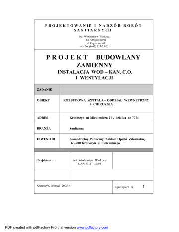 PROJEKTOWANIE I NADZÓR ROBÓT S A N I T A R N Y CH inż. Włodzimierz Warkocz 63-700 Krotoszyn ul. Ceglarska 40 tel./ fax (0-62) 725-75-05 P R O J E K T BUDOWLANY ZAMIENNY INSTALACJA WOD – KAN, C.O. I WENTYLACJI ZADANIE OBIEKT ROZBUDOWA SZPITALA – ODDZIAŁ WEWNĘTRZNY + CHIRURGIA ADRES Krotoszyn ul. Mickiewicza 21 , działka nr 777/1 BRANŻA Sanitarna INWESTOR Samodzielny Publiczny Zakład Opieki Zdrowotnej 63-700 Krotoszyn ul. Bolewskiego Projektant : inż. Włodzimierz Warkocz UAN 7342 – 37/93 Krotoszyn, listopad 2005 r. PDF created with pdfFactory Pro trial version www.pdffactory.com Egzemplarz nr 1 SPIS TREŚCI 1. Strona tytułowa str. nr 1 2. Spis treści str. nr 2 3. Opis techniczny str. nr 3 - 5 4. Informacja bioz str. nr 6 5. Obliczenia c.o. str. nr 7 - 13 4. Rzut parteru – Instalacja wod - kan rys. nr 1 5. Rzut piętra – Instalacja wod - kan rys. nr 2 6. Rzut parteru – Instalacja c.o. rys. nr 3 7. Rzut piętra – Instalacja c.o. rys. nr 4 8. Rzut parteru – Instalacja gazów medycznych rys. nr 5 9. Rzut piętra – Instalacja gazów medycznych rys. nr 6 10. Rozwinięcie instalacji wod – kan I - III rys. nr 7 11. Rozwinięcie instalacji wod – kan IV - V rys. nr 8 12. Rozwinięcie instalacji c.o. rys. nr 9 2 PDF created with pdfFactory Pro trial version www.pdffactory.com OPIS TECHNICZNY do projektu instalacji wod – kana, c.o., i wentylacji 1. Część ogólna : Opracowanie obejmuje projekt zamienny budowlany branży sanitarnej „Instalacji wodno - kanalizacyjnych, c.o. i wentylacji ” dla obiektu „Rozbudowa szpitala – oddział wewnętrzny + chirurgia” w Krotoszynie przy ulicy Mickiewicza 21, działka nr 777/1. W związku ze zmianą przeznaczenia i funkcji pomieszczeń oraz wykonaniem niektórych robót przy remoncie budynku szpitala niniejszy projekt stanowi nową wersję instalacji sanitarnych . Inwestor : Samodzielny Publiczny Zakład Opieki Zdrowotnej 63-700 Krotoszyn ul. Bolewskiego 2. 2.1. 2.2. 2.3. 2.4. 3. Podstawa opracowania : Zlecenie inwestora Projekt budowlany Przepisy Rozporządzenia Ministra Infrastruktury z dnia 12 kwietnia 2002 w sprawie warunków technicznych, jakim powinny odpowiadać budynki i ich usytuowanie (Dz.U. nr 75 poz. 690) Normy i normatywy projektowania. Opis przyjętych rozwiązań : 3.1. Instalacja centralnego ogrzewania . Przyjęto parametry obliczeniowe instalacji 90/70* C i przewidziano centralną, jakościową regulację mocy grzewczej czynnika. Zasilanie projektowanej części z istniejącej instalacji budynku. Włączenia do istniejącego poziomu c.o. w kanale podposadzkowym w korytarzu parteru. Istniejący poziom posiada zostawione trójniki umożliwiające zasilanie projektownej części budynku. Przewidziano instalację pompową dwu-rurową z rozdziałem dolnym. Jako elementy grzejne zaprojektowano grzejniki płytowe pojedyńcze i podwójne wlk.500. Każdy grzejnik wyposażony jest w zawór termoregulacyjny RTD N fi 15 mm z głowicą 3600 firmy Danfoss. Każdy grzejnik posiada własny odpowietrznik umieszczony z tyłu grzejni ka. Wszystkie grzejniki zaprojektowano w wykonaniu higienicznym (z atestem Higienicznym). Instalację c.o. projektuje się z rur miedzianych (Cu) łączonych za pomocą łączników kielichowych metodą lutowania kapilarnego. Rozprowadzenie rur w bruzdach pod posadzkowych i ściennych w otulinie Thermaflex gr 10 mm . Rury Cu przed izolacją poddać próbie ciśnieniowej na ciśnienie próbne 4 bar i skutecznie przepłukać. Średnice i sposób rozprowadzenia zgodnie z częścią graficzną projektu. Odpowietrzniki samoczynne na pionach zamontować w szafkach ściennych o wym. 200x150 mm. 3 PDF created with pdfFactory Pro trial version www.pdffactory.com Obliczenia instalacji wykonano przy pomocy programu komputerowego Danfoss wer. 2,1. Termo . 3.2. Instalacja kanalizacji . Odprowadzenie ścieków socjalno - bytowych z budynku projektuje się z rur i kształtek PCV kanalizacyjnych łączonych na uszczelkę gumową. Podłączenie do istniejącego poziomu kanalizacyjnego znajdującego się w kanale podposadzkowym w korytarzu budynku istniejącego. Piony uzbroić w rewizje kanalizacyjne PCV110 mm. Dojście do rewizji za pomocą drzwiczek ściennych o wym. 200x300 mm. Wszystkie przybory sanitarne podłączyć za pomocą syfonów właściwych danym urządzeniom. Wszystkie rozprowadzenia poziome pod posadzką. Podejścia pionowe pod przybory w bruzdach ściennych. Wszystkie przybory kanalizacyjne zgodnie z projektem technologicznym . Średnice i spadki zgodnie z częścią graficzną projektu. 3.3 Instalacja wodociągowa . Instalację wodociągową projektuje się z rur miedzianych (Cu) łączonych za pomocą łączników kielichowych metodą lutowania kapilarnego . Podłączenie instalacji do istniejącej instalacji budynku (kanał podposadzkowy c.o. w istniejącej części budynku). Instalację prowadzić w otulinie Thermaflex gr 10 mm w bruzdach ściennych i podposadzkowych. Po zakończeniu montażu skutecznie przepłukać instalację i wykonać próbę szczelności. Próbę szczelności wykonać na ciśnienie próbne 1,5 x ciśnienie robocze (min.6 bar). Średnice rur instalacji zgodne z częścią graficzną projektu. 3.4. Wentylacja Dla pomieszczeń technologicznych i węzłów sanitarnych zaprojektowano wentylację wyciągową za pomocą wentylatorów kanałowych [DOSPEL] . Zestawienie pomieszczeń wentylowanych Kubatura Wentylator Nr. Pom. Nazwa [ m3] 0.1 Dekontam 26,40 0.11 WC Personelu 22,40 0.13 WC Pacjentów 6,80 0.14 Myjnia podsuwaczy 0.15 0,5 WC Niepełnosprawnych Kącik gospodarczy 20,80 6,80 1.1 Dekontam 26,40 1.12 WC Pacjentów 18,40 6,80 Ilość wymian Uwagi w/h STYL 150WC 3 280 m /h STYL 120WC 3 150 m /h XP fi100WP 3 100 m /h STYL 120WC 3 150 m /h STYL 120WC 3 150 m /h XP fi100WP 3 100 m /h STYL 150WC 3 280 m /h XP fi100WP 10,61 DOSPEL 6,69 DOSPEL 14,70 DOSPEL 8,15 DOSPEL 7,21 DOSPEL 14,70 DOSPEL 10,61 DOSPEL 4 PDF created with pdfFactory Pro trial version www.pdffactory.com 3 1.