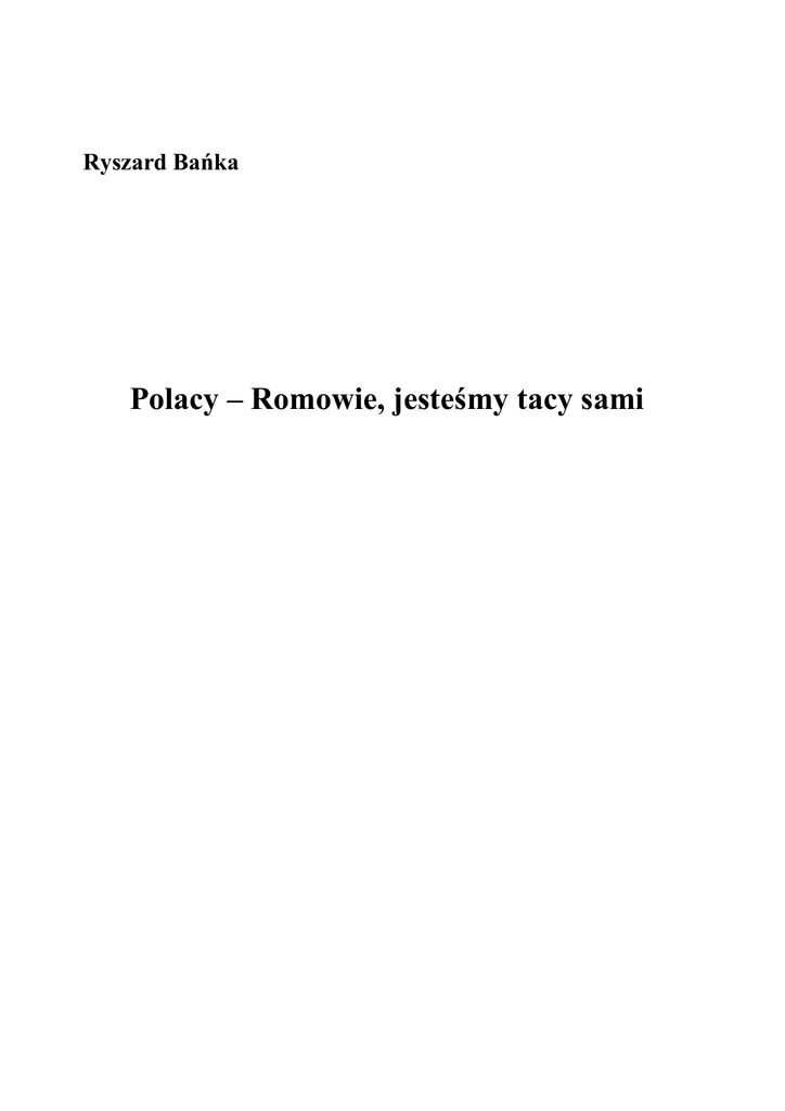 Ryszard Bańka Polacy – Romowie, jesteśmy tacy sami Zamiast wstępu Z dużymi oporami siadłem by napisać ten tekst. Wiem, że nie będzie mi łatwo. Z Romami spotykam się od co najmniej trzech lat, a tak mało o nich wiem. Stąd moje obawy, że to co napiszę, może nie spełniać oczekiwań. Ale co tam, spróbuję. Zastosuję tu cygański sposób myślenia. Liczy się dziś, bo tylko to, co jest dziś jest pewne. Natomiast tym co było wczoraj nie będę się zbytnio przejmował, bo kogo to obchodzi. Jeżeli było dobrze, to dobrze. Jeżeli było źle, to trzeba jak najszybciej zapomnieć. Natomiast, co będzie jutro, to się dopiero okaże. Okaże się, jak złożę tekst do wydawcy. Chcę napisać o swoich kontaktach z Romami, o tym jak ich postrzegam, jakie sprawiają wrażenie na przeciętnym człowieku, za jakiego się uważam. Napiszę również o tym jak zmieniał się mój stosunek do tych ludzi, z którymi wcześniej spotykałem się dużo rzadziej. W tym krótkim opracowaniu zawieram nie tylko swoje osobiste refleksje, ale także trochę faktów wynikających z dokumentów znajdujących się w Szczecineckim Archiwum Państwowym, a także relacje ze zdarzeń z udziałem Romów, których byłem świadkiem. Nie silę się na opracowanie naukowe, to pozostawiam historykom. Moje opracowanie ma charakter publicystyczny i jednocześnie bardzo osobisty. Chcę spojrzeć na Romów przez pryzmat osobistych doświadczeń, chcę pokazać takich Romów, jakich zapamiętałem i jak postrzegałem ich w czasie osobistych kontaktów. Pierwsze kontakty Pamiętam jak dziś, gdy miałem sześć lat moja śp. babcia postraszyła mnie, że jak będę niegrzeczny to odda mnie Cyganom. Mieszkałem wówczas z rodzicami w Zajączkowie, maleńkiej wsi niedaleko Połczyna – Zdroju. Zajączkowo przypominało raczej kolonię niż zwartą wieś. Dom od domu oddalony był o kilkaset metrów. Około półtora kilometra od naszego domu, za rozległą łąką czerniła się ścianą lasu. Tam dość często zatrzymywał się cygański tabor. Przyjeżdżał zawsze w maju, wozy stały na skraju lasu przez co najmniej dwa tygodnie, a Romowie na koniach bądź pieszo odwiedzali domy w Zajączkowie i pobliskich wsiach. Babcia kupiła patelnię, która służyła mojej rodzinie przez kilkanaście lat. Teraz wiem, że była to prawdziwa, romska, patelnia, o jakiej dziś już można tylko pomarzyć. Pewnego razu z bratem wymknęliśmy się z domu poszliśmy pod las by podpatrywać życie w taborze. Oczywiście nie była to wyprawa w celach naukowych. Chcieliśmy z bliska przyjrzeć się ludziom, o których praktycznie nie wiedzieliśmy nic. Kusił nas wóz z dużą, pomalowaną w kolorowe kwiaty lub coś podobnego, budą. Kusiła nas również muzyka, którą wieczorem słychać było pod lasem. Jednak 2 tego dnia nie było nam dane poznać się z kimś z taboru. Zawrócił nas ojciec i przy tym nie poskąpił nam kilku pasów. To właśnie wtedy dowiedziałem się od babci, że Cyganie porywają dzieci. Byłem na tyle dzieckiem, że uwierzyłem. Babcia była wówczas największym (poza ojcowskim pasem) autorytetem dla sześciolatka. W 1959 roku rodzice otrzymali mieszkanie w Połczynie Zdroju. Żal mi było Zajączkowa, ale miasto kusiło swoimi atrakcjami. Zaaferowany nowymi kolegami, ulicami, mnogością ludzi szybko zapomniałem o przestrodze babci, że niegrzeczne dzieci porywają Cyganie. Przypomniało mi się to, gdy pewnego razu do naszych drzwi zapukała młoda Cyganka z dzieckiem zawiniętym w chustę. Prosiła o coś do jedzenia, oferowała wróżbę. Nie bardzo wiedziałem co to znaczy, ale babcia dała jej trochę chleba i kawałek boczku. Po jej wyjściu natychmiast zapytałem, czy to dziecko, które miała na rękach to jest dziecko porwane. Babcia mnie uspokoiła, że nie. Dzieci porwane – wyjaśniała babcia - są natychmiast chowane w wozach, żeby ich nikt nie widział. To jednak nie dawało mi spokoju. Przed zaśnięciem długo myślałem jak sprawdzić, czy Cyganie nie porwali jakiegoś dzieciaka. Jak na siedmiolatka był to problem znacznie przekraczający możliwości jego rozumowania. Następnego dnia nie mogłem doczekać się zakończenia lekcji, gdyż chciałem podzielić się swoimi obawami z kolegami z podwórka. Pamiętam, że reakcja starszych kolegów nie była taka jakiej oczekiwałem, po prostu, zostałem przez nich wyśmiany. Natomiast moi rówieśnicy potraktowali sprawę poważnie i razem postanowiliśmy sprawdzić, co kryją cygańskie wozy. Epizod ten na utkwił mi w pamięci, bo był brzemienny w skutki. Najpierw ustaliliśmy gdzie zatrzymały się cygańskie wozy. Okazało się, że na łące nad rzeka Wogrą. Wybraliśmy się tam po południu. Przez kilka godzin obserwowaliśmy życie w taborze. Liczyliśmy ludzi, sprawdzaliśmy jak pilnowane są wozy, kto do nich wchodzi i wychodzi. Interesowali nas głównie starsi – przecież to oni porywają dzieci. Wiedzieliśmy, że tabor będzie w tym miejscu stał przez kilka dni. Postanowiliśmy przyjść następnego dnia, tyle że wcześniej. Gdy już zajęliśmy stanowisko obserwacyjne zauważyliśmy, że po łące biegają dzieci z taboru. Jeden chłopiec zbliżył się do nas. Potraktowaliśmy go wrogo. Chłopiec odszedł, ale po godzinie powrócił ze starszym – może 15 – 16 letnim chłopakiem. Tu już musieliśmy wykazać respekt. Młody Cygan zaczął wypytywać nas co tu robimy i jeden z nas wypaplał, że chcemy przekonać się gdzie są schowane porwane dzieci. Chłopak coś krzyknął w stronę taboru i po chwili przyszedł jeszcze jeden. Zaprosili nas w pobliże wozów. Zaproszenie było bardzo grzeczne, ale stanowcze. Wobec przeważającej siły – poszliśmy. Okazało się, że nie ma porwanych dzieci, a wozy to nic innego jak domy na kółkach, w których można normalnie 3 mieszkać. Tego wieczoru bawiliśmy się z razem z cygańskimi dziećmi do późna. Gdy zorientowaliśmy się w czasie – było ju