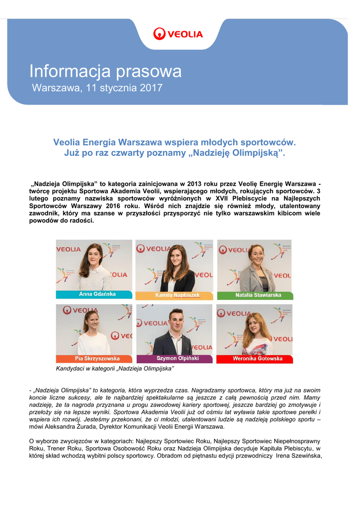 Informacja prasowa Warszawa, 11 stycznia 2017 Veolia Energia Warszawa wspiera młodych sportowców. Już po raz czwarty poznamy „Nadzieję Olimpijską”. „Nadzieja Olimpijska” to kategoria zainicjowana w 2013 roku przez Veolię Energię Warszawa twórcę projektu Sportowa Akademia Veolii, wspierającego młodych, rokujących sportowców. 3 lutego poznamy nazwiska sportowców wyróżnionych w XVII Plebiscycie na Najlepszych Sportowców Warszawy 2016 roku. Wśród nich znajdzie się również młody, utalentowany zawodnik, który ma szanse w przyszłości przysporzyć nie tylko warszawskim kibicom wiele powodów do radości. Kandydaci w kategorii „Nadzieja Olimpijska” - „Nadzieja Olimpijska” to kategoria, która wyprzedza czas. Nagradzamy sportowca, który ma już na swoim koncie liczne sukcesy, ale te najbardziej spektakularne są jeszcze z całą pewnością przed nim. Mamy nadzieję, że ta nagroda przyznana u progu zawodowej kariery sportowej, jeszcze bardziej go zmotywuje i przełoży się na lepsze wyniki. Sportowa Akademia Veolii już od ośmiu lat wyławia takie sportowe perełki i wspiera ich rozwój. Jesteśmy przekonani, że ci młodzi, utalentowani ludzie są nadzieją polskiego sportu – mówi Aleksandra Żurada, Dyrektor Komunikacji Veolii Energii Warszawa. O wyborze zwycięzców w kategoriach: Najlepszy Sportowiec Roku, Najlepszy Sportowiec Niepełnosprawny Roku, Trener Roku, Sportowa Osobowość Roku oraz Nadzieja Olimpijska decyduje Kapituła Plebiscytu, w której skład wchodzą wybitni polscy sportowcy. Obradom od piętnastu edycji przewodniczy Irena Szewińska, Informacja prasowa Warszawa, 11 stycznia 2017 pozostałymi członkami kapituły są: Dorota Idzi, Teresa Sukniewicz-Kleiber, Jerzy Engel, Ryszard Szurkowski oraz Andrzej Supron. Wręczenie nagród w XVII Plebiscycie na Najlepszych Sportowców Warszawy 2016 roku odbędzie się 3 lutego 2017 roku podczas uroczystego balu w hali widowiskowo-sportowej „Arena Ursynów” Ursynowskiego Centrum Sportu i Rekreacji. O programie Sportowa Akademia Veolii Sportowa Akademia Veolii to program edukacyjny, kierowany do sportowców w wieku 14-18 lat, którego istotą jest przygotowanie beneficjentów i absolwentów do świadomego budowania kariery zawodowej oraz przekonanie o zaletach równoczesnego rozwoju edukacyjnego i sportowego. Podczas dwunastomiesięcznej współpracy młodzież otrzymuje cenną dawkę wiedzy z marketingu sportowego, public relations, psychologii sportu, social mediów, produkcji telewizyjnej, prawa sportowego i coachingu zawodowego. Szkolenia dla młodych sportowców prowadzą specjaliści w swoich dziedzinach. Dotychczas w programie SAV uczestniczyło ponad 140 beneficjentów reprezentujących różne dyscypliny indywidualne m.in.: pływanie, kajakarstwo, lekkoatletykę, skoki do wody, szermierkę, judo. Wśród naszych absolwentów są m.in. Gerard Kurniczak – mistrz świata kadetów w zapasach (2016), pływak Kacper Majchrzak olimpijczyk z Londynu (2012) i Rio de Janerio (2016), Marta Lubos – zdobywczyni 13 złotych, 14 srebrnych i 14 brązowych medali w zawodach międzynarodowych i krajowych seniorów i juniorów w karate. Swoim bogatym doświadczeniem dzieli się z młodymi sportowcami znakomita polska lekkoatletka, Kamila Lićwinko, ambasadorka programu. SAV funkcjonuje obecnie w pięciu miastach: Warszawie, Łodzi, Poznaniu, Chrzanowie i Tarnowskich Górach. Projekt zdobył wyróżnienie w prestiżowym konkursie SABRE Awards jako jeden z czterech najlepszych projektów CSR na świecie oraz został ogłoszony Dobrą Praktyką 2015 roku przez Forum Odpowiedzialnego Biznesu. *** Grupa Veolia w Polsce jest jednym z czołowych dostawców usług w zakresie zarządzania energią, gospodarki wodnościekowej i odpadowej. Veolia jest wieloletnim, sprawdzonym partnerem miast i przemysłu, oferującym usługi dostosowane do potrzeb swoich klientów. Zatrudnia około 4500 pracowników. Veolia tworzy i wdraża rozwiązania efektywne ekonomicznie i przyjazne dla środowiska. Tworzone przez grupę nowe modele biznesowe odpowiadają założeniom gospodarki o obiegu zamkniętym i przyczyniają się do zrównoważonego rozwoju miast i przemysłu. Grupa Veolia w Polsce prowadzi działalność w 74 miastach, w 40 zarządza sieciami ciepłowniczymi. Działa poprzez spółki: Veolia Energia Polska (holding), 7 głównych spółek operacyjnych – Veolia Energia Warszawa, Veolia Energia Łódź, Veolia Energia Poznań, Veolia Energia Poznań ZEC, Veolia term, Veolia Industry Polska, Przedsiębiorstwo Wodociągów i Kanalizacji w Tarnowskich Górach oraz ich spółki zależne. www.veolia.pl Veolia Energia Warszawa zarządza największą w Unii Europejskiej siecią ciepłowniczą, dostarczającą ciepło systemowe i ciepłą wodę do 80% budynków w Warszawie. Spółka, realizując założenia polityki zrównoważonego rozwoju grupy, tworzy i wdraża rozwiązania efektywne energetycznie, optymalne dla środowiska i społeczności lokalnych. Spółka należy do grupy Veolia w Polsce od 2011 r. Czuwa nad bezpieczeństwem i pewnością dostaw ciepła, dbając o właściwe funkcjonowanie prawie 1800 km stołecznej sieci ciepłowniczej i tysięcy węzłów cieplnych. www.energiadlawarszawy.pl Kontakt: Aleksandra Żurada, Dyrektor Komunikacji Veolia Energia Warszawa [email protected], tel.: +48 508 336 419