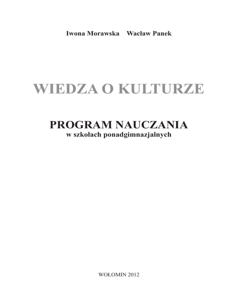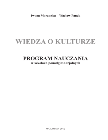Iwona Morawska Wacław Panek WIEDZA O KULTURZE PROGRAM NAUCZANIA w szkołach ponadgimnazjalnych WOŁOMIN 2012 Projekt okładki Anna Szumańska Redakcja Zespół Redakcja techniczna Dariusz Kupiec Copyright© 2012 by Wydawnictwo Polskie w Wołominie ISBN 978-83-61368-11-3 Wydanie pierwsze Wołomin 2012 Skład i łamanie P.H.U. „LOGOS” s.c., www.logos.home.pl Druk i oprawa Drukarnia READ ME, 92-403 Łódź, ul. Olechowska 83 Spis treści I. Podstawa programowa przedmiotu wiedza o kulturze ................ 4 II. Ogólne założenia, cele i treści programu ................................... 6 III. Wskazówki do realizacji celów przedmiotowo-programowych. 15 IV. Zakładane osiągnięcia uczniów ................................................. 18 V. Sprawdzanie i ocenianie osiągnięć przedmiotowych .............. 19 VI. Uwagi końcowe ......................................................................... 21 I. Podstawa programowa przedmiotu wiedza o kulturze obowiązuje od 2012 roku CELE KSZTAŁCENIA - WYMAGANIA OGÓLNE I. Odbiór wypowiedzi i wykorzystanie zawartych w nich informacji. Uczeń odbiera teksty kultury i wykorzystuje informacje w nich zawarte, z uwzględnieniem specyfiki medium, w którym są przekazywane. II. Tworzenie wypowiedzi. Uczeń tworzy wypowiedzi, celowo posługując się różnymi mediami (słowo mówione i pisane, obraz malarski, fotograficzny, filmowy, dźwięk, widowisko, środki multimedialne); aktywnie współtworzy kulturę lokalną (szkoły, dzielnicy, miejscowości). III. Analiza i interpretacja tekstów kultury. Uczeń posługuje się pojęciem kultury rozumianej jako całokształt ludzkiej działalności; analizuje i interpretuje teksty kultury – potoczne praktyki kultury, a także dzieła sztuki. TREŚCI NAUCZANIA - WYMAGANIA SZCZEGÓŁOWE 1. Odbiór wypowiedzi i wykorzystanie zawartych w nich informacji. Uczeń: 1) zna dwudziestowieczne dzieła reprezentujące różne dziedziny sztuki (literaturę, architekturę, plastykę, muzykę, teatr, fotografię, film, sztukę nowych mediów) i dostrzega związki pomiędzy nimi; 2) wskazuje różne funkcje dzieła sztuki (np. estetyczną, komunikacyjną, społeczną, użytkową, kultową, poznawczą, ludyczną); 3) analizuje temat dzieła oraz treści i formę w kontekście jego różnych funkcji, wykorzystując podstawowe wiadomości o stylach i epokach z różnych dziedzin sztuki; 4) analizuje film lub analizuje spektakl teatralny, posługując się podstawowymi pojęciami z zakresu właściwej dziedziny sztuki; 5) charakteryzuje podstawowe media kultury (słowo, obraz, dźwięk, widowisko); 6) wymienia różne formy mediów kultury (słowo mówione, pismo, książka, obraz malarski, fotografia, film, program telewizyjny, spektakl teatralny) oraz użycia (nowe media, media masowe, media interaktywne, multimedia); 7) wyjaśnia, na czym polegają różne formy kontaktu z kulturą (odbiór bierny, aktywny, konsumpcja, produkcja, twórczość, użytkowanie, uczestnictwo, animacja); 4 8) lokuje wytwory kultury (zachowania, zwyczaje, normy moralne, wytwory materialne, dzieła sztuki) w kontekście grup społecznych, w których są tworzone i odbierane (rodzina, rówieśnicy, społeczność lokalna, naród); 9) samodzielnie wyszukuje informacje na temat kultury w różnych mediach, bibliotekach. 2. Tworzenie wypowiedzi. Uczeń: 1) wypowiada się – w mowie i w piśmie – na temat wytworów kultury i ludzkich praktyk w kulturze (zachowań, obyczajów, przedmiotów materialnych, dzieł sztuki); 2) wypowiada się na temat dzieła sztuki, używając pojęć zarówno swoistych dla poszczególnych sztuk, jak i wspólnych (forma, kompozycja, funkcja, nadawca, odbiorca, użytkownik, znaczenie, kontekst, medium); 3) przygotowuje prezentację lub inną formę wypowiedzi multimedialnej – blog, forum, strona WWW – na tematy związane z kulturą lokalną i regionu lub z szeroko pojętymi problemami kultury współczesnej; 4) bierze aktywny udział w szkolnych przedsięwzięciach artystycznych, animacyjnych, społecznych i innych (wystawa, happening, przedstawienie szkolne, gazetka szkolna, kulturalna akcja charytatywna); 5) organizuje proste działania o charakterze kulturalnym (spotkanie z twórcą kultury, przedsięwzięcie artystyczne, prezentacja własnych zainteresowań, tradycji lokalnej lub regionalnej); 6) określa swoje zainteresowania, potrzeby i preferencje kulturalne oraz uzasadnia je w dyskusji; 7) dba o ład i estetykę otoczenia, otacza opieką elementy dziedzictwa kulturowego. 3. Analiza i interpretacja tekstów kultury. Uczeń: 1) odróżnia pojęcie kultury rozumianej jako dorobek artystyczny od kultury rozumianej jako całokształt dorobku ludzkości, ze zrozumieniem używa określeń: kulturowy i kulturalny; 2) rozróżnienie, o którym mowa w pkt 1, stosuje w interpretacji wytworów kultury; 3) odnosi elementy kultury (zachowania, zwyczaje, praktyki, przedmioty materialne, dzieła sztuki) do kategorii: czas, przestrzeń, ciało, grupa społeczna (rodzina, rówieśnicy, społeczność lokalna, naród); 4) interpretuje praktyki kultury z najbliższego otoczenia (klasa, szkoła, dom, osiedle, podwórko, miasto, kościół, stadion piłkarski); 5) dostrzega i nazywa związek między dziełem a sytuacją społeczno-historyczną i obyczajami epoki, w której powstało; 5 6) posługuje się pojęciami: kultura popularna, ludowa, masowa, wysoka, narodowa, zglobalizowana, subkultura w ich właściwym znaczeniu i używa ich w kontekście interpretowanych dzieł sztuki oraz praktyk kulturowych; 7) wskazuje relacje między kulturami: lokalną, regionalną, narodową i europejską, ujawniające się w konkretnych dziełach sztuki i praktykach kultury. ZALECANE WARUNKI I SPOSÓB REALIZACJI Wiedza o kulturze stanowi zwieńczenie cyklu kształcenia artystycznego. Stąd założenie o możliwości odwoływania się nauczyciela do wiedzy dotyczącej sztuk plastycznych oraz muzyki zdobytej przez ucznia na wcześni