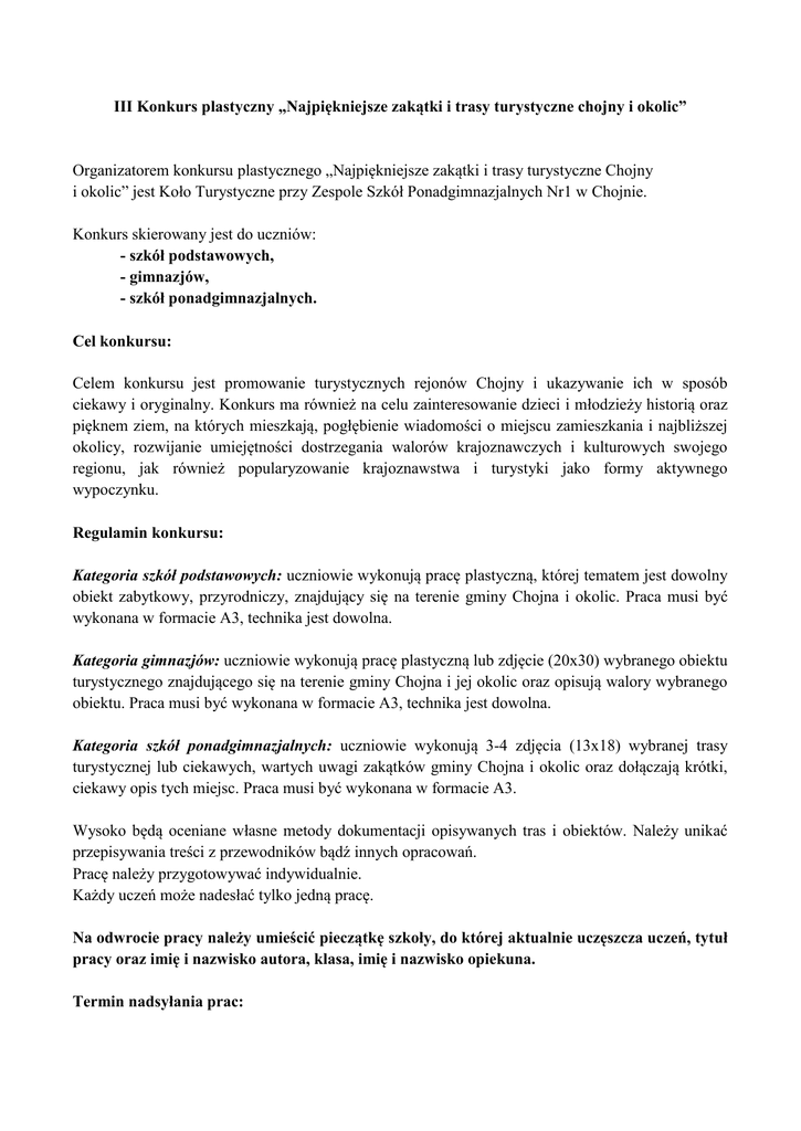 III Konkurs plastyczny „Najpiękniejsze zakątki i trasy turystyczne chojny i okolic” Organizatorem konkursu plastycznego „Najpiękniejsze zakątki i trasy turystyczne Chojny i okolic” jest Koło Turystyczne przy Zespole Szkół Ponadgimnazjalnych Nr1 w Chojnie. Konkurs skierowany jest do uczniów: - szkół podstawowych, - gimnazjów, - szkół ponadgimnazjalnych. Cel konkursu: Celem konkursu jest promowanie turystycznych rejonów Chojny i ukazywanie ich w sposób ciekawy i oryginalny. Konkurs ma również na celu zainteresowanie dzieci i młodzieży historią oraz pięknem ziem, na których mieszkają, pogłębienie wiadomości o miejscu zamieszkania i najbliższej okolicy, rozwijanie umiejętności dostrzegania walorów krajoznawczych i kulturowych swojego regionu, jak również popularyzowanie krajoznawstwa i turystyki jako formy aktywnego wypoczynku. Regulamin konkursu: Kategoria szkół podstawowych: uczniowie wykonują pracę plastyczną, której tematem jest dowolny obiekt zabytkowy, przyrodniczy, znajdujący się na terenie gminy Chojna i okolic. Praca musi być wykonana w formacie A3, technika jest dowolna. Kategoria gimnazjów: uczniowie wykonują pracę plastyczną lub zdjęcie (20x30) wybranego obiektu turystycznego znajdującego się na terenie gminy Chojna i jej okolic oraz opisują walory wybranego obiektu. Praca musi być wykonana w formacie A3, technika jest dowolna. Kategoria szkół ponadgimnazjalnych: uczniowie wykonują 3-4 zdjęcia (13x18) wybranej trasy turystycznej lub ciekawych, wartych uwagi zakątków gminy Chojna i okolic oraz dołączają krótki, ciekawy opis tych miejsc. Praca musi być wykonana w formacie A3. Wysoko będą oceniane własne metody dokumentacji opisywanych tras i obiektów. Należy unikać przepisywania treści z przewodników bądź innych opracowań. Pracę należy przygotowywać indywidualnie. Każdy uczeń może nadesłać tylko jedną pracę. Na odwrocie pracy należy umieścić pieczątkę szkoły, do której aktualnie uczęszcza uczeń, tytuł pracy oraz imię i nazwisko autora, klasa, imię i nazwisko opiekuna. Termin nadsyłania prac: Prace należy przesyłać w nieprzekraczalnym terminie do 28 marca 2014 r. na adres: Zespół Szkół Ponadgimnazjalnych Nr1 ul. Dworcowa 3 74-500 Chojna Rozstrzygnięcie konkursu 15 kwietnia 2014. Komunikaty i informacje na temat konkursu publikowane będą na stronie www.zsp1chojna.pl. Wszelkie pytania dotyczące konkursu należy kierować drogą elektroniczną na adres: [email protected] Po zakończeniu konkursu wyróżnione prace będą wystawione w Centrum Kultury w Chojnie. tel. ZSP Nr1: 91 4142029 Prace będzie oceniała Komisja powołana spośród krajoznawców i plastyków Ziemi Chojeńskiej. Zwycięzcy każdej kategorii otrzymają ciekawe nagrody. Koordynator konkursu mgr Agnieszka Jabłońska