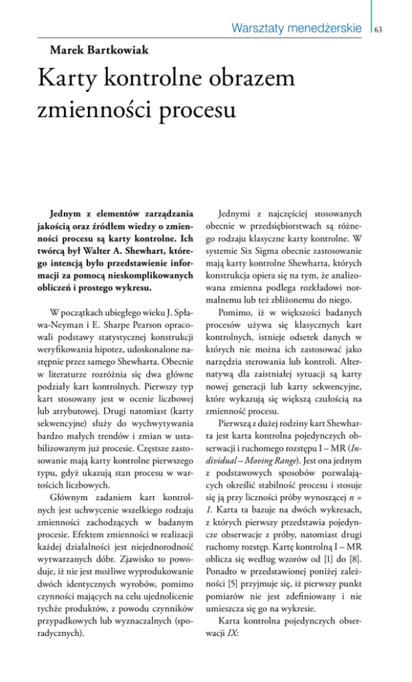Warsztaty menedżerskie Marek Bartkowiak Karty kontrolne obrazem zmienności procesu Jednym z elementów zarządzania jakością oraz źródłem wiedzy o zmienności procesu są karty kontrolne. Ich twórcą był Walter A. Shewhart, którego intencją było przedstawienie informacji za pomocą nieskomplikowanych obliczeń i prostego wykresu. W początkach ubiegłego wieku J. Spława-Neyman i E. Sharpe Pearson opracowali podstawy statystycznej konstrukcji weryfikowania hipotez, udoskonalone następnie przez samego Shewharta. Obecnie w literaturze rozróżnia się dwa główne podziały kart kontrolnych. Pierwszy typ kart stosowany jest w ocenie liczbowej lub atrybutowej. Drugi natomiast (karty sekwencyjne) służy do wychwytywania bardzo małych trendów i zmian w ustabilizowanym już procesie. Częstsze zastosowanie mają karty kontrolne pierwszego typu, gdyż ukazują stan procesu w wartościch liczbowych. Głównym zadaniem kart kontrolnych jest uchwycenie wszelkiego rodzaju zmienności zachodzących w badanym procesie. Efektem zmienności w realizacji każdej działalności jest niejednorodność wytwarzanych dóbr. Zjawisko to powoduje, iż nie jest możliwe wyprodukowanie dwóch identycznych wyrobów, pomimo czynności mających na celu ujednolicenie tychże produktów, z powodu czynników przypadkowych lub wyznaczalnych (sporadycznych). Jednymi z najczęściej stosowanych obecnie w przedsiębiorstwach są różnego rodzaju klasyczne karty kontrolne. W systemie Six Sigma obecnie zastosowanie mają karty kontrolne Shewharta, których konstrukcja opiera się na tym, że analizowana zmienna podlega rozkładowi normalnemu lub też zbliżonemu do niego. Pomimo, iż w większości badanych procesów używa się klasycznych kart kontrolnych, istnieje odsetek danych w których nie można ich zastosować jako narzędzia sterowania lub kontroli. Alternatywą dla zaistniałej sytuacji są karty nowej generacji lub karty sekwencyjne, które wykazują się większą czułością na zmienność procesu. Pierwszą z dużej rodziny kart Shewharta jest karta kontrolna pojedynczych obserwacji i ruchomego rozstępu I – MR (Individual – Moving Range). Jest ona jednym z podstawowych sposobów pozwalających określić stabilność procesu i stosuje się ją przy liczności próby wynoszącej n = 1. Karta ta bazuje na dwóch wykresach, z których pierwszy przedstawia pojedyncze obserwacje z próby, natomiast drugi ruchomy rozstęp. Kartę kontrolną I – MR oblicza się według wzorów od [1] do [8]. Ponadto w przedstawionej poniżej zależności [5] przyjmuje się, iż pierwszy punkt pomiarów nie jest zdefiniowany i nie umieszcza się go na wykresie. Karta kontrolna pojedynczych obserwacji IX: 63 64 KWARTALNIK NAUK O PRZEDSIĘBIORSTWIE — 2011 / 3 Karta kontrolna ruchomego rozstępu MR: gdzie poszczególne oznaczenia to: xi – pojedynczy pomiar, – wartość średnia próby, n – liczność próby. Na poniższym przykładzie przedstawionym na rysunku 1 ukazano za pomocą programu STATISTICA© dane GUS, dotyczące zasobów materiałowych uwzględniających bilans całego kraju w 2009 roku. Po lewej stronie kart kontrolnych znajdują się histogramy obserwacji oraz ruchomych rozstępów. Na karcie ła- two zauważyć wysoką zmienność procesu utrzymywania tychże zasobów. Szczególnie widoczne jest to w początkowej oraz końcowej fazie pomiarów. Prawdopodobnie było to podyktowane różnym zapotrzebowaniem gospodarki narodowej na danego typu środki materiałowe. Elementem pogłębiającym był fakt, iż większość materiałów (od 80 do 100 proc.) było zgromadzonych w sektorze prywatnym, który charakteryzuje się dużą płynnością. Zgodnie z analizą GUS większość materiałów będących w rękach prywatnych była dostosowywana do rzeczywistych potrzeb i natychmiast zużywana. Rozpatrując jednak dane pod względem danego typu środka materiałowego w szerszym aspekcie czasu, zauważa się już znaczącą stabilność procesu magazynowania. Kolejnym narzędziem kontrolującym zmienność procesu jest karta kontrolna średnich obserwacji i odchylenia – s. Wielkość matestandardowego riału statystycznego w przypadku tej karty powinna być stosunkowo duża, i dlatego sugeruje się jej stosowanie przy liczności próby wynoszącej n > 9. Górny wykres stanowią średnie wartości z obserwacji, natomiast w dolnym umieszczane są wartości odchylenia standardowego. Punkty oraz granice oblicza się we- Rysunek 1 Karta kontrolna I – MR, program STATISTICA© – przykład Zródło: opracowanie własne. Karty kontrolne obrazem zmienności procesu dług przedstawionych poniżej zależności od [9] do [16]. Karta kontrolna wartości średnich : Karta kontrolna wartości średnich : Karta kontrolna rozstępu R: Karta kontrolna odchylenia standardowego s: gdzie poszczególne oznaczenia to: – wartość średnia próby, – wartość średnia z wartości średnich w poszczególnych próbach, A 3, B3, B4 – współczynniki statystyczne, si – odchylenie standardowe w próbie, – wartość średnia odchylenia standardowego w próbie, k – liczba prób, n – liczność próby. Następna w kolejności jest karta – R. średnich obserwacji i rozstępu Jest to stosunkowo łatwa do użycia metoda badania zmienności procesu, gdyż bazuje głównie na obliczeniu wartości średnich zgodnie z wzorami od [17] do [20] oraz rozstępu, przedstawionymi w zależnościach od [21] do [24]. Liczność próby powinna mieścić się w przedziale n = <2,9>. Należy tu zauważyć, iż rozstęp nie jest tak miarodajny jak odchylenie standardowe, dlatego jeżeli istnieje taka możliwość to zaleca się stosowanie karty kontrolnej – s. gdzie poszczególne oznaczenia to: – wartość średnia próby, – wartość średnia z wartości średnich w poszczególnych próbach, – wartość średnia rozstępu, A 2, D3, D4 – współczynniki statystyczne, k – liczba prób, n – liczność próby. Ostatni