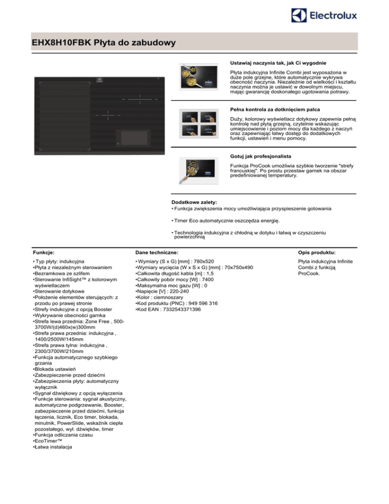 EHX8H10FBK Płyta do zabudowy Ustawiaj naczynia tak, jak Ci wygodnie Płyta indukcyjna Infinite Combi jest wyposażona w duże pole grzejne, które automatycznie wykrywa obecność naczynia. Niezależnie od wielkości i kształtu naczynia można je ustawić w dowolnym miejscu, mając gwarancję doskonałego ugotowania potrawy. Pełna kontrola za dotknięciem palca Duży, kolorowy wyświetlacz dotykowy zapewnia pełną kontrolę nad płytą grzejną, czytelnie wskazując umiejscowienie i poziom mocy dla każdego z naczyń oraz zapewniając łatwy dostęp do dodatkowych funkcji, ustawień i menu pomocy. Gotuj jak profesjonalista Funkcja ProCook umożliwia szybkie tworzenie "strefy francuskiej". Po prostu przestaw garnek na obszar predefiniowanej temperatury. Dodatkowe zalety: • Funkcja zwiększenia mocy umożliwiająca przyspieszenie gotowania • Timer Eco automatycznie oszczędza energię. • Technologia indukcyjna z chłodną w dotyku i łatwą w czyszczeniu powierzchnią Funkcje: Dane techniczne: Opis produktu: • Typ płyty: indukcyjna •Płyta z niezależnym sterowaniem •Bezramkowa ze szlifem •Sterowanie InfiSight™ z kolorowym wyświetlaczem •Sterowanie dotykowe •Położenie elementów sterujących: z przodu po prawej stronie •Strefy indukcyjne z opcją Booster •Wykrywanie obecności garnka •Strefa lewa przednia: Zone Free , 5003700W/(d)460x(w)300mm •Strefa prawa przednia: indukcyjna , 1400/2500W/145mm •Strefa prawa tylna: indukcyjna , 2300/3700W/210mm •Funkcja automatycznego szybkiego grzania •Blokada ustawień •Zabezpieczenie przed dziećmi •Zabezpieczenia płyty: automatyczny wyłącznik •Sygnał dźwiękowy z opcją wyłączenia •Funkcje sterowania: sygnał akustyczny, automatyczne podgrzewanie, Booster, zabezpieczenie przed dziećmi, funkcja łączenia, licznik, Eco timer, blokada, minutnik, PowerSlide, wskaźnik ciepła pozostałego, wył. dźwięków, timer •Funkcja odliczania czasu •EcoTimer™ •Łatwa instalacja • Wymiary (S x G) [mm] : 780x520 •Wymiary wycięcia (W x S x G) [mm] : 70x750x490 •Całkowita długość kabla [m] : 1,5 •Całkowity pobór mocy [W] : 7400 •Maksymalna moc gazu [W] : 0 •Napięcie [V] : 220-240 •Kolor : ciemnoszary •Kod produktu (PNC) : 949 596 316 •Kod EAN : 7332543371396 Płyta indukcyjna Infinite Combi z funkcją ProCook. EHX8H10FBK Płyta do zabudowy