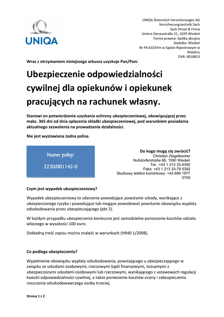 Wraz z otrzymaniem niniejszego arkusza uzyskuje Pan/Pani UNIQA Österreich Versicherungen AG Versicherungstechnik Sach Sach Privat & Firma Untere Donaustraße 21, 1029 Wiedeń Forma prawna: Spółka akcyjna Siedziba: Wiedeń Nr FN 63197m w Sądzie Rejestrowym w Wiedniu DVR: 0018813 Ubezpieczenie odpowiedzialności cywilnej dla opiekunów i opiekunek pracujących na rachunek własny. Stanowi on potwierdzenie uzyskania ochrony ubezpieczeniowej, obowiązującej przez maks. 365 dni od dnia opłacenia składki ubezpieczeniowej, pod warunkiem posiadania aktualnego zezwolenia na prowadzenie działalności. Nie jest wystawiana żadna polisa. Numer polisy: 2230/001142-0 Do kogo mogę się zwrócić? Christian Ziegelbecker Nußdorferstraße 66, 1090 Wiedeń Tel.: +43 1 213 33-5392 Faks: +43 1 213 33-79 5392 Służbowy telefon komórkowy: +43 699 1977 0705 Czym jest wypadek ubezpieczeniowy? Wypadek ubezpieczeniowy to zdarzenie powodujące powstanie szkody, wynikające z ubezpieczonego ryzyka i powodujące lub mogące powodować powstanie obowiązku wypłaty odszkodowania przez ubezpieczającego (pkt 2). W każdym przypadku ubezpieczenia konieczne jest samodzielne ponoszenie kosztów udziału własnego w wysokości 100 euro. Dokładną treść zapisu można znaleźć w warunkach (H940 1/2008). Co podlega ubezpieczeniu? Wypełnienie obowiązku wypłaty odszkodowania, powstającego u ubezpieczającego w związku ze szkodami osobowymi, rzeczowymi bądź finansowymi, tożsamymi z ubezpieczonymi szkodami osobowymi lub rzeczowymi, wynikającego z ustawowych regulacji kwestii odpowiedzialności cywilnej, a także poniesienie kosztów oceny i zabezpieczenia roszczenia odszkodowawczego osoby trzeciej. Strona 1 z 2 Wskazówka: Warunkiem koniecznym wypłaty odszkodowania przez ubezpieczyciela jest stwierdzenie odpowiedzialności sprawcy. Dokładny zakres pokrycia ubezpieczeniowego można znaleźć w warunkach (H940 1/2008). Co nie podlega ubezpieczeniu? Z ubezpieczenia są wyłączone roszczenia dotyczące szkód powodowanych przez zabiegi lub procedury wykraczające poza uprawnienia zawodowe. Dokładny zakres pokrycia ubezpieczeniowego można znaleźć w warunkach (H940 1/2008). Kiedy kończy się okres ubezpieczenia? Okres ubezpieczenia kończy się automatycznie po roku od opłacenia składki ubezpieczeniowej. Jakie jeszcze przepisy obowiązują? Dodatkowo do przytoczonych warunków (H940), które może Pan/Pani uzyskać na życzenie, obowiązuje ustawa o umowach ubezpieczeniowych w aktualnie obowiążującym kształcie. Co jeszcze obowiązuje: Szkody finansowe Zasady ubezpieczenia są w tym przypadku odmienne w art. 1, punkt 2. AHVB (ogólne warunki obowiązkowego ubezpieczenia) także w odniesieniu do obowiązku wypłaty odszkodowania z tytułu szkód czysto finansowych do sumy ubezpieczenia 10 000,00 EUR. Zakłócenie środowiska Zawarto porozumienie specjalne zgodnie z art. 6 AHVB. Ubezpieczenie obejmuje także koszty odtworzenia równowagi środowiskowej zgodnie z osobnym porozumieniem. Strona 2 z 2