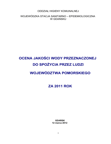 ODDZIAŁ HIGIENY KOMUNALNEJ WOJEWÓDZKA STACJA SANITARNO – EPIDEMIOLOGICZNA W GDAŃSKU OCENA JAKOŚCI WODY PRZEZNACZONEJ DO SPOŻYCIA PRZEZ LUDZI WOJEWÓDZTWA POMORSKIEGO ZA 2011 ROK GDAŃSK 12 marca 2012 1 S p i s t r e ś c i I. Jakość wody przeznaczonej do spożycia przez ludzi .................................................................................................................................................................. 1. Ocena urządzeń wodociągowych 2. Wodociągi raportowane do UE w 2011r. 3. Liczba urządzeń, w których jakość wody nie odpowiada wymaganiom sanitarnym określonym w załączniku nr 2 rozporządzenia Ministra Zdrowia z dnia 29 marca 2007r. (Dz.U. Nr 61 poz. 417) 4. Działalność kontrolno – represyjna 5. Wykaz Przedsiębiorstw Wodociągowo-Kanalizacyjnych na terenie województwa pomorskiego 6. Wykaz laboratoriów o udokumentowanym systemie jakości prowadzonych badań wody, zatwierdzonych przez PIS woj. Pomorskiego 7. Zgody na odstępstwo wydane w 2011r. 8. Działania naprawcze prowadzone przez przedsiębiorstwa wodociągowokanalizacyjne 9. Wnioski 3 ….................................................................................................................................................................................................................................................................................................. 3 6 …....................................................................................................................................................................................................................................................... 9 10 ….................................................................................................................................................................................................................................................................................................................. …............................................................................................................................................................................................................................................................................... …........................................................................................................................................................................................................................................................................................................................... 11 14 16 …............................................................................................................................................................................... ....................................................................................................................................................................................................................................................... 16 17 ….......................................................................................................................................................................................................................................................................................................................................................................................................... …................................................................................................................................................................................................................................................................................................................................................................................................................................... .….. 2 I. Jakość wody przeznaczonej do spożycia przez ludzi 1. Ocena urządzeń wodociągowych Na terenie województwa pomorskiego w ewidencji organów PIS w roku 2011 znajdowało się 1181 urządzeń dostarczających wodę: a) 817 wodociagów zbiorowego zaopatrzenia w wodę w tym : 547 wodociągów o wydajności <100 m3/dobę 233 wodociągi o wydajności 100 - 1000 m3/dobę 34 wodociągi o wydajności 1000 - 10000 m3/dobę 3 wodociągi o wydajności 10000 - 100000 m3/dobę b) 339 innych podmiotów zaopatrujących w wodę (skontrolowano 330) c) 25 studnie publiczne. Podstawę zaopatrzenia w wodę stanowią wodociągi publiczne, które oparte są na wodach wgłębnych. Wyjątek, tak jak w poprzednich latach stanowią: - ujęcie powierzchniowe w Straszynie zasilające wodociąg centralny m. Gdańska - ujęcie drenażowe - "Pręgowo" - wodociąg centralny m. Gdańska - "Nowe Sarnie Wzgórze" - wodociąg publiczny w Sopocie. Ciągłej dezynfekcji związkami chloru poddawana jest woda z w/w ujęcia powierzchniowego, ujęcia drenażowego „Pręgowo”, ujęć głębinowych „Sportowa” i „Kamionka” należących do wodociągu publicznego w Kwidzynie oraz wod. lok. Warmińskie Zakłady Przetwórstwa Owocowo-Warzywnego Sp. z o.o. w Kwidzynie (powiat kwidzyński) i wod. lok. “Farm Frites” w Lęborku ( powiat lęborski ). Natomiast uj. "Nowe Sarnie Wzgórze" w Sopocie - dezynfekowane jest przy pomocy lamp UV. Wodociągi o wydajności < 100 m3/dobę: W 2011 roku w województwie pomorskim oceniono i skontrolowano 547 wodociągów, z czego 89 wodociągów (16,27%) dostarczało wodę nieodpowiadającą wymaganiom sanitarnym, w tym 2 pod względem bakteriologicznym: – wod. publ. Perlino gm. Gniewino, powiat wejherowski – bakterie grupy coli 72 jtk/100ml. – wod. publ. Dąbrówka gm. Starogard Gdański, powiat starogardzki bakterie grupy coli >300 jtk/100ml. Pod względem fizykochemicznym woda z 89 wodociągów odbiegała od wymagań sanitarnych z uwagi na ponadnormatywną zawartość żelaza, manganu, jonu amonowego, zapachu oraz związane z tym mętność oraz barwę. Wodociagi w których jakość wody odbiega od wyma