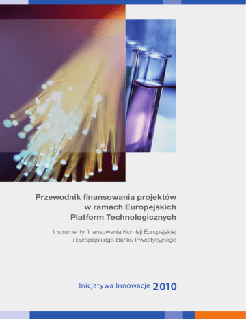 Przewodnik finansowania projektów w ramach Europejskich Platform Technologicznych Instrumenty finansowania Komisji Europejskiej i Europejskiego Banku Inwestycyjnego Inicjatywa Innowacje 2010 Przewodnik finansowania projektów w ramach Europejskich Platform Technologicznych Instrumenty finansowania Komisji Europejskiej i Europejskiego Banku Inwestycyjnego Spis treści Jaki jest cel niniejszego dokumentu? Strona 3 Strona 4 1. Wprowadzenie 2. EBI jest silnym partnerem we wspieraniu badań i rozwoju technologicznego oraz innowacji w Europie W jaki sposób można finansować projekty w ramach EPT? Strona 5 Strona 6 3. Europejskie Platformy Technologiczne są niejednorodne 4. Różne rodzaje projektów wymagają różnych planów finansowania Kto może skorzystać z finansowania EBI? Strona 7 5. EBI udziela pomocy finansowej akceptowanym przez banki partnerom, którzy promują kwalifikujące się projekty Co jest przedmiotem finansowania EBI i jaka jest jego forma? Strona 9 Strona 10 6. Wysokość kredytu EBI zależy od kosztów kwalifikowanych projektu 7. Zróżnicowana linia produktów EBI Dlaczego EBI jest odpowiednim partnerem teraz i w przyszłości? Strona 11 Strona 11 8. Zaangażowanie EBI wartością dodaną 9. Komisja Europejska i EBI łączą siły w ramach programu finansowania zgodnie z systemem podziału ryzyka Strona 12 Glosariusz finansowy Niniejszy dokument roboczy pod tytułem: „Przewodnik finansowania projektów w ramach Europejskich Platform Technologicznych” jest skierowany do sektora badań i rozwoju technologicznego (RTD) i dotyczy przede wszystkim propozycji wdrażania Europejskich Platform Technologicznych (projekty i infrastruktura) w ramach siódmego programu ramowego UE na rzecz badań i rozwoju technologicznego. Daje podstawowy, praktyczny przegląd różnych instrumentów finansowania oferowanych przez Europejski Bank Inwestycyjny (kredyty) we współpracy z Komisją Europejską (dotacje). Niektóre terminy techniczne, których objaśnienia znajdują się w glosariuszu finansowym, są wyróżnione kursywą kiedy po raz pierwszy pojawiają się w tekście. Niniejszy dokument jest rezultatem pracy grupy roboczej do spraw instrumentów finansowych na rzecz wdrażania Europejskich Platform Technologicznych. Do jego powstania przyczynili się, oprócz przestawicieli Komisji Europejskiej i Europejskiego Banku Inwestycyjnego, następujący członkowie grupy roboczej: pp. Phil Doran (Core Technology Ventures Ltd.), Claude Roulet (Schlumberger Water Services), Michel Viaud (European Photovoltaic Industry Association), Michael vom Baur (Akeryards) i Lutz Walter (EURATEX). Przewodnik finansowania projektów w ramach Europejskich Platform Technologicznych Jaki jest cel niniejszego dokumentu? 1. Wprowadzenie Europa wyznaczyła sobie ambitny cel stania się najbardziej konkurencyjną i dynamiczną gospodarką na świecie opartą na wiedzy (strategia lizbońska z 2000 roku). Zwiększenie inwestycji w badania i rozwój technologiczny będzie miało, w długoterminowej perspektywie, znaczący pozytywny wpływ na wzrost gospodarczy, zatrudnienie i konkurencyjność Europy. Rada Europejska na szczycie w Barcelonie w 2002 roku zaapelowała do państw członkowskich UE o zwiększenie inwestycji w RTD do 3% PKB do roku 2010, z czego dwie trzecie powinno pochodzić z sektora prywatnego. Z myślą o wsparciu realizacji tego celu opracowano wiele różnych instrumentów polityki na poziomie krajowym i europejskim. Jednakże Komisja Europejska przyznała, że, pomimo istniejących instrumentów dotacyjnych, ograniczenia finansowe są wciąż poważnym problemem, z jakim boryka się wiele przedsiębiorstw i instytucji. Niniejszy „Przewodnik finansowania projektów w ramach Europejskich Platform Technologicznych” jest skierowany do sektora RTD i dotyczy przede wszystkim propozycji wdrażania Europejskich Platform Technologicznych (projekty i infrastruktura) w ramach siódmego programu ramowego UE na rzecz badań i rozwoju technologicznego. Daje podstawowy, praktyczny przegląd różnych instrumentów finansowania oferowanych przez Europejski Bank Inwestycyjny we współpracy z Komisją Europejską. Niniejszy dokument roboczy koncentruje się na następujących trzech kluczowych przesłaniach: I. Projekty w ramach Europejskich Platform Technologicznych (EPT) są niejednorodne i wymagają indywidualnych rozwiązań finansowania Niniejszy dokument wyjaśnia, w jaki sposób można skonstruować plan finansowania dla projek- tu w ramach EPT i w jakich przypadkach można wykorzystać instrumenty kredytowe EBI, pokazuje różnicę pomiędzy finansowaniem ze środków własnych a finansowaniem w formie dotacji i kredytów, koncentruje się na charakterze i szczegółowych wymaganiach różnych instrumentów i struktur finansowania kredytowego EBI, podkreśla również, że finansowanie EBI jest uzupełnieniem istniejących instrumentów dotacyjnych na poziomie unijnym i krajowym, które jest dostępne dla akceptowanych przez banki promotorów i kwalifikujących się projektów. II. Zaangażowanie EBI wartością dodaną Udział EBI w finansowaniu projektów w ramach EPT stanowi wartość dodaną, gdyż Bank oferuje wysoce konkurencyjne warunki finansowania w systemie podziału ryzyka z promotorem i/ lub innymi partnerami finansującymi oraz dostarcza know-how w zakresie konstruowania projektu. Zaangażowanie EBI jest ponadto postrzegane jako marka jakości i może przyciągnąć innych partnerów finansujących (efekt katalityczny). III. Nowe instrumenty zmobilizują dodatkowe środki dla badań i rozwoju (R&D) w Europie Komisja Europejska i EBI opracują nowe sposoby, oprócz istniejących instrumentów dotacyjnych, wykorzystania instrumentów finansowania EBI jako dźwigni finansowej dla dotacji unijnych. W ramach siódmego badawczego programu ramowego na lata 2007-2013 planuje się uruchomienie programu finansowania zgodnie z systemem podziału ryzyka. Ten program, będący uzupełnieniem