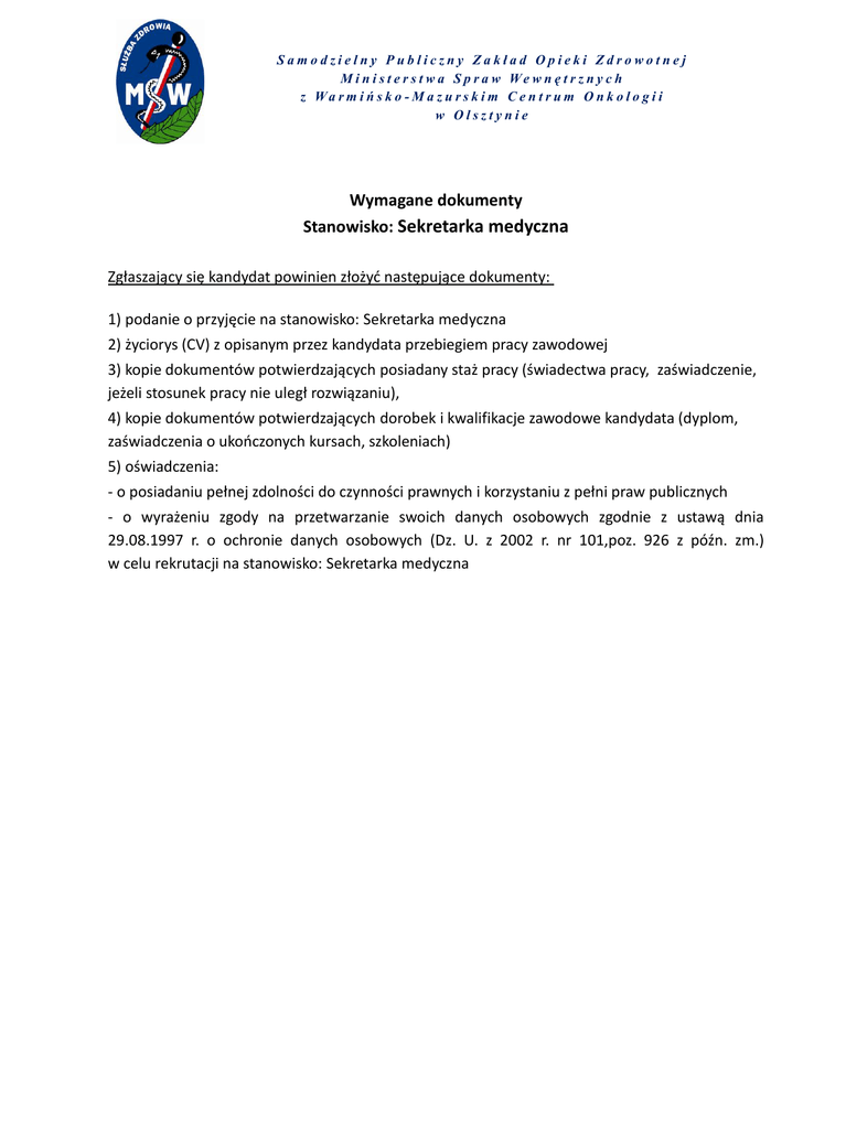 Samodzielny Publiczny Zakład Opieki Zdrowotnej M i n i s t e r s t w a S p r a w We w n ę t r z n y c h z Wa r m i ń s k o - M a z u r s k i m C e n t r u m O n k o l o g i i w Olsztynie Wymagane dokumenty Stanowisko: Sekretarka medyczna Zgłaszający się kandydat powinien złożyd następujące dokumenty: 1) podanie o przyjęcie na stanowisko: Sekretarka medyczna 2) życiorys (CV) z opisanym przez kandydata przebiegiem pracy zawodowej 3) kopie dokumentów potwierdzających posiadany staż pracy (świadectwa pracy, zaświadczenie, jeżeli stosunek pracy nie uległ rozwiązaniu), 4) kopie dokumentów potwierdzających dorobek i kwalifikacje zawodowe kandydata (dyplom, zaświadczenia o ukooczonych kursach, szkoleniach) 5) oświadczenia: - o posiadaniu pełnej zdolności do czynności prawnych i korzystaniu z pełni praw publicznych - o wyrażeniu zgody na przetwarzanie swoich danych osobowych zgodnie z ustawą dnia 29.08.1997 r. o ochronie danych osobowych (Dz. U. z 2002 r. nr 101,poz. 926 z późn. zm.) w celu rekrutacji na stanowisko: Sekretarka medyczna