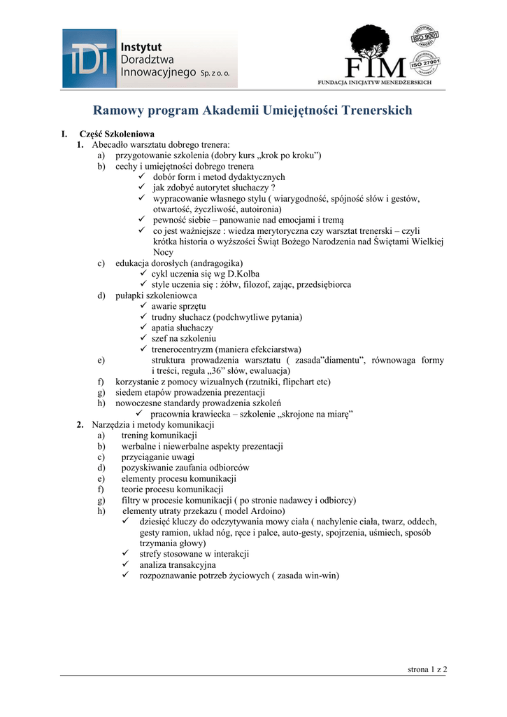 Ramowy program Akademii Umiejętności Trenerskich I. Część Szkoleniowa 1. Abecadło warsztatu dobrego trenera: a) przygotowanie szkolenia (dobry kurs „krok po kroku”) b) cechy i umiejętności dobrego trenera dobór form i metod dydaktycznych jak zdobyć autorytet słuchaczy ? wypracowanie własnego stylu ( wiarygodność, spójność słów i gestów, otwartość, życzliwość, autoironia) pewność siebie – panowanie nad emocjami i tremą co jest ważniejsze : wiedza merytoryczna czy warsztat trenerski – czyli krótka historia o wyższości Świąt Bożego Narodzenia nad Świętami Wielkiej Nocy c) edukacja dorosłych (andragogika) cykl uczenia się wg D.Kolba style uczenia się : żółw, filozof, zając, przedsiębiorca d) pułapki szkoleniowca awarie sprzętu trudny słuchacz (podchwytliwe pytania) apatia słuchaczy szef na szkoleniu trenerocentryzm (maniera efekciarstwa) e) struktura prowadzenia warsztatu ( zasada”diamentu”, równowaga formy i treści, reguła „36” słów, ewaluacja) f) korzystanie z pomocy wizualnych (rzutniki, flipchart etc) g) siedem etapów prowadzenia prezentacji h) nowoczesne standardy prowadzenia szkoleń pracownia krawiecka – szkolenie „skrojone na miarę” 2. Narzędzia i metody komunikacji a) trening komunikacji b) werbalne i niewerbalne aspekty prezentacji c) przyciąganie uwagi d) pozyskiwanie zaufania odbiorców e) elementy procesu komunikacji f) teorie procesu komunikacji g) filtry w procesie komunikacji ( po stronie nadawcy i odbiorcy) h) elementy utraty przekazu ( model Ardoino) dziesięć kluczy do odczytywania mowy ciała ( nachylenie ciała, twarz, oddech, gesty ramion, układ nóg, ręce i palce, auto-gesty, spojrzenia, uśmiech, sposób trzymania głowy) strefy stosowane w interakcji analiza transakcyjna rozpoznawanie potrzeb życiowych ( zasada win-win) strona 1 z 2 3. Elementy retoryki i erystyki zasady : perswazji, stosowności ( decorum), korzyści, aktualności i identyfikacji argumentowanie konstrukcja wypowiedzi skuteczność wypowiedzi warsztat błyskotliwego adwokata, płomiennego kaznodziei, dociekliwego dziennikarza, sugestywnego aktora wystąpienia publiczne wywieranie wpływu na ludzi : reguła wzajemność, zaangażowanie i konsekwencja, społeczny dowód słuszności, lubienie i sympatia, autorytet, niedostępność, zasada kontrastu 4. Emisja Głosu 5. Humor w prowadzeniu szkoleń 6. Trening kreatywnego i twórczego myślenia 7. Zarządzanie firmą szkoleniową: polityka szkoleniowa a zarządzanie zmianą znaczenie procesu grupowego dla przebiegu i efektów szkolenia podejście procesowe ( koło Deminga) przy organizacji szkoleń ○ planowanie identyfikacja i analiza potrzeb szkoleniowych określanie celów szkoleniowych projektowanie szkoleń (sporządzanie oferty szkoleniowej) ○ wykonanie dobór grupy przeprowadzenie szkolenia ○ sprawdzenie czego nauczyli się słuchacze (egzamin) ? jak spisali się organizatorzy ? ( ciasna sala, zimna kawa, nudny wykładowca) co wyniósł ze szkolenia Kowalski ( certyfikat nad łóżkiem) ? co ma z tego firma Kowalskiego (większa sprzedaż, mniej uchylonych decyzji, większy entuzjazm do pracy)? ○ poprawienie właściwy dobór słuchaczy ( na szkolenie jadą ci, którym wiedza jest najbardziej potrzebna a nie ci, którzy zawadzają w biurze) szkolenie a consulting ( kompleksowość usługi) wielka triada szkoleniowa ( zdobywanie wiedzy, doskonalenie umiejętności, kształtowanie postaw) trenerzy wewnętrzni w firmach – nowa epoka w szkoleniach czy schyłek firm szkoleniowych współpraca firmy szkoleniowej z klientami ( sporządzenie raportu, serwis doradczy) II. Sprawdzenie predyspozycji zawodowych i osobowych, coaching (dla uczestników szkolenia) strona 2 z 2