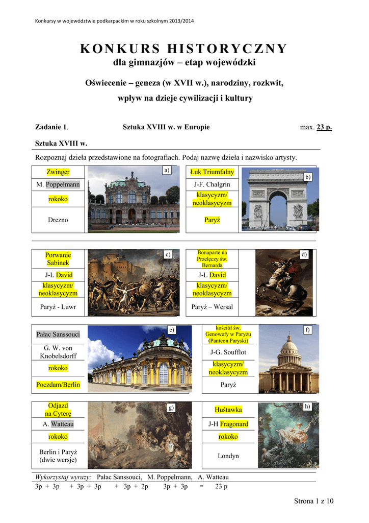 Konkursy w województwie podkarpackim w roku szkolnym 2013/2014 KONKURS HISTORYCZNY dla gimnazjów – etap wojewódzki Oświecenie – geneza (w XVII w.), narodziny, rozkwit, wpływ na dzieje cywilizacji i kultury Zadanie 1. Sztuka XVIII w. w Europie max. 23 p. Sztuka XVIII w. Rozpoznaj dzieła przedstawione na fotografiach. Podaj nazwę dzieła i nazwisko artysty. Zwinger a) Łuk Triumfalny M. Poppelmann J-F. Chalgrin rokoko klasycyzm/ neoklasycyzm Drezno Paryż Porwanie Sabinek c) Bonaparte na Przełęczy św. Bernarda J-L David J-L David klasycyzm/ neoklasycyzm klasycyzm/ neoklasycyzm Paryż - Luwr Paryż – Wersal Pałac Sanssouci e) kościół św. Genowefy w Paryżu (Panteon Paryski) G. W. von Knobelsdorff J-G. Soufflot rokoko klasycyzm/ neoklasycyzm Poczdam/Berlin Paryż Odjazd na Cyterę g) Huśtawka A. Watteau J-H Fragonard rokoko rokoko Berlin i Paryż (dwie wersje) Londyn b) d) f) h) Wykorzystaj wyrazy: Pałac Sanssouci, M. Poppelmann, A. Watteau 3p + 3p + 3p + 3p + 3p + 2p 3p + 3p = 23 p Strona 1 z 10 Konkursy w województwie podkarpackim w roku szkolnym 2013/2014 Zadanie 2. Sztuka XVIII w. w Europie max. 13 p. a) Zaznacz literą „X” cztery prawidłowe odpowiedzi Za panowania jakiego władcy we Francji najbardziej dynamicznie rozwijała się sztuka…: Ludwika XIV Ludwika XV Ludwika XVI Napoleona Bonaparte – klasycyzmu / neoklasycyzmu X – rokoka – baroku X X X a) 4 p. b) Czym charakteryzowała się sztuka: klasycyzmu/ neoklasycyzmu i rokoka. Używaj wyłącznie podanych wyrazów i wyrażeń: zamiłowaniem do małych form, bogactwem elementów zdobniczych, ornamentyką roślinną, harmonią, ładem i klasycznymi proporcjami, tematyką miłosną, wdziękiem i lekkością monumentalizmem w architekturze, niewielką ilością ozdób, nawiązaniem do antyku – klasycyzmu/ neoklasycyzmu – rokoka nawiązaniem do antyku zamiłowanie do małych form ładem i klasycznymi proporcjami tematyką miłosną harmonią niewielką ilością ozdób ornamentyką roślinną bogactwem elementów zdobniczych monumentalizmem w architekturze wdziękiem i lekkością b) 8 p. c) Zaznacz literą „X” prawidłową odpowiedź Odkrycie Herkulanum i Pompei odcisnęło piętno na sztuce: baroku rokoka klasycyzmu/neoklasycyzmu X c) 1 p. Strona 2 z 10 Konkursy w województwie podkarpackim w roku szkolnym 2013/2014 Zadanie 3. Filozofowie – twórcy epoki Oświecenia max. 19 p. I. Kto jest autorem słów: Prawda „myślę więc jestem” była tak niezachwiana i pewna, że wszelkie najbardziej dziwaczne przypuszczenia sceptyków nie zdołały jej zachwiać, uznałem bez obawy błędu, że mogę ją przyjąć jako pierwszą zasadę filozofii, której poszukiwałem. Kiedy w jednej i tej samej osobie władza prawodawcza zespolona jest z wykonawczą, nie ma wolności; ponieważ można się lękać, aby ten sam monarcha albo ten sam senat nie stanowił tyrańskich praw, które będzie tyrańsko wykonywał. Nie ma również wolności, jeśli władza sądowa nie jest oddzielona od prawodawczej i wykonawczej. Gdyby była połączona z władzą prawodawczą, władza nad życiem i wolnością obywateli była by dowolna: sędzia bowiem byłby prawodawcą. Kartezjusz Monteskiusz Oświecenie to wyjście człowieka ze stanu niepełnoletności, w którą popadł z własnej winy. Wolność to prawo czynienia wszystkiego co nie jest zabronione. Kant Monteskiusz 4p II. Którzy z wymienionych filozofów (Monteskiusz, Kant, Kartezjusz, Locke, Spinoza, Leibniz, Rousseau) są autorami zamieszczonych poniżej sentencji/maksym ? Użyj jedynie pięciu spośród podanych nazwisk filozofów. Jakie idee/pojęcia znalazły odbicie w podkreślonych sentencjach ? Użyj jedynie czterech spośród podanych nazw pojęć: ( racjonalizm, empiryzm, panteizm, imperatyw kategoryczny, teodycea) „tabula rasa” („czysta karta”) „Niebo gwiaździste nade mną, prawo moralne we mnie.” nazwisko pojęcie Locke empiryzm Kant „Cokolwiek istnieje, jest w Bogu. Bóg jest Naturą a Natura Bogiem” Spinoza panteizm „Gdyby ten świat nie był najdoskonalszy z możliwych, Bóg by go nie stworzył.” Leibniz teodycea „Człowiek rodzi się wolny i dobry z natury.” „Postępuj wedle, takiej tylko zasady, co do której mógłbyś jednocześnie chcieć, aby stała się prawem powszechnym.” Rousseau Kant imperatyw kategoryczny nazwiska filozofów – 6 p, pojęcia – 4 p Strona 3 z 10 Konkursy w województwie podkarpackim w roku szkolnym 2013/2014 III. Który z wymienionych poniżej filozofów twierdził / głosił: Immanuel Kant, J. J. Rousseau, Kartezjusz, J. Locke a) że nie istnieją idee wrodzone J. Locke b) że punktem wyjścia wszelkiej refleksji jest pewność rozmyślającego co do własnego istnienia Kartezjusz c) że człowiek powinien kierować się w życiu imperatywem moralnym Kant d) hasło powrotu do natury – odejścia od cywilizacji ku stanowi pierwotnej szczęśliwości J.J. Rousseau e) że niektóre idee np. idea Boga są u człowieka wrodzone Kartezjusz 5p Zadanie 4. Wielka rewolucja francuska max. 8 p. Określ kolejność chronologiczną wydarzeń. Zaznacz wszystkie kolejnymi cyframi. Najdawniejsze oznacz cyfrą 1, a najpóźniejsze – 5. Daty zamieszczone poniżej ułatwią Ci udzielenie odpowiedzi: 14 lipca 1789, 26 sierpnia 1789, 3 września 1791, 10 sierpnia 1792, 21 września 1792, 21 stycznia 1793, 2 czerwca 1793, 17 września 1793, 28 lipca 1794, 9 listopada 1799 I a) zniesienie monarchii i ustanowienie republiki 5 21 września 1792 b) zdobycie Tuileries, uwięzienie króla 4 10 sierpnia 1792 c) uchwalenie Konstytucji z 3 września (pierwszej) 3 3 września 1791 d) uchwalenie Deklaracji Praw Człowieka i Obywatela 2 26 sierpnia 1789 e) zburzenie Bastylii, wybuch rewolucji 1 14 lipca 1789 a) przejęcie władzy przez jakobinów 2 2 czerwca 1793 b) początek wielkiego terroru 3 17 września 1793 c) przewrót termidoriański 4 28 lipca 1794 d) zamach stanu z 18 brumaire'a 5 9 listopada 1799 e) ścięc