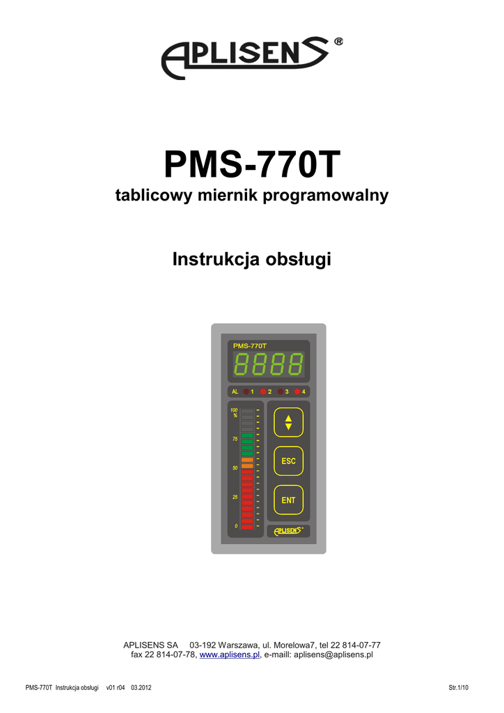 PMS-770T tablicowy miernik programowalny Instrukcja obsługi APLISENS SA 03-192 Warszawa, ul. Morelowa7, tel 22 814-07-77 fax 22 814-07-78, www.aplisens.pl, e-maill: [email protected] PMS-770T Instrukcja obsługi v01 r04 03.2012 Str.1/10 SPIS TREŚCI 1. WSTĘP 1.1 Charakterystyka 1.2 Podstawowe funkcje 1.3 Warunki bezpieczeństwa 1.4 Zakłócenia radioelektryczne 1.5 Oznaczenia 2. INSTALACJA MIERNIKA 2.1 Zawartość opakowania 2.2 Montaż 2.3 Podłączenie elektryczne 2.4 Konserwacja 3. OBSŁUGA MIERNIKA 3.1 Programowanie 3.2 Ustawianie progów alarmowych 3.3 Komunikaty błędów 3.4 Test wyświetlaczy i wyjść 4. DANE TECHNICZNE 5. HISTORIA MODYFIKACJI 6. INFORMACJA O POSTĘPOWANIU ZE ZUŻYTYM SPRZĘTEM Stosowane oznaczenia SYMBOL OPIS Ostrzeżenie o niebezpieczeństwie porażenia elektrycznego. Ostrzeżenie o konieczności ścisłego stosowania informacji zawartych w dokumentacji dla zapewnienia bezpieczeństwa i pełnej funkcjonalności urządzenia. Informacje szczególnie przydatne przy instalacji i eksploatacji urządzenia. Informacja o postępowaniu ze zużytym sprzętem PMS-770T Instrukcja obsługi v01 r04 03.2012 Str.2/10 1. WSTĘP 1.1 Charakterystyka. PMS-770T jest miernikiem programowalnym przeznaczonym do zastosowań przemysłowych. Może być wykorzystany do pomiaru standardowych sygnałów prądowych i napięciowych pochodzących z elektronicznych przetworników pomiarowych. Szeroki zakres napięć zasilania pozwala pracować w typowych sieciach zasilania 230VAC oraz 110VAC 1.2 Podstawowe funkcje Pomiar - Miernik pozwala na cyfrowy odczyt wejściowego sygnału prądowego lub napięciowego. Odczyt może być swobodnie programowany. Użytkownik ma możliwość określenia liniowej charakterystyki przetwarzania (skalowanie 2 punktowe) lub kształtować charakterystykę nieliniową (odcinkami liniową) poprzez skalowanie wielopunktowe. Można też zaprogramować położenie kropki dziesiętnej, zaokrąglanie odczytu i stopień filtracji cyfrowej. Wyświetlacz cyfrowy i wskaźnik linijkowy - Miernik PMS-770T posiada w górnej części wyświetlacz cyfrowy oraz poniżej - kolorowy wskaźnik linijkowy, pokazujący poziom sygnału na skali procentowej i nastawione progi alarmowe. Linijka może pracować w trybie jednokolorowym lub trójkolorowym, pokazując zaprogramowane przedziały mierzonej wartości. Zasilacz pomocniczy - Miernik wyposażony jest w izolowany galwanicznie zasilacz pomocniczy 24VDC przeznaczony do polaryzacji przetworników z wyjściem prądowym. Wyjścia sterujące - Miernik posiada 4 przekaźniki służące do sygnalizacji i sterowania. Progi zadziałania przekaźników są programowane. Przekaźniki mogą się załączać lub wyłączać przy przekroczeniu zaprogramowanego poziomu. Stan przekaźników jest sygnalizowany przez diody świecące na płycie czołowej. Wyjście analogowe - Miernik wyposażony jest w prądowe wyjście analogowe. Zakres zmiany prądu na tym wyjściu jest osobno programowany. 1.3 Warunki bezpieczeństwa Miernik musi być zainstalowany i eksploatowany zgodnie z niniejszą dokumentacją. W szczególności instalacja zasilająca 230V i obwody sterownicze 230V dołączone do wyjść przekaźnikowych powinny zostać zaprojektowane i wykonane przez uprawniony personel, zgodnie z obowiązującymi dla danej instalacji normami i przepisami. Dla zapobieżenia porażeniu elektrycznemu zaleca się: -ściśle stosować się do instrukcji obsługi, -wyłączyć zasilanie w czasie montażu i podłączania miernika, -nie używać miernika w atmosferze palnej i grożącej wybuchem, -nie narażać miernika na deszcz i wilgoć, -zapewnić wentylację utrzymującą temperaturę pracy w dopuszczalnych granicach, -nie używać miernika w stanie uszkodzenia. 1.4 Zakłócenia radioelektryczne Urządzenie spełnia wymagania EMC w zakresie normy EN 61326-1 dla środowiska przemysłowego. W środowisku przemysłowym miernik może podlegać zakłóceniom przewodzonym przez przewody zasilające, sterujące i pomiarowe oraz zakłóceniom elektromagnetycznym pochodzącym od innych urządzeń elektrycznych. Celem zapobieżenia wpływowi zakłóceń na pracę miernika zaleca się: - montowanie miernika w oddaleniu od urządzeń elektroenergetycznych, - prowadzenie przewodów dołączonych do miernika, zwłaszcza pomiarowych, osobno od przewodów elektroenergetycznych i innych instalacji kablowych, PMS-770T Instrukcja obsługi v01 r04 03.2012 Str.3/10 - stosowanie skręconych i/lub ekranowanych przewodów pomiarowych, - stosowanie uziemienia obwodów pomiarowych zgodnie z dokumentacją, - stosowanie dodatkowych odgromników na liniach długich, wychodzących poza obręb budynków, - stosowanie dodatkowych filtrów przeciwzakłóceniowych w przypadku nieuniknionego sąsiedztwa z urządzeniami elektrycznymi dużej mocy. 1.5 Oznaczenia PMS-770T - programowalny miernik tablicowy 2. INSTALACJA MIERNIKA 2.1 Zawartość opakowania. Opakowanie fabryczne miernika zawiera odpowiednio: miernik PMS-770T zaczepy mocujące instrukcję obsługi szt. 1 kpl. 1 szt. 1 Rys.1 Widok i wymiary miernika PMS-770T 2.2 Montaż Miernik przystosowany jest do montażu w tablicach sterowniczych. Otwór w tablicy powinien być wykonany zgodnie z danymi technicznymi, z zachowaniem odpowiednich odstępów od sąsiednich przyrządów. Miernik wstawia się w otwór montażowy od strony przedniej (operatora). Zmontować zaczepy wkładając wkręty w otwory. Następnie włożyć zaczepy w otwory w górnej i dolnej ściance obudowy i przesunąć je ku tyłowi. Wkręty w zaczepach należy wkręcić do lekkiego oporu, aby unieruchomić obudowę w tablicy. 2.3 Podłączenie elektryczne Wszystkie czynności montażu elektrycznego należy wykonywać przy wyłączonym napięciu zasilającym! Do wejścia pomiarowego należy podłączać tylko jeden wybrany typ czujnika – prądowy albo napięciowy. Przed wykonaniem połączeń elektrycznych miernik powinien być umocowany w tablicy. Wszystkie przewody zasilają