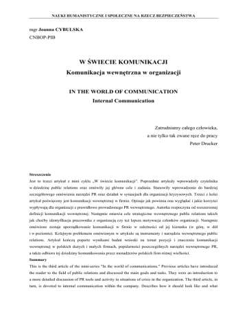 NAUKI HUMANISTYCZNE I SPOŁECZNE NA RZECZ BEZPIECZEŃSTWA mgr Joanna CYBULSKA CNBOP-PIB W ŚWIECIE KOMUNIKACJI Komunikacja wewnętrzna w organizacji IN THE WORLD OF COMMUNICATION Internal Communication Zatrudniamy całego człowieka, a nie tylko tak zwane ręce do pracy Peter Drucker Streszczenie Jest to trzeci artykuł z mini cyklu „W świecie komunikacji”. Poprzednie artykuły wprowadziły czytelnika w dziedzinę public relations oraz omówiły jej główne cele i zadania. Stanowiły wprowadzenie do bardziej szczegółowego omówienia narzędzi PR oraz działań w sytuacjach dla organizacji kryzysowych. Trzeci z kolei artykuł poświęcony jest komunikacji wewnętrznej w firmie. Opisuje jak powinna ona wyglądać i jakie korzyści wypływają dla organizacji z prawidłowo prowadzonego PR wewnętrznego. Autorka rozpoczyna od rozszerzonej definicji komunikacji wewnętrznej. Następnie omawia cele strategiczne wewnętrznego public relations takich jak choćby identyfikacja pracownika z organizacją czy też lepsza motywacja członków organizacji. Następnie omówione zostaje uporządkowanie komunikacji w firmie w zależności od jej kierunku (w górę, w dół i w poziomie). Kolejnym problemem omówionym w artykule są instrumenty i narzędzia wewnętrznego public relations. Artykuł kończą poparte wynikami badań wnioski na temat pozycji i znaczenia komunikacji wewnętrznej w polskich dużych i małych firmach, popularności poszczególnych narzędzi wewnętrznego PR, a także odbioru tej dziedziny komunikowania przez menadżerów polskich firm różnej wielkości. Summary This is the third article of the mini-series "In the world of communications." Previous articles have introduced the reader to the field of public relations and discussed the main goals and tasks. They were an introduction to a more detailed discussion of PR tools and activity in situations of crisis in the organization. The third article, in turn, is devoted to internal communication within the company. Describes how it should look like and what NAUKI HUMANISTYCZNE I SPOŁECZNE NA RZECZ BEZPIECZEŃSTWA benefits derive for the organization of a properly conducted internal PR. The author begins with an expanded definition of internal communication. Then discusses the strategic objectives of the internal public relations, such as for example an employee identification with the organization or a better motivation of members of the organization. Next discussed is an organization of the communication within the company depending on its direction (up, down and horizontally). Another problem discussed in the article are internal instruments and tools of public relations. Article ends, supported by results of research, findings on the position and importance of internal communication in Polish large and small companies, the popularity of the various internal tools of PR, as well as the receipt of this field of communication by managers of Polish companies of all sizes. Słowa kluczowe: public relations, komunikacja wewnętrzna, narzędzia komunikacji wewnętrznej, cele komunikacji wewnętrznej; Keywords: public relations, internal communication, tools of internal communication, golas of internal communication; Wstęp Poprzednie artykuły przybliżające wiedzę na temat public relations przekazały informacje na temat potrzeby komunikacji z otoczeniem. Wprowadziły czytelnika w dziedzinę public relations, jej główne cele i zadania. Wskazały korzyści dla organizacji wynikające ze sprawnej pracy działu PR. Stanowiły wprowadzenie do omówienia narzędzi PR, działań PR w sytuacjach dla organizacji kryzysowych, oceny pracy działu PR w osiąganiu założonych przez organizację celów. Aby jednak organizacja dobrze radziła sobie w dziedzinie komunikacji z otoczeniem zewnętrznym, a także w sytuacjach kryzysowych, które zdarzają się w każdej, nawet najlepiej zarządzanej organizacji, potrzebna jest systematyczna i właściwie prowadzona komunikacja wewnętrzna. To ten rodzaj komunikowania się zapewnia dobrze poinformowaną, skonsolidowaną załogę firmy, która w otoczeniu wewnętrznym i zewnętrznym pełni rolę rzeczników organizacji. Komunikacja wewnętrzna – definicja i cele Wiele jest różnych definicji określających czym jest komunikacja wewnętrzna. Różnią się czasami sformułowaniami, ale niewątpliwie mają wiele cech wspólnych, podkreślających cele podejmowanych działań. Można powiedzieć, iż komunikacja wewnętrzna to dziś pojęcie znacznie szersze niż umowna książka skarg i zażaleń, czy gazetka pracownicza. W procesie kierowania każdym przedsiębiorstwem coraz większego znaczenia nabiera umiejętność NAUKI HUMANISTYCZNE I SPOŁECZNE NA RZECZ BEZPIECZEŃSTWA pozyskiwania zainteresowania i identyfikacji pracowników z celami firmy oraz polityką jej kierownictwa. Potrzeba zaplanowanego działania, którego celem będzie pozyskanie akceptacji pracowników dla ważnych idei i zwiększenie ich wydajności poprzez odpowiednie zarządzanie informacją. Jest to dziś podstawowym wyzwaniem, które stoi przed nowoczesnymi managerami. Trudno powiedzieć dlaczego to jakże ważne narzędzie zarządzania firmą jest tak często niedoceniane. Przecież bez sprawnego porozumiewania się z pracownikami firmy nie jest możliwe jej dobre funkcjonowanie. To, jakie opinie będą przekazywali pracownicy swoim znajomym i rodzinie jest istotne dla postrzegania organizacji przez jej najbliższe otoczenie. Teoretycy i praktycy public relations są zgodni, że komunikacja wewnątrz organizacji powinna być fundamentem wszystkich innych działań PR. Zanim bardziej szczegółowo omówione zostaną cele i narzędzia właściwie prowadzonej komunikacji wewnętrznej (wewnętrznego public relations) warto jeszcze w skrócie wspomnieć, iż ten rodzaj komunikowania wpływa nie tylko na wspomniane public relations w bliższym (a także w rezultacie w dalszym) otoczeniu firmy czyli oddziaływanie inform