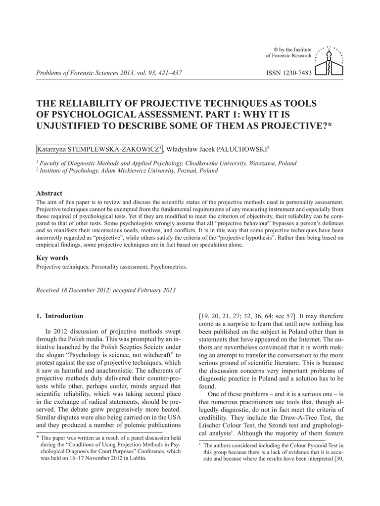 Problems of Forensic Sciences 2013, vol. 93, 421–437 The reliabiliTy of projecTive Techniques as Tools of psychological assessmenT. parT 1: Why iT is unjusTified To describe some of Them as projecTive?* Katarzyna StemplewSka-Żakowicz1 , władysław Jacek paluchowSki2 Faculty of Diagnostic Methods and Applied Psychology, Chodkowska University, Warszawa, Poland InstituteofPsychology,AdamMickiewiczUniversity,Poznań,Poland 1 2 abstract the aim of this paper is to review and discuss the scientific status of the projective methods used in personality assessment. projective techniques cannot be exempted from the fundamental requirements of any measuring instrument and especially from those required of psychological tests. Yet if they are modified to meet the criterion of objectivity, their reliability can be compared to that of other tests. Some psychologists wrongly assume that all “projective behaviour” bypasses a person’s defences and so manifests their unconscious needs, motives, and conflicts. it is in this way that some projective techniques have been incorrectly regarded as “projective”, while others satisfy the criteria of the “projective hypothesis”. Rather than being based on empirical findings, some projective techniques are in fact based on speculation alone. Key words projective techniques; personality assessment; psychometrics. Received 18 December 2012; accepted February 2013 1. introduction in 2012 discussion of projective methods swept through the polish media. this was prompted by an initiative launched by the polish Sceptics Society under the slogan “psychology is science, not witchcraft” to protest against the use of projective techniques, which it saw as harmful and anachronistic. the adherents of projective methods duly delivered their counter-protests while other, perhaps cooler, minds argued that scientific reliability, which was taking second place in the exchange of radical statements, should be preserved. the debate grew progressively more heated. Similar disputes were also being carried on in the uSa and they produced a number of polemic publications * this paper was written as a result of a panel discussion held during the “conditions of using projection methods in psychological Diagnosis for court purposes” conference, which was held on 16–17 November 2012 in lublin. [19, 20, 21, 27; 32, 36, 64; see 57]. it may therefore come as a surprise to learn that until now nothing has been published on the subject in poland other than in statements that have appeared on the internet. the authors are nevertheless convinced that it is worth making an attempt to transfer the conversation to the more serious ground of scientific literature. this is because the discussion concerns very important problems of diagnostic practice in poland and a solution has to be found. one of these problems – and it is a serious one – is that numerous practitioners use tools that, though allegedly diagnostic, do not in fact meet the criteria of credibility. they include the Draw-a-tree test, the lüscher colour test, the Szondi test and graphological analysis1. although the majority of them feature 1 the authors considered including the colour pyramid test in this group because there is a lack of evidence that it is accurate and because where the results have been interpreted [30, 422 K.Stemplewska-Żakowicz,W.J.Paluchowski the word “test” in their name, none in fact is one. to recognise a given procedure as a psychological test, it must meet five conditions [25]: that a procedure is set out (1– standardisation), that there is a way of interpreting the results so that all diagnosticians can obtain more or less the same results (2 – objectivity), that validation studies with positive results have been carried out (3 – accuracy and 4 – reliability) and that norms exist (5 – normalisation). the techniques listed above either do not meet the majority of these conditions or meet none whatsoever. we shall return to this issue elsewhere in the article. what is more, although they are often called projective techniques, they are not projective techniques. the reason for this, speaking in general terms, is that they are not based on the “projective hypothesis”2, but on a belief – impossible to explain rationally – that a set of interdependencies exist between partial aspects of the products and preferences of a person, the overall conditions of their personalities and facts from their life histories. the interpretation of projective material is based here on a sign system [32], whereby specific characteristics of a drawing, such as the size of a figure, a drawing of a hollow, or a subject’s preference for violet rather than green are assigned a universal symbolic meaning that is the same for everyone. Systems of “interpretation” are thus created that resemble an egyptian dream book, in which drawing a big figure is interpreted as meaning self-confidence and high self-esteem, while drawing a small one as expressing a lack of self-confidence and low self-esteem. this has nothing to do with projection and projective techniques. let us now proceed to a more detailed discussion of ways in which we may understand projection and projective techniques. 2 pp. 86–87] there have been misinterpretations in the assessments and suspicions of pathology in the person examined. Yet the tool is interesting and can be appreciated in that it bases its interpretations on formal indicators (actuarial interpretation based on discriminative functions). See also the numerous studies of the test [52, 53]. hence it is worth devoting a separate paper to it. according to Frank [14; see also 39, p. 531; 55, 65] this concerns a situation in which people try to categorise and systematize unclear, cloudy, poly-semantic and unstructured stimuli. these interpretations are concordant with their own individual pattern of conscious and unconscious needs, fears, wishes, impulses, con