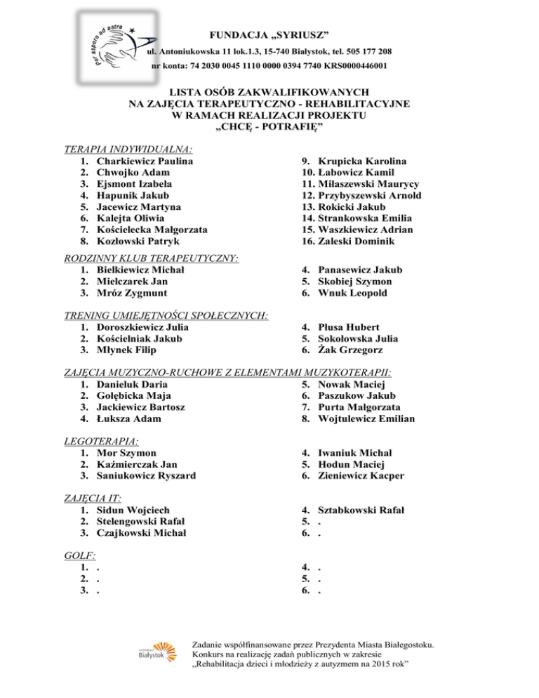 FUNDACJA „SYRIUSZ” ul. Antoniukowska 11 lok.1.3, 15-740 Białystok, tel. 505 177 208 nr konta: 74 2030 0045 1110 0000 0394 7740 KRS0000446001 LISTA OSÓB ZAKWALIFIKOWANYCH NA ZAJĘCIA TERAPEUTYCZNO - REHABILITACYJNE W RAMACH REALIZACJI PROJEKTU „CHCĘ - POTRAFIĘ” TERAPIA INDYWIDUALNA: 1. Charkiewicz Paulina 2. Chwojko Adam 3. Ejsmont Izabela 4. Hapunik Jakub 5. Jacewicz Martyna 6. Kalejta Oliwia 7. Kościelecka Małgorzata 8. Kozłowski Patryk 9. Krupicka Karolina 10. Łabowicz Kamil 11. Miłaszewski Maurycy 12. Przybyszewski Arnold 13. Rokicki Jakub 14. Strankowska Emilia 15. Waszkiewicz Adrian 16. Zaleski Dominik RODZINNY KLUB TERAPEUTYCZNY: 1. Bielkiewicz Michał 2. Mielczarek Jan 3. Mróz Zygmunt 4. Panasewicz Jakub 5. Skobiej Szymon 6. Wnuk Leopold TRENING UMIEJĘTNOŚCI SPOŁECZNYCH: 1. Doroszkiewicz Julia 2. Kościelniak Jakub 3. Młynek Filip 4. Płusa Hubert 5. Sokołowska Julia 6. Żak Grzegorz ZAJĘCIA MUZYCZNO-RUCHOWE Z ELEMENTAMI MUZYKOTERAPII: 1. Danieluk Daria 5. Nowak Maciej 2. Gołębicka Maja 6. Paszukow Jakub 3. Jackiewicz Bartosz 7. Purta Małgorzata 4. Łuksza Adam 8. Wojtulewicz Emilian LEGOTERAPIA: 1. Mor Szymon 2. Kaźmierczak Jan 3. Saniukowicz Ryszard 4. Iwaniuk Michał 5. Hodun Maciej 6. Zieniewicz Kacper ZAJĘCIA IT: 1. Sidun Wojciech 2. Stelengowski Rafał 3. Czajkowski Michał 4. Sztabkowski Rafał 5. . 6. . GOLF: 1. . 2. . 3. . 4. . 5. . 6. . Zadanie współfinansowane przez Prezydenta Miasta Białegostoku. Konkurs na realizację zadań publicznych w zakresie „Rehabilitacja dzieci i młodzieży z autyzmem na 2015 rok”