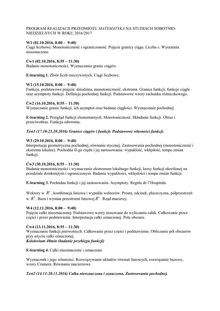 PROGRAM REALIZACJI PRZEDMIOTU MATEMATYKA NA STUDIACH SOBOTNIONIEDZIELNYCH W ROKU 2016/2017 W1 (01.10.2016, 8:00 – 9:40) Ciągi liczbowe. Monotoniczność i ograniczoność. Pojęcie granicy ciągu. Liczba e. Wyrażenia nieoznaczone. Ćw1 (02.10.2016, 8:55 – 11:30) Badanie monotoniczności. Wyznaczanie granic ciągów. E-learning 1. Zbiór liczb rzeczywistych. Ciągi liczbowe. W2 (15.10.2016, 8:00 – 9:40) Funkcje, podstawowe pojęcia: dziedzina, monotoniczność, ekstrema. Granica funkcji; funkcje ciągłe oraz asymptoty funkcji. Definicja pochodnej funkcji. Podstawowe wzory rachunku różniczkowego. Ćw2 (16.10.2016, 8:55 – 11:30) Wyznaczanie granic funkcji, ich asymptot oraz badanie ciągłości. Wyznaczanie pochodnej. E-learning 2. Przegląd funkcji elementarnych. Monotoniczność. Składanie funkcji. Obraz i przeciwobraz. Funkcja odwrotna. Test1 (17.10-23.10.2016) Granice ciągów i funkcji. Podstawowe własności funkcji. W3 (29.10.2016, 8:00 – 9:40) Interpretacja geometryczna pochodnej, równanie stycznej. Zastosowania pochodnej (monotoniczność i ekstrema lokalne). Pochodna II-go rzędu i jej zastosowania: wypukłość, wklęsłość, tempo zmian funkcji. Ćw3 (30.10.2016, 8:55 – 11:30) Badanie monotoniczności i wyznaczanie ekstremum lokalnego funkcji, kresy funkcji określonej na przedziale domkniętym i ograniczonym. Badanie wypukłości, wklęsłości i tempa zmian funkcji. E-learning 3. Pochodna funkcji i jej zastosowania. Asymptoty. Reguła de l’Hospitala. Wektory w R n , kombinacja liniowa i wypukła wektorów. Prosta, odcinek, płaszczyzna, półprzestrzeń w R 3 . Baza i wymiar przestrzeni liniowej R n . Rząd macierzy. W4 (12.11.2016, 8:00 – 9:40) Pojęcie całki nieoznaczonej. Podstawowe wzory stosowane do wyliczania całek. Całkowanie przez części i przez podstawienie. Interpretacja całki oznaczonej. Pole obszaru. Ćw4 (13.11.2016, 8:55 – 11:30) Wyznaczanie funkcji pierwotnych. Całkowanie przez części i podstawienie. Obliczanie pól obszarów przy użyciu całki oznaczonej. Kolokwium 40min (badanie przebiegu funkcji) E-learning 4. Całki nieoznaczone i oznaczone. Wyznacznik i jego własności. Rozwiązywanie układów równań liniowych, rozwiązanie bazowe, wzory Cramera. Równania macierzowe. Test2 (14.11-20.11.2016) Całka nieoznaczona i oznaczona. Zastosowania pochodnej. W5 (26.11.2016, 8:00 – 9:40) Macierze: definicja, klasyfikacja, działania na macierzach, macierz odwrotna. Wektory, kombinacja liniowa, liniowa niezależność wektorów, rząd macierzy. Definicja rekurencyjna wyznacznika. Ćw5 (27.11.2016, 8:55 – 11:30) Działania na wektorach i macierzach, badanie liniowej niezależności wektorów, wyznaczanie rzędu macierzy. Obliczanie wyznacznika macierzy (też 4x4). E-learning 5. Przestrzenie liniowe. Liniowa niezależność. W6 (10.12.2016, 8:00 – 9:40) Własności wyznaczników. Macierz dopełnień algebraicznych a macierz odwrotna. Operacje elementarne na wierszach oraz zastosowanie do odwracania macierzy i do układów równań liniowych. Ćw6 (11.12.2016, 8:55 – 11:30) Odwracanie macierzy. Proste równania macierzowe. Sprowadzanie macierzy do postaci bazowej przy pomocy operacji elementarnych. Wzory Cramera. E-learning 6. Rząd macierzy. Minory. Wyznaczniki i ich zastosowania. W7 (07.01.2017, 8:00 – 9:40) Układy równań liniowych, zapis rozwiązania ogólnego, Twierdzenie Kroneckera - Capelliego. Rozwiązania bazowe. Wstęp do funkcji dwóch zmiennych: dziedzina, warstwice. Ćw7 (08.01.2017, 8:55 – 11:30) Rozwiązywanie układów równań liniowych, rozwiązanie ogólne, szczególne. Wyznaczanie rozwiązań bazowych. Wyznaczanie dziedziny funkcji dwóch zmiennych oraz rysowanie mapy warstwic. E-learning 7. Układy równań. Test3 (09.01-15.01.2017) Wektory i macierze. Wyznaczniki. Układy równań. W8 (21.01.2017, 8:00 – 9:40) Pochodne cząstkowe pierwszego i drugiego rzędu. Punkty stacjonarne i ekstrema lokalne funkcji. Ćw8 (22.01.2017, 8:55 – 11:30) Wyznaczanie pochodnych cząstkowych. Szukanie ekstremów lokalnych funkcji dwóch zmiennych. Kolokwium 40min (algebra liniowa) E-learning 8. Pochodna kierunkowa. Ekstrema funkcji dwóch zmiennych. Zasady zaliczania przedmiotu MATEMATYKA 1. Przedmiot kończy się egzaminem w sesji zimowej, w trakcie którego należy rozwiązać pięć zadań każde zadanie za 6 punktów. Do sumy punktów z zadań egzaminacyjnych dodajemy punkty za zaliczenie ćwiczeń (patrz punkt 2), a ostateczną ocenę podaje tabela: Ocena końcowa Niedostatecznie (2) Dostatecznie (3) Dostatecznie plus (3.5) Dobrze (4) Dobrze plus (4.5) Bardzo dobrze (5) Liczba punktów 0 - 15 16 - 18 19 - 21 22 - 24 25 - 27 28+ 2. Do sumy punktów z zadań egzaminacyjnych dodajemy punkty za zaliczenie ćwiczeń zgodnie z tabelą: Ocena z ćwiczeń Dostatecznie Dostatecznie plus (3.5) Dobrze (4) Dobrze plus (4.5) Bardzo dobrze (5) Punkty dodawane 0 +1 +2 +3 +4 3. Student musi uzyskać zaliczenie ćwiczeń, tj. ocenę co najmniej dostateczną, aby przystąpić do egzaminu. W trakcie semestru odbędą się dwa kolokwia z których można uzyskać po 30 punktów; do punktów z kolokwiów zostanie dodany wynik z testów e-learningowych (patrz p.4). Wynik podzielony przez 2 daje ocenę z ćwiczeń zgodnie z powyższą tabelą ocen. 4. Udział studentów w testach e-learningowych nie jest obowiązkowy, jednakże stwarza on możliwość poprawienia wyniku zaliczenia ćwiczeń. Za każdy zaliczony test można uzyskać do 3 punktów. Suma punktów zostanie dodana do punktów uzyskanych z dwóch kolokwiów (maksimum 9p. dodatkowych). 5. Osoby, które w trakcie zajęć nie napisały któregoś z kolokwiów z usprawiedliwionych powodów (zwolnienie lekarskie) mogą uzyskać zaliczenie w dodatkowym terminie, wyznaczonym przez prowadzącego zajęcia przed pierwszym terminem egzaminu. 6. Osoby, które nie uzyskały zaliczenia ćwiczeń przed pierwszym terminem egzaminu mogą przystąpić do zaliczenia poprawkowego w terminie