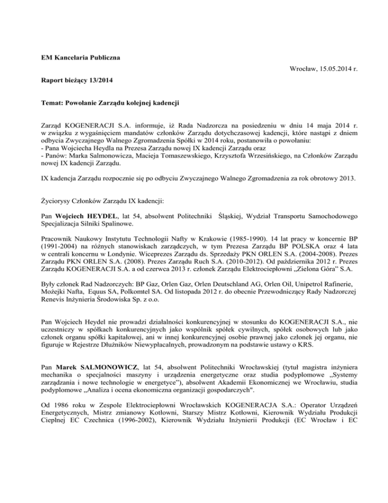 EM Kancelaria Publiczna Wrocław, 15.05.2014 r. Raport bieżący 13/2014 Temat: Powołanie Zarządu kolejnej kadencji Zarząd KOGENERACJI S.A. informuje, iż Rada Nadzorcza na posiedzeniu w dniu 14 maja 2014 r. w związku z wygaśnięciem mandatów członków Zarządu dotychczasowej kadencji, które nastąpi z dniem odbycia Zwyczajnego Walnego Zgromadzenia Spółki w 2014 roku, postanowiła o powołaniu: - Pana Wojciecha Heydla na Prezesa Zarządu nowej IX kadencji Zarządu oraz - Panów: Marka Salmonowicza, Macieja Tomaszewskiego, Krzysztofa Wrzesińskiego, na Członków Zarządu nowej IX kadencji Zarządu. IX kadencja Zarządu rozpocznie się po odbyciu Zwyczajnego Walnego Zgromadzenia za rok obrotowy 2013. Życiorysy Członków Zarządu IX kadencji: Pan Wojciech HEYDEL, lat 54, absolwent Politechniki Śląskiej, Wydział Transportu Samochodowego Specjalizacja Silniki Spalinowe. Pracownik Naukowy Instytutu Technologii Nafty w Krakowie (1985-1990). 14 lat pracy w koncernie BP (1991-2004) na różnych stanowiskach zarządczych, w tym Prezesa Zarządu BP POLSKA oraz 4 lata w centrali koncernu w Londynie. Wiceprezes Zarządu ds. Sprzedaży PKN ORLEN S.A. (2004-2008). Prezes Zarządu PKN ORLEN S.A. (2008). Prezes Zarządu Ruch S.A. (2010-2012). Od października 2012 r. Prezes Zarządu KOGENERACJI S.A. a od czerwca 2013 r. członek Zarządu Elektrociepłowni „Zielona Góra” S.A. Były członek Rad Nadzorczych: BP Gaz, Orlen Gaz, Orlen Deutschland AG, Orlen Oil, Unipetrol Rafinerie, Możejki Nafta, Equus SA, Polkomtel SA. Od listopada 2012 r. do obecnie Przewodniczący Rady Nadzorczej Renevis Inżynieria Środowiska Sp. z o.o. Pan Wojciech Heydel nie prowadzi działalności konkurencyjnej w stosunku do KOGENERACJI S.A., nie uczestniczy w spółkach konkurencyjnych jako wspólnik spółek cywilnych, spółek osobowych lub jako członek organu spółki kapitałowej, ani w innej konkurencyjnej osobie prawnej jako członek jej organu, nie figuruje w Rejestrze Dłużników Niewypłacalnych, prowadzonym na podstawie ustawy o KRS. Pan Marek SALMONOWICZ, lat 54, absolwent Politechniki Wrocławskiej (tytuł magistra inżyniera mechanika o specjalności maszyny i urządzenia energetyczne oraz studia podyplomowe „Systemy zarządzania i nowe technologie w energetyce”), absolwent Akademii Ekonomicznej we Wrocławiu, studia podyplomowe „Analiza i ocena ekonomiczna organizacji gospodarczych". Od 1986 roku w Zespole Elektrociepłowni Wrocławskich KOGENERACJA S.A.: Operator Urządzeń Energetycznych, Mistrz zmianowy Kotłowni, Starszy Mistrz Kotłowni, Kierownik Wydziału Produkcji Cieplnej EC Czechnica (1996-2002), Kierownik Wydziału Inżynierii Produkcji (EC Wrocław i EC Czechnica) (2002-2005), Zastępca Dyrektora Produkcji (2005-2008), Zastępca Dyrektora Rozwoju Przemysłowego Ds. Infrastruktury EC Czechnica (2008-2010), Główny Inżynier EC Czechnica (2010-2012), Kierownik Inżynierii Produkcji (2012-2013), Dyrektor Techniczny od 2013 r. Były członek Rad Nadzorczych: PPO Siechnice Sp. z o.o., KOGENERACJA S.A. (członek a następnie Wiceprzewodniczący), Diagpom Sp. z o.o. Członek Zarządu KOGENERACJI S.A. od 24 września 2013 r. Pan Marek Salmonowicz nie prowadzi działalności konkurencyjnej w stosunku do KOGENERACJI S.A., nie uczestniczy w spółkach konkurencyjnych jako wspólnik spółek cywilnych, spółek osobowych lub jako członek organu spółki kapitałowej, ani w innej konkurencyjnej osobie prawnej jako członek jej organu, nie figuruje w Rejestrze Dłużników Niewypłacalnych, prowadzonym na podstawie ustawy o KRS. Pan Maciej TOMASZEWSKI, 42 lata, magister ekonomii, absolwent Akademii Ekonomicznej we Wrocławiu (1996), studia podyplomowe: Zarządzanie Systemami Przemysłowymi - Studium Polskie Politechnika Wrocławska – „Ecole Nationale Superieure des Mines de Saint Etienne” (2002-2003). Od ukończenia studiów związany z Elektrociepłownią „Zielona Góra” S.A. Początkowo z obszarem finansów. W 1997 roku uczestniczył w przygotowaniu i wdrożeniu controllingu w Elektrociepłowni „Zielona Góra” S.A. a od 2004 roku kierownik Wydziału Budżetu i Controllingu. Od 2009 roku objął funkcje zastępcy dyrektora ds. handlu i jakości a od 2010 roku dyrektora ds. handlu i jakości. W latach 2006-2009 pełnił funkcję przewodniczącego Rady Nadzorczej Przedsiębiorstwa Remontowego Elektrociepłowni „ECeRemont” Spółka z o.o. Zaangażowany w rozwój kogeneracji, działając miedzy innymi na rzecz Polskiego Towarzystwa Elektrociepłowni Zawodowych. Brał udział w pracach legislacyjnych nad ustawą rozwiązującą Kontrakty Długoterminowe w 2008 roku. Lider wielu projektów prowadzonych w ramach grupy EDF. Pan Maciej Tomaszewski pełniąc funkcję członka zarządu KOGENERACJI S.A. będzie nadal dyrektorem ds. handlu i jakości w Elektrociepłowni „Zielona Góra” S.A. Pan Maciej Tomaszewski nie prowadzi działalności konkurencyjnej w stosunku do KOGENERACJI S.A., nie uczestniczy w spółkach konkurencyjnych jako wspólnik spółek cywilnych, spółek osobowych lub jako członek organu spółki kapitałowej, ani w innej konkurencyjnej osobie prawnej jako członek jej organu, nie figuruje w Rejestrze Dłużników Niewypłacalnych, prowadzonym na podstawie ustawy o KRS. Pan Krzysztof WRZESIŃSKI, lat 49, dyplomy: magistra na Wydziale Mat.-Fiz.-Chem. - specjalność „Fizyka doświadczalna” oraz magistra na Wydziale Nauk Ekonomicznych i Zarządzania - kierunek: „Zarządzanie finansami” zdobył na Uniwersytecie Mikołaja Kopernika w Toruniu. Ukończył podyplomowe studia menedżerskie w Wielkopolskiej Szkole Biznesu przy Akademii Ekonomicznej w Poznaniu, posiada również dyplom Master of Business Administration brytyjskiej uczelni - The Nottingham Trent University. Od 2002 r. pracuje w Zespole Elektrociepłowni Wrocławskich KOGENERACJA S.A. na stanowisku Dyrektora Finansowego, a w latach 2009 - 2011 również jako Dyrektor HR. Od 2006 r. jest Członki