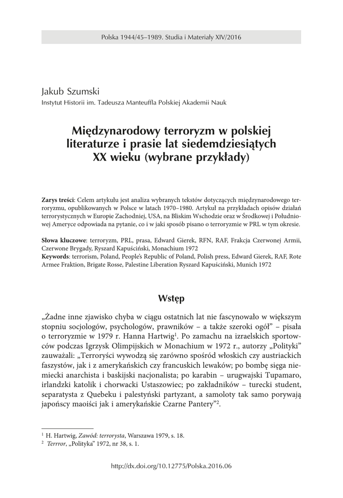 Polska 1944/45–1989. Studia i Materiały XIV/2016 Jakub Szumski Instytut Historii im. Tadeusza Manteuffla Polskiej Akademii Nauk Międzynarodowy terroryzm w polskiej literaturze i prasie lat siedemdziesiątych XX wieku (wybrane przykłady) Zarys treści: Celem artykułu jest analiza wybranych tekstów dotyczących międzynarodowego terroryzmu, opublikowanych w Polsce w latach 1970–1980. Artykuł na przykładach opisów działań terrorystycznych w Europie Zachodniej, USA, na Bliskim Wschodzie oraz w Środkowej i Południowej Ameryce odpowiada na pytanie, co i w jaki sposób pisano o terroryzmie w PRL w tym okresie. Słowa kluczowe: terroryzm, PRL, prasa, Edward Gierek, RFN, RAF, Frakcja Czerwonej Armii, Czerwone Brygady, Ryszard Kapuściński, Monachium 1972 Keywords: terrorism, Poland, People’s Republic of Poland, Polish press, Edward Gierek, RAF, Rote Armee Fraktion, Brigate Rosse, Palestine Liberation Ryszard Kapuściński, Munich 1972 Wstęp „Żadne inne zjawisko chyba w ciągu ostatnich lat nie fascynowało w większym stopniu socjologów, psychologów, prawników – a także szeroki ogół” – pisała o terroryzmie w 1979 r. Hanna Hartwig1. Po zamachu na izraelskich sportowców podczas Igrzysk Olimpijskich w Monachium w 1972 r., autorzy „Polityki” zauważali: „Terroryści wywodzą się zarówno spośród włoskich czy austriackich faszystów, jak i z amerykańskich czy francuskich lewaków; po bombę sięga niemiecki anarchista i baskijski nacjonalista; po karabin – urugwajski Tupamaro, irlandzki katolik i chorwacki Ustaszowiec; po zakładników – turecki student, separatysta z Quebeku i palestyński partyzant, a samoloty tak samo porywają japońscy maoiści jak i amerykańskie Czarne Pantery”2. H. Hartwig, Zawód: terrorysta, Warszawa 1979, s. 18. Terrror, „Polityka” 1972, nr 38, s. 1. 1 2 http://dx.doi.org/10.12775/Polska.2016.06 162 Jakub Szumski W Europie Zachodniej, Stanach Zjednoczonych, na Bliskim Wschodzie i w Ameryce Południowej dochodziło w latach 70. do wielu brutalnych ataków terrorystycznych. Aktywne były grupy reprezentujące różne systemy wartości, dokonujące aktów przemocy w imię radykalnej ideologii, narodowego samookreślenia lub religii. Od końca lat 60. XX w. terroryzm zaczął mieć charakter międzynarodowy. Aby przeprowadzać akcje, zamachowcy przemieszczali się z kraju do kraju, ich ofiary przestały być bezpośrednio związane ze stawianymi żądaniami, a celem działalności było wzbudzenie strachu, zwrócenie na siebie uwagi i uzyskanie pożądanych zmian w sferze polityki3. Polska Rzeczpospolita Ludowa w latach 70. nie była bardzo narażona na ataki terrorystów, a na jej terytorium nie doszło do spektakularnego zamachu dokonanego przez znane na świecie i zorganizowane grupy4. Opinia publiczna obserwowała więc rozwój tych zjawisk z dużą uwagą, lecz z dystansu. Dramatyczne wydarzenia, takie jak zamachy bombowe, porwania samolotów czy polityczne morderstwa były relacjonowane przez prasę. Zajmowali się tym przede wszystkim zagraniczni korespondenci poszczególnych gazet. Większość mediów, przekazując informacje o atakach politycznej przemocy, posługiwała się depeszami pochodzącymi z Redakcji Zagranicznej Polskiej Agencji Prasowej. Pomimo ścisłej politycznej i administracyjnej kontroli, którym podlegały, krótkie notatki PAP zapewniały wiedzę o podstawowych faktach, liczbie ewentualnych ofiar, syntetycznie ujmowały polityczny i społeczny kontekst5. Dociekliwy czytelnik mógł w latach 70. dotrzeć także do publikacji, które pozwalały poszerzyć zakres informacji o międzynarodowym terroryzmie, poszczególnych grupach i wydarzeniach. Według katalogu komputerowego Biblioteki Narodowej w Warszawie, w latach 1970–1980 w języku polskim ukazało się dziewięć książek poświęconych temu tematowi6. Prac takich było w r zeczywistości nieco więcej, gdyż w niektórych przypadkach (konflikt palestyński7 lub północno J. Tyszkiewicz, E. Czapiewski, Historia powszechna – wiek XX, Warszawa 2010, s. 957. Nie oznacza to jednak, że zagrożenie terrorystyczne nie istniało wcale. W maju 1974 r. w samolocie Polskich Linii Lotniczych „LOT” na warszawskim lotnisku Okęcie w czasie kontroli wykryto ładunek zapalający z mechanizmem zegarowym, który udało się wynieść poza samolot (AIPN, 01208/1248, Sprawa krypt. „Latawiec”). W styczniu 1976 r. pod polski konsulat w Nowym Jorku podłożono bombę, która pomimo wybuchu nie doprowadziła do zniszczenia budynku; P. Pleskot, Real threat or propaganda? „Terrorist attacks” on Polish diplomatic posts in the 70s and the 80s, w: In the Shadow of the Cold War. Domestic and International Terrorism in the Former Communist Countries, ed. T.W. Friis, P. Gasztold-Seń, 2017 (w druku). Inny podobny przypadek z lat 70. opisuje P.M. Majewski, Porwanie Polaków w Iraku w 1976 r. jako przykład „crisis management” w PRL, w: Niepiękny wiek XX, red. B. Brzostek et al., Warszawa 2010, s. 533–543. 5 R. Piasecka-Strzelec, Wprowadzenie, w: W służbie propagandy. Polska Agencja Prasowa w latach 1944–1972. Wybór dokumentów i biuletynów, red. R. Piasecka-Strzelec, Kielce 2007, s. 22–27. 6 Dla porównania, według tego samego źródła, w latach 80. prac takich ukazało się 20, w 90. – 30, a na początku XXI stulecia już 254. 7 A. Bukowska, Palestyńczycy. Ich życie i walka, Warszawa 1978. 3 4 Międzynarodowy terroryzm w polskiej literaturze i prasie lat siedemdziesiątych 163 -irlandzki8) trudno było wyraźnie oddzielić samą polityczną przemoc od szerszych problemów społeczno-politycznych regionu. W artykule przedstawię prace popularne (książki reporterskie i dziennikarskie, literaturę faktu) oraz naukowe dotyczące terroryzmu i wydawane w latach 70. XX w. Skupię się na – stanowiących większość omawianych tu publikacji – beletryzowanych wydawnictwach książkowych. Wydawane w dużych oficynach (Wydawnictwo Harc