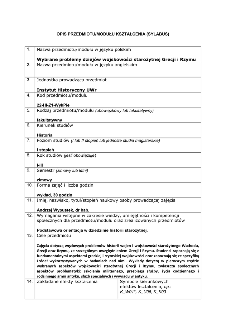 OPIS PRZEDMIOTU/MODUŁU KSZTAŁCENIA (SYLABUS) 1. Nazwa przedmiotu/modułu w języku polskim 2. Wybrane problemy dziejów wojskowości starożytnej Grecji i Rzymu Nazwa przedmiotu/modułu w języku angielskim 3. Jednostka prowadząca przedmiot 4. Instytut Historyczny UWr Kod przedmiotu/modułu 5. 22-HI-Z1-WykPie Rodzaj przedmiotu/modułu (obowiązkowy lub fakultatywny) 6. fakultatywny Kierunek studiów 7. Historia Poziom studiów (I lub II stopień lub jednolite studia magisterskie) 8. I stopień Rok studiów (jeśli obowiązuje) 9. I-III Semestr (zimowy lub letni) zimowy 10. Forma zajęć i liczba godzin wykład, 30 godzin 11. Imię, nazwisko, tytuł/stopień naukowy osoby prowadzącej zajęcia Andrzej Wypustek, dr hab. 12. Wymagania wstępne w zakresie wiedzy, umiejętności i kompetencji społecznych dla przedmiotu/modułu oraz zrealizowanych przedmiotów Podstawowa orientacja w dziedzinie historii starożytnej. 13. Cele przedmiotu Zajęcia dotyczą węzłowych problemów historii wojen i wojskowości starożytnego Wschodu, Grecji oraz Rzymu, ze szczególnym uwzględnieniem Grecji i Rzymu. Studenci zapoznają się z fundamentalnymi aspektami greckiej i rzymskiej wojskowości oraz zapoznają się ze specyfiką źródeł wykorzystywanych w badaniach nad nimi. Wykłady dotyczą w pierwszym rzędzie wybranych aspektów wojskowości starożytnej Grecji i Rzymu, zwłaszcza społecznych aspektów problematyki: szkolenia militarnego, przebiegu służby, życia codziennego i rodzinnego armii antyku, służb specjalnych i wywiadu w antyku. 14. Zakładane efekty kształcenia Symbole kierunkowych efektów kształcenia, np.: K_W01*, K_U05, K_K03 Zna kierunki badań historycznych w dziedzinie historii wojskowości starożytnej. K_W02 Zna wybrane zagadnienia historii wojskowości antycznej w ujęciu chronologicznym i tematycznym K_W05 Ma podstawową wiedzę na temat dorobku historiografii wojskowości antycznej i rozróżnia jej główne nurty. Zna na poziomie podstawowym główne kierunki rozwoju badań historycznych nad wojskowością grecką i rzymską, a zwłaszcza najnowsze osiągnięcia w tej dziedzinie. K_W16 Rozumie podstawowe pojęcia w języku starożytnym i/lub dawnym występujące w źródłach na temat wojskowości antycznej Grecji i Rzymu. K_W21 Potrafi wskazać, udowodnić i omówić wzajemne relacje różnych kierunków badań historycznych w dziedzinie historii wojskowości starożytnej. K_U02 Rozpoznaje, wykorzystuje i analizuje teksty historiograficzne, teksty źródłowe oraz inne wytwory cywilizacji przydatne w pracy i warsztacie historyka starożytnej wojskowości. Streszcza, zapisuje i kataloguje uzyskane tą drogą informacje. K_U06 15. Treści programowe 1. Wstęp 2. Armie greckie: hoplici i falanga 3. Formacje niehoplickie 4. Armie zawodowe: Sparta i najemnicy 5. Armia rzymska: procedury rekrutacji, szkolenia, dowodzenie, taktyka walki 6. Broń i uzbrojenie 7. Wojna i bitwa w starożytności; archeologia pól bitewnych 8. Życie obozowe 9. Kariery wojskowe i odznaczenia 10. Medycyna wojskowa; szpitale wojskowe 11. Rzymskie jednostki pomocnicze; wykopaliska w Vindolanda 12. Rzymska granica (limes) 13. Limes na morzu i rzekach, floty rzymskie 14. Limes – na przykładzie fortu w Dura Europos 15. Służby specjalne i wywiad 16. Religia armii rzymskiej; mitraizm 16. Zalecana literatura (podręczniki) Connolly P., Historia armii greckiej (seria „Tak żyli ludzie”), Wrocław 1991 Dąbrowa E., Rozwój i organizacja armii rzymskiej (do pocz. III w. n.e.), Filomata, nr 3 specjalny (399), 1990, s. 327-421 Gazda D., Armie świata antycznego. Republika rzymska i Kartagińczycy, 2006 Kulesza R., Ateny-Sparta 431-404 p.n.e., Warszawa 1997 Warry J., Armie świata starożytnego, Warszawa 1995 17. Forma zaliczenia poszczególnych komponentów przedmiotu/modułu, sposób sprawdzenia osiągnięcia zamierzonych efektów kształcenia: wykład: zaliczenie seminarium: laboratorium: konwersatorium: inne: 18. Język wykładowy polski 19. Obciążenie pracą studenta Forma aktywności studenta Zaliczenie na podst. uczestnictwa w zajęciach (1 ECTS), aktywności w czasie wykładów (1 ECTS), przygotowanie indywidualne do egzaminu (1 ECTS) Godziny zajęć (wg planu studiów) z nauczycielem: - wykład: 30 - ćwiczenia: - laboratorium: - inne: Średnia liczba godzin na zrealizowanie aktywności 30 Praca własna studenta np.: - przygotowanie do zajęć: - opracowanie wyników: - czytanie wskazanej literatury: 10 - napisanie raportu z zajęć: - przygotowanie do egzaminu: 10 20 Suma godzin 50 Liczba punktów ECTS 3 *objaśnienie symboli: K (przed podkreśleniem) - kierunkowe efekty kształcenia W - kategoria wiedzy U - kategoria umiejętności K (po podkreśleniu) - kategoria kompetencji społecznych 01, 02, 03 i kolejne - numer efektu kształcenia