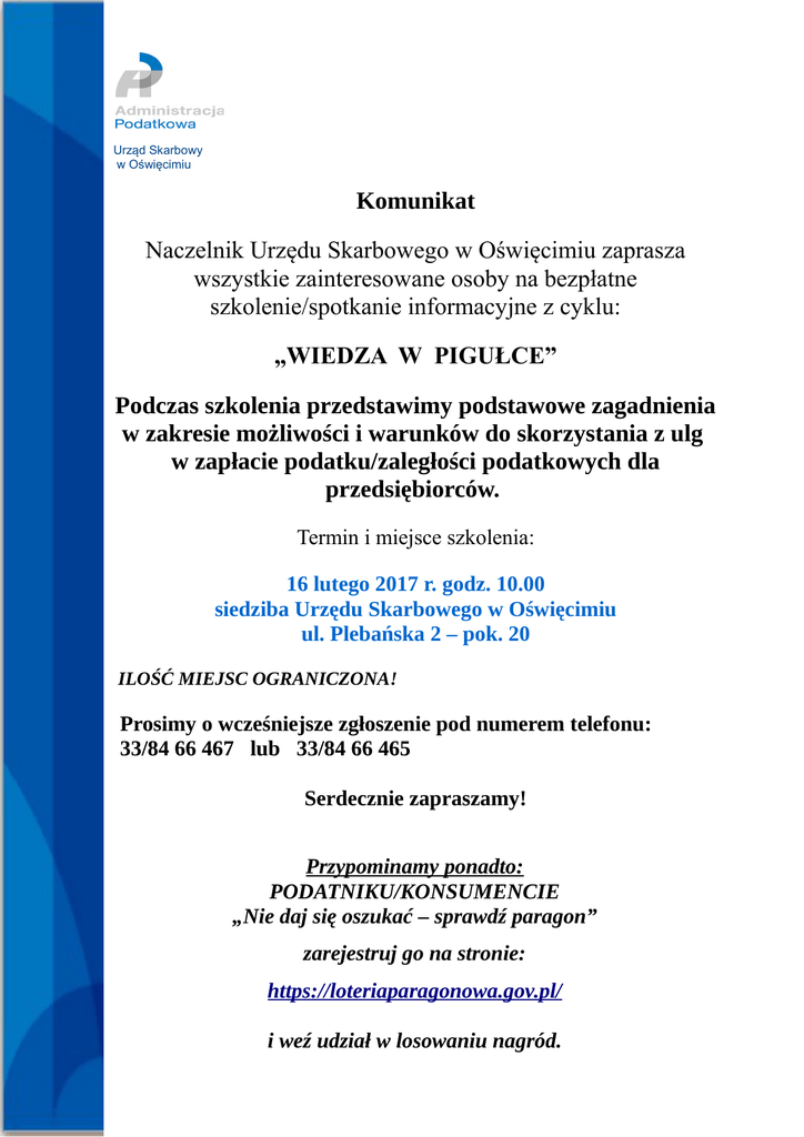 Urząd Skarbowy w Oświęcimiu Komunikat Naczelnik Urzędu Skarbowego w Oświęcimiu zaprasza wszystkie zainteresowane osoby na bezpłatne szkolenie/spotkanie informacyjne z cyklu: „WIEDZA W PIGUŁCE” Podczas szkolenia przedstawimy podstawowe zagadnienia w zakresie możliwości i warunków do skorzystania z ulg w zapłacie podatku/zaległości podatkowych dla przedsiębiorców. Termin i miejsce szkolenia: 16 lutego 2017 r. godz. 10.00 siedziba Urzędu Skarbowego w Oświęcimiu ul. Plebańska 2 – pok. 20 ILOŚĆ MIEJSC OGRANICZONA! Prosimy o wcześniejsze zgłoszenie pod numerem telefonu: 33/84 66 467 lub 33/84 66 465 Serdecznie zapraszamy! Przypominamy ponadto: PODATNIKU/KONSUMENCIE „Nie daj się oszukać – sprawdź paragon” zarejestruj go na stronie: https://loteriaparagonowa.gov.pl/ i weź udział w losowaniu nagród.