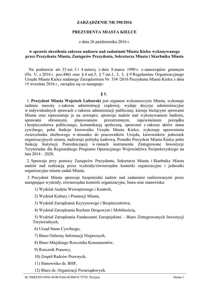 ZARZĄDZENIE NR 390/2016 PREZYDENTA MIASTA KIELCE z dnia 26 października 2016 r. w sprawie określenia zakresu nadzoru nad zadaniami Miasta Kielce wykonywanego przez Prezydenta Miasta, Zastępców Prezydenta, Sekretarza Miasta i Skarbnika Miasta Na podstawie art. 33 ust. 3 i 4 ustawy z dnia 8 marca 1990 r. o samorządzie gminnym (Dz. U. z 2016 r. poz.446) oraz § 6 ust.5, § 7 ust.1, 3, 5, § 9 Regulaminu Organizacyjnego Urzędu Miasta Kielce nadanego Zarządzeniem Nr 334 /2016 Prezydenta Miasta Kielce z dnia 15 września 2016 r., zarządza się co następuje: § 1. 1. Prezydent Miasta Wojciech Lubawski jest organem wykonawczym Miasta, wykonuje zadania starosty z zakresu administracji rządowej, wydaje decyzje administracyjne w indywidualnych sprawach z zakresu administracji publicznej, kieruje bieżącymi sprawami Miasta oraz reprezentuje je na zewnątrz, sprawuje nadzór nad wykonywaniem budżetu, sprawami obronnymi, planowaniem przestrzennym, zapewnieniem porządku i bezpieczeństwa publicznego, komunikacją społeczną, sprawami z zakresu aktów stanu cywilnego, pełni funkcje kierownika Urzędu Miasta Kielce, wykonuje uprawnienia zwierzchnika służbowego w stosunku do pracowników Urzędu, kierowników jednostek organizacyjnych miasta, nadzoruje politykę kadrową. Ponadto Prezydent Miasta Kielce pełni funkcję Instytucji Pośredniczącej w ramach instrumentu Zintegrowane Inwestycje Terytorialne dla Regionalnego Programu Operacyjnego Województwa Świętokrzyskiego na lata 2014 – 2020. 2. Sprawuje przy pomocy Zastępców Prezydenta, Sekretarza Miasta i Skarbnika Miasta nadzór nad realizacją przez wydziały/równorzędne komórki organizacyjne i jednostki organizacyjne miasta zadań Miasta. 3. Prezydent Miasta sprawuje bezpośredni nadzór nad zadaniami realizowanymi przez następujące wydziały, równorzędne komórki organizacyjne, biura oraz stanowiska: 1) Wydział Audytu Wewnętrznego i Kontroli, 2) Wydział Kultury i Promocji Miasta, 3) Wydział Zarządzania Kryzysowego i Bezpieczeństwa, 4) Wydział Zarządzania Ruchem Drogowym i Mobilnością, 5) Wydział Zarządzania Funduszami Europejskimi – Biuro Zintegrowanych Inwestycji Terytorialnych, 6) Urząd Stanu Cywilnego, 7) Biuro Ochrony Informacji Niejawnych, 8) Biuro Miejskiego Rzecznika Konsumentów, 9) Rzecznik Prasowy, 10) Zespół Radców Prawnych, 11) Stanowisko ds. BHP, 12) Biuro ds. Organizacji Pozarządowych. Id: 506EE5E9-8942-463B-9A66-0CB4F3C72792. Przyjety Strona 1 4. W obszarze nadzoru Prezydenta Miasta znajdują się zadania realizowane przez nw. jednostki organizacyjne miasta: 1) Miejski Ośrodek Pomocy Rodzinie, 2) Zarząd Transportu Miejskiego, 3) Komenda Miejska Państwowej Straży Pożarnej, 4) Komenda Miejska Policji, 5) Straż Miejska, 6) Biuro Wystaw Artystycznych, 7) Dom Środowisk Twórczych, 8) Muzeum Zabawek i Zabawy, 9) Miejska Biblioteka Publiczna, 10) Teatr Lalki i Aktora „Kubuś”, 11) Kielecki Teatr Tańca, 12) Kieleckie Centrum Kultury, 13) Dom Kultury „Zameczek”, 14) Muzeum Historii Kielc, 15) Wzgórze Zamkowe, 16) Miejski Ośrodek Sportu i Rekreacji. § 2. I Zastępca Prezydenta –Andrzej Sygut: 1. Sprawuje bezpośredni nadzór nad zadaniami realizowanymi przez następujące wydziały: 1) Wydział Edukacji, Profilaktyki i Pożytku Publicznego, 2) Wydział Komunikacji, 3) Wydział Spraw Obywatelskich i Działalności Gospodarczej. 2. W obszarze nadzoru znajdują się nw. jednostki organizacyjne miasta: 1) Przedszkole Samorządowe Nr 1, 2) Przedszkole Samorządowe Nr 2, 3) Przedszkole Samorządowe Nr 3, 4) Przedszkole Samorządowe Nr 4, 5) Przedszkole Samorządowe Nr 5, 6) Przedszkole Samorządowe Nr 6, 7) Przedszkole Samorządowe Nr 8 z Oddziałami Integracyjnymi, 8) Przedszkole Samorządowe Nr 9, 9) Przedszkole Samorządowe Nr 13, 10) Przedszkole Samorządowe Nr 14, 11) Przedszkole Samorządowe Nr 16, Id: 506EE5E9-8942-463B-9A66-0CB4F3C72792. Przyjety Strona 2 12) Przedszkole Samorządowe Nr 18, 13) Przedszkole Samorządowe Nr 19 z Oddziałami Integracyjnymi, 14) Przedszkole Samorządowe Nr 21, 15) Przedszkole Samorządowe Nr 22, 16) Przedszkole Samorządowe Nr 23, 17) Przedszkole Samorządowe Nr 24, 18) Przedszkole Samorządowe Nr 25, 19) Przedszkole Samorządowe Nr 26, 20) Integracyjne Przedszkole Samorządowe Nr 27, 21) Przedszkole Samorządowe Nr 28, 22) Przedszkole Samorządowe Nr 29, 23) Przedszkole Samorządowe Nr 30, 24) Przedszkole Samorządowe Nr 31, 25) Przedszkole Samorządowe Nr 32, 26) Przedszkole Samorządowe Nr 33, 27) Przedszkole Samorządowe Nr 34, 28) Przedszkole Samorządowe Nr 35, 29) Przedszkole Samorządowe Nr 36, 30) Przedszkole Samorządowe Nr 39, 31) Przedszkole Samorządowe Nr 40, 32) Przedszkole Samorządowe Nr 42, 33) Przedszkole Samorządowe Nr 43, 34) Szkoła Podstawowa Nr 1, 35) Szkoła Podstawowa Nr 2, 36) Szkoła Podstawowa Nr 4, 37) Szkoła Podstawowa Nr 8, 38) Szkoła Podstawowa Nr 18, 39) Szkoła Podstawowa Nr 19, 40) Szkoła Podstawowa Nr 25, 41) Szkoła Podstawowa Nr 27, 42) Szkoła Podstawowa Nr 28, 43) Szkoła Podstawowa Nr 33, 44) Szkoła Podstawowa Nr 34, 45) Gimnazjum Nr 3, 46) Gimnazjum Nr 7, 47) Gimnazjum Nr 9, Id: 506EE5E9-8942-463B-9A66-0CB4F3C72792. Przyjety Strona 3 48) Zespół Szkół Ogólnokształcących Integracyjnych Nr 4, 49) Zespół Szkół Ogólnokształcących Nr 5, 50) Zespół Szkół Ogólnokształcących Nr 6, 51) Zespół Szkół Ogólnokształcących Nr 8, 52) Zespół Szkół Ogólnokształcących Nr 10, 53) Zespół Szkół Ogólnokształcących Nr 11, 54) Zespół Szkół Ogólnokształcących Nr 12, 55) Zespół Szkół Ogólnokształcących Nr 15 z Oddziałami Integracyjnymi, 56) Zespół Szkół Ogólnokształcących Nr 16, 57) Zespół Szkół Ogólnokształcących Nr 26, 58) Zespół Szkół Ogólnokształcących Nr 27, 59) Zespół Szkół Ogólnokształcących Nr 28, 60) Zespół Szkół Ogólnokształcących Nr 29, 61) Zespół Szkół Ogólnokształcących Nr 17 Specjalnych, 62) Zespół Szkół Ogól