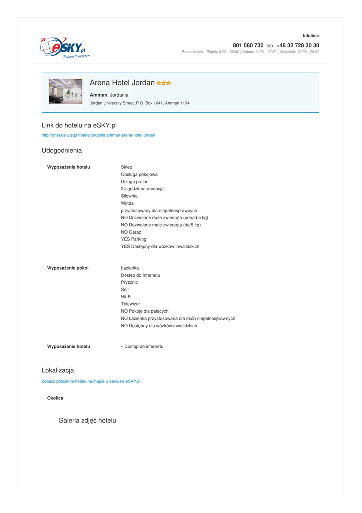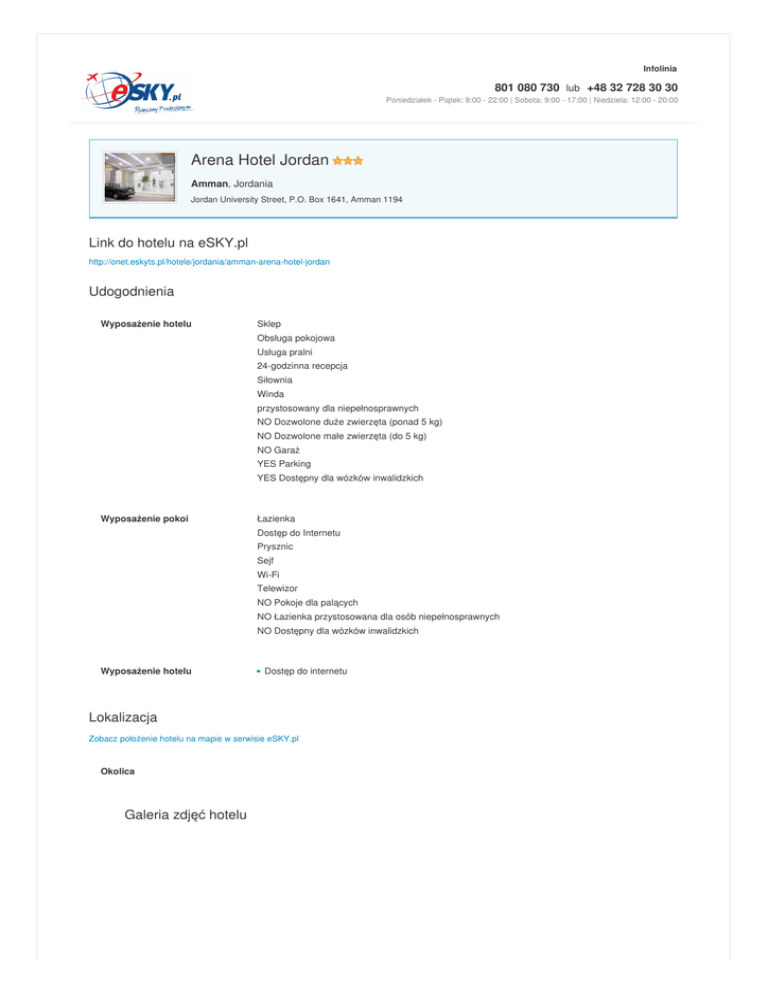 Infolinia 801 080 730 lub +48 32 728 30 30 Poniedziałek - Piątek: 8:00 - 22:00 | Sobota: 9:00 - 17:00 | Niedziela: 12:00 - 20:00 Arena Hotel Jordan Amman, Jordania Jordan University Street, P.O. Box 1641, Amman 1194 Link do hotelu na eSKY.pl http://onet.eskyts.pl/hotele/jordania/amman-arena-hotel-jordan Udogodnienia Wyposażenie hotelu Sklep Obsługa pokojowa Usługa pralni 24-godzinna recepcja Siłownia Winda przystosowany dla niepełnosprawnych NO Dozwolone duże zwierzęta (ponad 5 kg) NO Dozwolone małe zwierzęta (do 5 kg) NO Garaż YES Parking YES Dostępny dla wózków inwalidzkich Wyposażenie pokoi Łazienka Dostęp do Internetu Prysznic Sejf Wi-Fi Telewizor NO Pokoje dla palących NO Łazienka przystosowana dla osób niepełnosprawnych NO Dostępny dla wózków inwalidzkich Wyposażenie hotelu Dostęp do internetu Lokalizacja Zobacz położenie hotelu na mapie w serwisie eSKY.pl Okolica Galeria zdjęć hotelu Hotele – Bilety lotnicze – Tanie linie lotnicze – Ubezpieczenia Podróżne