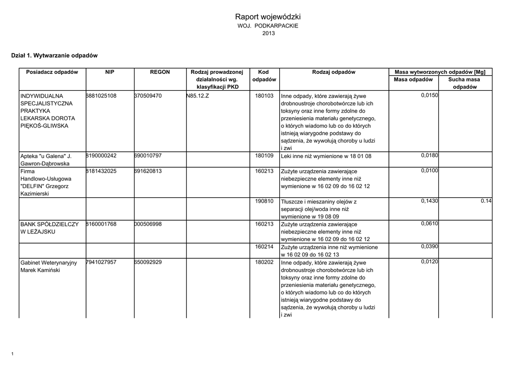 Raport wojewódzki WOJ. PODKARPACKIE 2013 Dział 1. Wytwarzanie odpadów Posiadacz odpadów NIP REGON Rodzaj prowadzonej działalności wg. klasyfikacji PKD 160213 Zużyte urządzenia zawierające niebezpieczne elementy inne niż wymienione w 16 02 09 do 16 02 12 0,0100 190810 Tłuszcze i mieszaniny olejów z separacji olej/woda inne niż wymienione w 19 08 09 Zużyte urządzenia zawierające niebezpieczne elementy inne niż wymienione w 16 02 09 do 16 02 12 Zużyte urządzenia inne niż wymienione w 16 02 09 do 16 02 13 Inne odpady, które zawierają żywe drobnoustroje chorobotwórcze lub ich toksyny oraz inne formy zdolne do przeniesienia materiału genetycznego, o których wiadomo lub co do których istnieją wiarygodne podstawy do sądzenia, że wywołują choroby u ludzi i zwi 0,1430 370509470 Apteka "u Galena" J. Gawron-Dąbrowska Firma Handlowo-Usługowa "DELFIN" Grzegorz Kazimierski 8190000242 690010797 180109 8181432025 691620813 000506998 180103 160213 160214 Gabinet Weterynaryjny Marek Kamiński 1 7941027957 650092929 Masa wytworzonych odpadów [Mg] Masa odpadów Sucha masa odpadów 0,0150 6881025108 8160001768 Rodzaj odpadów Inne odpady, które zawierają żywe drobnoustroje chorobotwórcze lub ich toksyny oraz inne formy zdolne do przeniesienia materiału genetycznego, o których wiadomo lub co do których istnieją wiarygodne podstawy do sądzenia, że wywołują choroby u ludzi i zwi Leki inne niż wymienione w 18 01 08 INDYWIDUALNA SPECJALISTYCZNA PRAKTYKA LEKARSKA DOROTA PIĘKOŚ-GLIWSKA BANK SPÓŁDZIELCZY W LEŻAJSKU N85.12.Z Kod odpadów 180202 0,0180 0,0610 0,0390 0,0120 0.14 Przedsiebiorstwo Produkcyjno- Usługowo - Handlowe "ZGODA N&C" Sp. z o.o. 8140002925 690262748 100101 Żużle, popioły paleniskowe i pyły z kotłów (z wyłączeniem pyłów z kotłów wymienionych w 10 01 04) 3,8000 120101 24,0000 101003 Odpady z toczenia i piłowania żelaza oraz jego stopów Szlamy z obróbki metali zawierające oleje (np. szlamy ze szlifowania, gładzenia i pokrywania) Emulsje olejowe zawierające związki chlorowcoorganiczne Mineralne oleje silnikowe, przekładniowe i smarowe niezawierające związków chlorowcoorganicznych Sorbenty, materiały filtracyjne, tkaniny do wycierania (np. szmaty, ścierki) i ubrania ochronne inne niż wymienione w 15 02 02 Niesegregowane (zmieszane) odpady komunalne Zgary i żużle odlewnicze 110107 Alkalia trawiące 120102 Cząstki i pyły żelaza oraz jego stopów 120103 150101 Odpady z toczenia i piłowania metali nieżelaznych Mineralne oleje hydrauliczne niezawierające związków chlorowcoorganicznych Opakowania z papieru i tektury 150102 Opakowania z tworzyw sztucznych 4,0780 150103 Opakowania z drewna 9,1470 150202 Sorbenty, materiały filtracyjne (w tym filtry olejowe nieujęte w innych grupach), tkaniny do wycierania (np. szmaty, ścierki) i ubrania ochronne zanieczyszczone substancjami niebezpiecznymi (np. PCB) 0,4450 120118 130104 130205 150203 200301 EUROMETAL S.A.Grupa Kapitałowa "EKO-Świat" 8652230687 831202750 130110 2 0,0200 0,4200 1,4400 0,0200 3,0000 83,3000 285,9800 4,6900 435,0000 1,7110 10,8020 161106 170402 PKP Polskie Linie Kkolejowe S.A. Zakład Lini Kolejowych w rzeszowie 1132316427 017319027 00170 I60.10.Z 11,3600 2 905,9900 080317 Odpadowy toner drukarski zawierający substancje niebezpieczne 0,1410 080318 Odpadowy toner drukarski inny niż wymieniony w 08 03 17 Żużle, popioły paleniskowe i pyły z kotłów (z wyłączeniem pyłów z kotłów wymienionych w 10 01 04) Inne oleje silnikowe, przekładniowe i smarowe Opakowania z tworzyw sztucznych 0,0100 0,0070 160103 Sorbenty, materiały filtracyjne, tkaniny do wycierania (np. szmaty, ścierki) i ubrania ochronne inne niż wymienione w 15 02 02 Zużyte opony 160107 Filtry olejowe 0,0070 160213 Zużyte urządzenia zawierające niebezpieczne elementy inne niż wymienione w 16 02 09 do 16 02 12 Zużyte urządzenia inne niż wymienione w 16 02 09 do 16 02 13 Elementy usunięte ze zużytych urządzeń inne niż wymienione w 16 02 15 Baterie i akumulatory ołowiowe 0,4640 100101 130208 150102 150203 160214 160216 160601 170101 170201 170204 3 Okładziny piecowe i materiały ogniotrwałe z procesów niemetalurgicznych inne niż wymienione w 16 11 05 Aluminium 0,3000 0,7180 0,0630 0,2060 0,7560 0,0790 3,6330 Odpady betonu oraz gruz betonowy z rozbiórek i remontów Drewno 249,4800 Odpady drewna, szkła i tworzyw sztucznych zawierające lub zanieczyszczone substancjami niebezpiecznymi (podkłady kolejowe) 0,0120 55,6770 MIEJSKI ZAKŁAD WODOCIĄGÓW I KANALIZACJI 8721267163 850390017 E41.00.A 170401 Miedź, brąz, mosiądz 69,9990 170402 Aluminium 11,1870 170405 Żelazo i stal 170508 190801 Tłuczeń torowy (kruszywo) inny niż wymieniony w 17 05 07 Elementy usunięte ze zużytych urządzeń inne niż wymienione w 16 02 15 Skratki 190802 Zawartość piaskowników 190805 160216 4 0,0890 3,1000 19,6000 402,7000 6891000400 370271258 020202 8160001857 001095913 120113 Odpady spawalnicze 0,3140 150101 Opakowania z papieru i tektury 0,0150 150102 Opakowania z tworzyw sztucznych 0,0070 160213 Zużyte urządzenia zawierające niebezpieczne elementy inne niż wymienione w 16 02 09 do 16 02 12 Odpady betonu oraz gruz betonowy z rozbiórek i remontów Wodne roztwory wywoływaczy i aktywatorów 0,0160 090104 Roztwory utrwalaczy 0,0060 150102 Opakowania z tworzyw sztucznych 0,0030 170101 NIEPUBLICZNY ZAKŁAD OPIEKI ZDROWOTNEJ "INTERMED" SP. Z O.O 6 536,0500 Ustabilizowane komunalne osady ściekowe Odpady komunalne niewymienione w innych podgrupach Odpadowa tkanka zwierzęca 200399 Jan Szczęsny Pex Jan Produkcja Wędlin i Mięsa Usługi Rolniczo-Transportowe SPÓŁDZIELNIA MIESZKANIOWA W NOWEJ SARZYNIE 10 750,4870 6842201104 370486154 090101 5,0000 0,4500 1,7430 0,0060 72.00 150110 180103 WPS Sp. z o. o. 6871840315 180105512 030104 080111 110108 0,0050 0,2400 0,0300 18,2000 19,9600 120102 Odpady z toczenia i piłowania żelaza oraz jego stopów Cząstki i pyły żelaza oraz jego stop