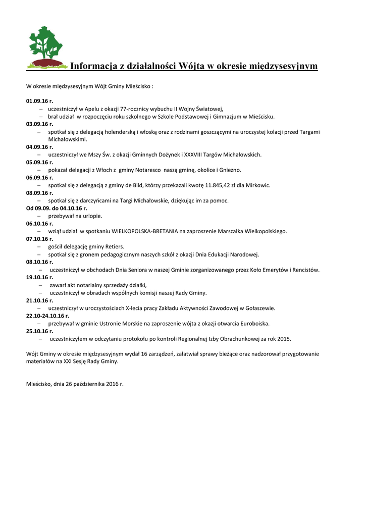 Informacja z działalności Wójta w okresie międzysesyjnym W okresie międzysesyjnym Wójt Gminy Mieścisko : 01.09.16 r. uczestniczył w Apelu z okazji 77-rocznicy wybuchu II Wojny Światowej, brał udział w rozpoczęciu roku szkolnego w Szkole Podstawowej i Gimnazjum w Mieścisku. 03.09.16 r. spotkał się z delegacją holenderską i włoską oraz z rodzinami goszczącymi na uroczystej kolacji przed Targami Michałowskimi. 04.09.16 r. uczestniczył we Mszy Św. z okazji Gminnych Dożynek i XXXVIII Targów Michałowskich. 05.09.16 r. pokazał delegacji z Włoch z gminy Notaresco naszą gminę, okolice i Gniezno. 06.09.16 r. spotkał się z delegacją z gminy de Bild, którzy przekazali kwotę 11.845,42 zł dla Mirkowic. 08.09.16 r. spotkał się z darczyńcami na Targi Michałowskie, dziękując im za pomoc. Od 09.09. do 04.10.16 r. przebywał na urlopie. 06.10.16 r. wziął udział w spotkaniu WIELKOPOLSKA-BRETANIA na zaproszenie Marszałka Wielkopolskiego. 07.10.16 r. gościł delegację gminy Retiers. spotkał się z gronem pedagogicznym naszych szkół z okazji Dnia Edukacji Narodowej. 08.10.16 r. uczestniczył w obchodach Dnia Seniora w naszej Gminie zorganizowanego przez Koło Emerytów i Rencistów. 19.10.16 r. zawarł akt notarialny sprzedaży działki, uczestniczył w obradach wspólnych komisji naszej Rady Gminy. 21.10.16 r. uczestniczył w uroczystościach X-lecia pracy Zakładu Aktywności Zawodowej w Gołaszewie. 22.10-24.10.16 r. przebywał w gminie Ustronie Morskie na zaproszenie wójta z okazji otwarcia Euroboiska. 25.10.16 r. uczestniczyłem w odczytaniu protokołu po kontroli Regionalnej Izby Obrachunkowej za rok 2015. Wójt Gminy w okresie międzysesyjnym wydał 16 zarządzeń, załatwiał sprawy bieżące oraz nadzorował przygotowanie materiałów na XXI Sesję Rady Gminy. Mieścisko, dnia 26 października 2016 r.