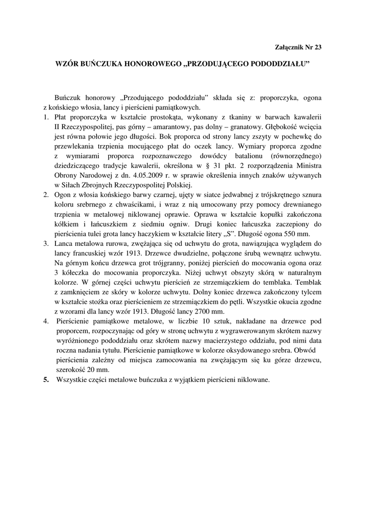Załącznik Nr 23 WZÓR BUŃCZUKA HONOROWEGO „PRZODUJĄCEGO PODODDZIAŁU” Buńczuk honorowy „Przodującego pododdziału” składa się z: proporczyka, ogona z końskiego włosia, lancy i pierścieni pamiątkowych. 1. Płat proporczyka w kształcie prostokąta, wykonany z tkaniny w barwach kawalerii II Rzeczypospolitej, pas górny – amarantowy, pas dolny – granatowy. Głębokość wcięcia jest równa połowie jego długości. Bok proporca od strony lancy zszyty w pochewkę do przewlekania trzpienia mocującego płat do oczek lancy. Wymiary proporca zgodne z wymiarami proporca rozpoznawczego dowódcy batalionu (równorzędnego) dziedziczącego tradycje kawalerii, określona w § 31 pkt. 2 rozporządzenia Ministra Obrony Narodowej z dn. 4.05.2009 r. w sprawie określenia innych znaków używanych w Siłach Zbrojnych Rzeczypospolitej Polskiej. 2. Ogon z włosia końskiego barwy czarnej, ujęty w siatce jedwabnej z trójskrętnego sznura koloru srebrnego z chwaścikami, i wraz z nią umocowany przy pomocy drewnianego trzpienia w metalowej niklowanej oprawie. Oprawa w kształcie kopułki zakończona kółkiem i łańcuszkiem z siedmiu ogniw. Drugi koniec łańcuszka zaczepiony do pierścienia tulei grota lancy haczykiem w kształcie litery „S”. Długość ogona 550 mm. 3. Lanca metalowa rurowa, zwężająca się od uchwytu do grota, nawiązująca wyglądem do lancy francuskiej wzór 1913. Drzewce dwudzielne, połączone śrubą wewnątrz uchwytu. Na górnym końcu drzewca grot trójgranny, poniżej pierścień do mocowania ogona oraz 3 kółeczka do mocowania proporczyka. Niżej uchwyt obszyty skórą w naturalnym kolorze. W górnej części uchwytu pierścień ze strzemiączkiem do temblaka. Temblak z zamknięciem ze skóry w kolorze uchwytu. Dolny koniec drzewca zakończony tylcem w kształcie stożka oraz pierścieniem ze strzemiączkiem do pętli. Wszystkie okucia zgodne z wzorami dla lancy wzór 1913. Długość lancy 2700 mm. 4. Pierścienie pamiątkowe metalowe, w liczbie 10 sztuk, nakładane na drzewce pod proporcem, rozpoczynając od góry w stronę uchwytu z wygrawerowanym skrótem nazwy wyróżnionego pododdziału oraz skrótem nazwy macierzystego oddziału, pod nimi data roczna nadania tytułu. Pierścienie pamiątkowe w kolorze oksydowanego srebra. Obwód pierścienia zależny od miejsca zamocowania na zwężającym się ku górze drzewcu, szerokość 20 mm. 5. Wszystkie części metalowe buńczuka z wyjątkiem pierścieni niklowane. BUŃCZUK