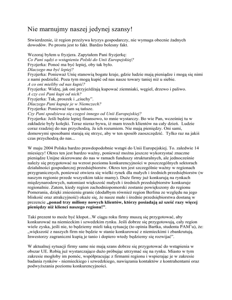 Nie marnujmy naszej jedynej szansy! Stwierdzenie, iż region przeżywa kryzys gospodarczy, nie wymaga obecnie żadnych dowodów. Po prostu jest to fakt. Bardzo bolesny fakt. Wczoraj byłem u fryzjera. Zapytałem Pani fryzjerkę: Co Pani sądzi o wstąpieniu Polski do Unii Europejskiej? Fryzjerka: Ponoć ma być lepiej, oby tak było. Dlaczego ma być lepiej? Fryzjerka: Ponieważ Unię stanowią bogate kraje, gdzie ludzie mają pieniądze i mogą się nimi z nami podzielić. Poza tym mogą kupić od nas nasze towary taniej niż u siebie. A co oni mieliby od nas kupić? Fryzjerka: Widzę, jak oni przyjeżdżają kupować ziemniaki, węgiel, drzewo i paliwo. A czy coś Pani kupi od nich? Fryzjerka: Tak, proszek i „ciuchy”. Dlaczego Pani kupuje je w Niemczech? Fryzjerka: Ponieważ tam są tańsze. Czy Pani spodziewa się czegoś innego od Unii Europejskiej? Fryzjerka: Jeśli będzie lepiej finansowo, to mnie wystarczy. Bo wie Pan, wcześniej tu w zakładzie były kolejki. Teraz nieraz bywa, iż mam trzech klientów na cały dzień. Ludzie coraz rzadziej do nas przychodzą. Ja ich rozumiem. Nie mają pieniędzy. Oni sami, domowymi sposobami starają się strzyc, aby w ten sposób zaoszczędzić. Tylko raz na jakiś czas przychodzą do nas... W maju 2004 Polska bardzo prawdopodobnie wstąpi do Unii Europejskiej. To. zaledwie 14 miesięcy! Okres ten jest bardzo ważny, ponieważ można jeszcze wykorzystać znaczne pieniądze Unijne skierowane do nas w ramach funduszy strukturalnych, ale jednocześnie należy się przygotować na wzrost poziomu konkurencyjności w poszczególnych sektorach działalności gospodarczej przedsiębiorstw. Okres ten jest szczególnie ważny w regionach przygranicznych, ponieważ otwiera się wielki rynek dla małych i średnich przedsiębiorstw (w naszym regionie przede wszystkim takie mamy). Duże firmy już konkurują na rynkach międzynarodowych, natomiast większość małych i średnich przedsiębiorstw konkuruje regionalnie. Zatem, kiedy region zachodniopomorski zostanie powiększony do regionu Pomerania, dzięki zniesieniu granic (dodałbym również region Berlina ze względu na jego bliskość oraz atrakcyjność) okaże się, że nasze małe i średnie przedsiębiorstwa dostaną w prezencie „ponad trzy miliony nowych klientów, którzy posiadają aż sześć razy więcej pieniędzy niż klienci naszego regionu!”. Taki prezent to może być kłopot...W ciągu roku firmy muszą się przygotować, aby konkurować na niemieckim i szwedzkim rynku. Jeśli dobrze się przygotowują, cały region wiele zyska, jeśli nie, to będziemy mieli taką sytuację (to opinia Bartka, studenta PAM’u), że: „większość z naszych firm nie będzie w stanie konkurować z niemieckimi i zbankrutują. Inwestorzy zagraniczni kupią je tanio i dopiero wtedy będziemy się rozwijać”. W aktualnej sytuacji firmy same nie mają szans dobrze się przygotować do wstąpienia w obszar UE. Robią już wystarczająco dużo próbując utrzymać się na rynku. Miasto w tym zakresie mogłoby im pomóc, współpracując z firmami regionu i wspierając je w zakresie badania rynków - niemieckiego i szwedzkiego, nawiązania kontaktów z kontrahentami oraz podwyższania poziomu konkurencyjności. Ucieszyła mnie wiadomość, że dzisiaj odbędzie się dyskusja na temat poświęcenia części budżetu na programy rozwoju ekonomicznego Miasta. Dopóki Miasto koncentruje się tylko na wydawaniu pieniędzy, a nie wspiera firm w ich zarabianiu, dopóty kryzys gospodarczy będzie się pogłębiał. A tego problemu nie można zostawiać na następny rok, ponieważ już jest pięć po dwunastej. Za rok będzie po prostu za późno. Gratuluję Zarządowi i Radnym zmiany podejścia do swoich funkcji i życzę owocnych obrad na rzecz rozwoju naszego regionu. Oby był to jeden z wielu kroków podjętych przez władze miasta w kierunku poprawy sytuacji społeczno-gospodarczej naszego regionu. dr inż. Alberto Lozano Platonoff Lider Zespołu Badawczego Integracja Katedra Organizacja i Zarządzania Wydział Nauk Ekonomicznych i Zarządzania Uniwersytet Szczeciński