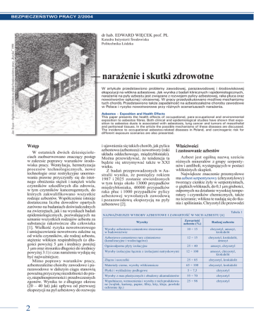 BEZPIECZEŃSTWO PRACY 2/2004 dr hab. EDWARD WIĘCEK prof. PŁ Jan Trojan – Ogólnopolski konkurs na plakat bezpieczeństwa pracy „Ryzyko” 1998 Katedra Inżynierii Środowiska Politechnika Łódzka — narażenie i skutki zdrowotne W artykule przedstawiono problemy zawodowej, parazawodowej i środowiskowej ekspozycji na włókna azbestowe. Jak wynika z badań klinicznych i epidemiologicznych, narażenie na pyły azbestu jest związane z rozwojem pylicy azbestowej, raka płuca oraz nowotworów opłucnej i otrzewnej. W pracy przedyskutowano możliwe mechanizmy tych chorób. Przedstawiono także zapadalność na azbestozależne choroby zawodowe w Polsce i ryzyko nowotworowe przy różnych scenariuszach narażenia. Asbestos – Exposition and Health Effects This paper presents the health effects of occupational, para-occupational and environmental exposition to asbestos fibres. Both clinical and epidemiological studies have shown that exposition to asbestos dusts is associated with asbestosis, lung cancer and tumors of mesothelial and peritoneal tissues. In the article the possible mechanisms of these diseases are discussed. The incidence to occupational asbestos-related diseases in Poland, and carcinogenic risk for different exposure scenarios are also presented. Wstęp W ostatnich dwóch dziesięcioleciach zaobserwowano znaczący postęp w zakresie poprawy warunków środowiska pracy. Wentylacja, hermetyzacja procesów technologicznych, nowe technologie oraz restrykcyjne unormowania prawne przyczyniły się do istotnego obniżenia stężeń i natężeń wielu czynników szkodliwych dla zdrowia, w tym czynników kancerogennych, do których zakwalifikowano wszystkie rodzaje azbestów. Współcześnie istnieje dostateczna liczba dowodów opartych zarówno na badaniach doświadczalnych na zwierzętach, jak i na wynikach badań epidemiologicznych, pozwalających na uznanie wszystkich rodzajów azbestu za substancje rakotwórcze dla człowieka [1]. Wielkość ryzyka nowotworowego i umiejscowienie nowotworu zależne są od wielu czynników, ale rodzaj azbestu, stężenie włókien respirabilnych (o długości powyżej 5 μm i średnicy poniżej 3 μm oraz stosunku długości do średnicy powyżej 3:1) i czas narażenia wydają się być najważniejsze. Mimo poprawy warunków pracy, azbestozależne choroby zawodowe i parazawodowe w dalszym ciągu stanowią poważną przyczynę niezdolności do pracy, niepełnosprawności i przedwczesnych zgonów. Wynika to z długiego okresu (20 – 40 lat) jaki upływa od pierwszej ekspozycji na pył azbestowy do rozwoju 2 i ujawnienia się takich chorób, jak pylica azbestowa (azbestoza) i nowotwory (raki układu oddechowego, międzybłoniaki). Można przewidywać, że tendencja ta będzie się utrzymywać także w XXI wieku. Z badań przeprowadzonych w Australii wynika, że pomiędzy rokiem 1987 i 2025 zostanie stwierdzonych w tym kraju około 13000 przypadków międzybłoniaka, 40000 przypadków raka płuc i 1000 przypadków pylicy azbestowej wywołanych zawodową i pozazawodową ekspozycją na pyły azbestowe [2]. Właściwości i zastosowanie azbestów Azbest jest ogólną nazwą sześciu różnych minerałów z grupy serpentynów i amfiboli, występujących w postaci włóknistych skupień. Największe znaczenie przemysłowe ma azbest serpentynowy (chryzotylowy) tworzący cienkie żyły w serpentynitach, o giętkich włóknach, do 0,1 µm grubości, odpornych na działanie wysokiej temperatury i czynników chemicznych, także na ścieranie; włókna te nadają się do tkania i spilśniania. Chryzotyl źle przewodzi NAJWAŻNIEJSZE WYROBY AZBESTOWE I ZAWARTOŚĆ W NICH AZBESTU [6] Tabela 1 Zawartość azbestu (%) Rodzaj azbestu Wyroby azbestowo-cementowe stosowane w budownictwie 10 ÷ 15 chryzotyl, amosyt, krokidolit Azbestowo-cementowe rury ciśnieniowe (kanalizacyjne i wodociągowe) 12 ÷ 15 chryzotyl, krokidolit, amosyt Wyroby Ognioodporne płyty izolacyjne 25 ÷ 40 amosyt, chryzotyl Wyroby izolacyjne łącznie z izolacjami natryskowymi 12 ÷ 100 amosyt, chryzotyl, krokidolit Złącza i uszczelki 25 ÷ 85 chryzotyl, krokidolit Materiały cierne, wyroby włókiennicze 65 ÷ 100 chryzotyl, krokidolit Płytki i wykładziny podłogowe 5 ÷ 7,5 chryzotyl Wyroby z mas plastycznych i obudowy akumulatorów 55 ÷ 70 chryzotyl Wypełniacze, wzmocnienia i wyroby z nich produkowane (wojłok, kartony, papier, filtry, kity, kleje, powłoki ochronne itp.) 25 ÷ 98 chryzotyl BEZPIECZEŃSTWO PRACY 2/2004 ciepło i elektryczność; występuje głównie w Kanadzie (Quebec), Rosji (m.in. Ural, Sajany), USA, RPA, Zimbabwe i na Cyprze; używany do wyrobu tkanin (np. na ubrania ogniotrwałe), okładzin ciernych szczęk hamulcowych, farb ogniotrwałych, materiałów izolacyjnych, także niepalnych materiałów budowlanych (azbestocementowe płyty). Azbesty amfibolowe (amosytowy, krokidolitowy, antofylitowy, aktynolitowy, tremolitowy) są znacznie mniej rozpowszechnione, występują głównie w RPA, Zimbabwe, Mongolii; ze względu na dużą kwasoodporność używane w przemyśle chemicznym oraz do wyrobu ciśnieniowych rur kanalizacyjnych i wodociągowych. W Polsce nie występują złoża azbestu nadające się do eksploatacji, natomiast azbest występuje jako zanieczyszczenie złóż innych surowców mineralnych (melafir, gabro, ruda niklu, magnezyt) na Dolnym Śląsku [3]. W latach 70. XX wieku importowano do Polski i przerabiano rocznie na azbestowe wyroby włókiennicze, wyroby azbestowo-cementowe, wyroby cierne i inne około 100 tysięcy ton azbestu, z czego ponad 90% stanowił azbest chryzotylowy. W latach 80. zużycie azbestu spadło do około 60 tysięcy ton, a w roku 1991 wynosiło tylko 30 tysięcy ton [4]. W roku 1985 zaprzestano w Polsce stosowania azbestu krokidolitowego, a w roku 1997 Sejm RP uchwalił ustawę o zakazie stosowania wyrobów zawierających azbest [5]. Zgodnie z tą ustawą, minister gospodarki w porozumieniu z ministrem ochrony środowiska określ