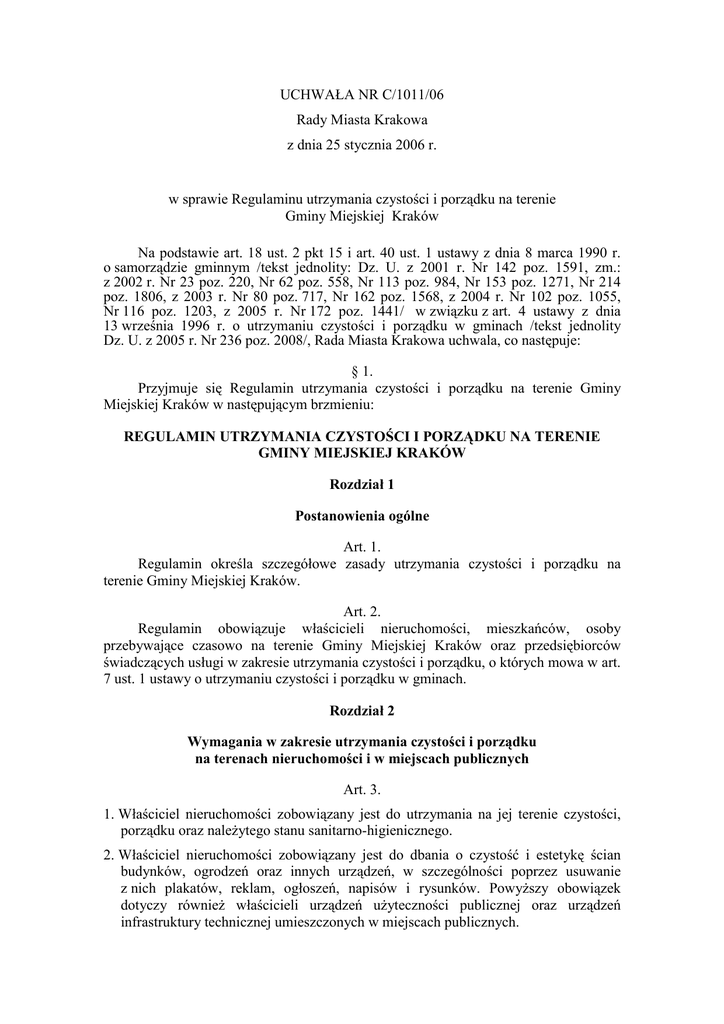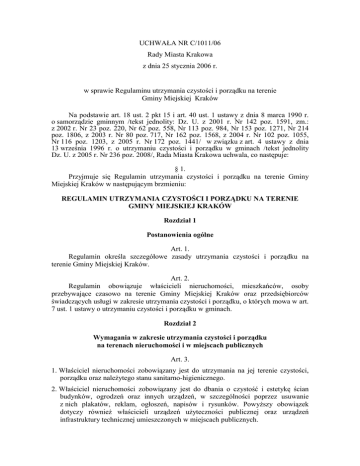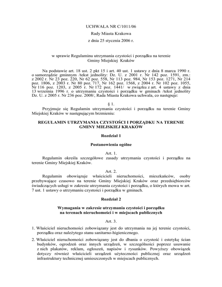 UCHWAŁA NR C/1011/06 Rady Miasta Krakowa z dnia 25 stycznia 2006 r. w sprawie Regulaminu utrzymania czystości i porządku na terenie Gminy Miejskiej Kraków Na podstawie art. 18 ust. 2 pkt 15 i art. 40 ust. 1 ustawy z dnia 8 marca 1990 r. o samorządzie gminnym /tekst jednolity: Dz. U. z 2001 r. Nr 142 poz. 1591, zm.: z 2002 r. Nr 23 poz. 220, Nr 62 poz. 558, Nr 113 poz. 984, Nr 153 poz. 1271, Nr 214 poz. 1806, z 2003 r. Nr 80 poz. 717, Nr 162 poz. 1568, z 2004 r. Nr 102 poz. 1055, Nr 116 poz. 1203, z 2005 r. Nr 172 poz. 1441/ w związku z art. 4 ustawy z dnia 13 września 1996 r. o utrzymaniu czystości i porządku w gminach /tekst jednolity Dz. U. z 2005 r. Nr 236 poz. 2008/, Rada Miasta Krakowa uchwala, co następuje: § 1. Przyjmuje się Regulamin utrzymania czystości i porządku na terenie Gminy Miejskiej Kraków w następującym brzmieniu: REGULAMIN UTRZYMANIA CZYSTOŚCI I PORZĄDKU NA TERENIE GMINY MIEJSKIEJ KRAKÓW Rozdział 1 Postanowienia ogólne Art. 1. Regulamin określa szczegółowe zasady utrzymania czystości i porządku na terenie Gminy Miejskiej Kraków. Art. 2. Regulamin obowiązuje właścicieli nieruchomości, mieszkańców, osoby przebywające czasowo na terenie Gminy Miejskiej Kraków oraz przedsiębiorców świadczących usługi w zakresie utrzymania czystości i porządku, o których mowa w art. 7 ust. 1 ustawy o utrzymaniu czystości i porządku w gminach. Rozdział 2 Wymagania w zakresie utrzymania czystości i porządku na terenach nieruchomości i w miejscach publicznych Art. 3. 1. Właściciel nieruchomości zobowiązany jest do utrzymania na jej terenie czystości, porządku oraz należytego stanu sanitarno-higienicznego. 2. Właściciel nieruchomości zobowiązany jest do dbania o czystość i estetykę ścian budynków, ogrodzeń oraz innych urządzeń, w szczególności poprzez usuwanie z nich plakatów, reklam, ogłoszeń, napisów i rysunków. Powyższy obowiązek dotyczy również właścicieli urządzeń użyteczności publicznej oraz urządzeń infrastruktury technicznej umieszczonych w miejscach publicznych. - 2 3. Właściciel nieruchomości zobowiązany jest do uprzątania błota, śniegu, lodu i innych zanieczyszczeń: 1/ z części nieruchomości udostępnionej do użytku publicznego, 2/ z wydzielonej części drogi publicznej przeznaczonej dla ruchu pieszego chodnika - położonej bezpośrednio przy granicy nieruchomości zgodnie z art. 5 ust. 1 pkt 4 ustawy o utrzymaniu czystości i porządku w gminach. 4. Usuwanie błota, śniegu i lodu powinno odbywać się niezwłocznie po ich wystąpieniu, natomiast innych zanieczyszczeń systematycznie w miarę występujących potrzeb. 4a. Błoto, śnieg i lód należy pryzmować na chodniku przy krawędzi jezdni, z zachowaniem minimum 1 m od pnia drzewa, w sposób nie utrudniający ruchu pieszych i pojazdów. Inne zanieczyszczenia należy umieszczać w stosownych pojemnikach. 5. Właściciel nieruchomości zobowiązany jest niezwłocznie do usuwania z budynków i ich części oraz urządzeń infrastruktury technicznej sopli i nawisów śniegu stwarzających zagrożenie dla przechodniów, a także do oznakowania w sposób widoczny tego miejsca. 6. Mycie pojazdów samochodowych poza myjniami można przeprowadzać pod warunkiem, że ścieki po przejściu przez osadnik odprowadzane są do kanalizacji lub zbiorników bezodpływowych. Zabrania się odprowadzania ścieków bezpośrednio do zbiorników wodnych lub do ziemi. 7. Naprawy pojazdów poza warsztatami samochodowymi mogą być przeprowadzane w obrębie nieruchomości, jeżeli nie spowodują zanieczyszczenia wód i gleby oraz uciążliwości dla sąsiadów. Rozdział 3 Zasady zbierania i pozbywania się odpadów komunalnych i nieczystości ciekłych Art. 4. 1. Właściciel nieruchomości ma obowiązek wyposażenia jej w dostateczną ilość pojemników o minimalnej pojemności 120 dm3 służących do zbierania odpadów komunalnych. 1a. Pojemniki, o których mowa w ust. 1, powinny: 1/ zapewniać gwarancję bezpieczeństwa dla obsługi podczas ich opróżniania i dla osób gromadzących odpady, gwarancję długotrwałego użytkowania oraz dopasowania do urządzeń załadowczych pojazdów, 2/ spełniać wymagania Polskich Norm1 lub posiadać deklarację zgodności wystawioną przez producenta zgodne z ustawą z dnia 30 sierpnia 2002 r. o systemie oceny zgodności /Dz. U. z 2004 r. Nr 204, poz. 2087, z późn. zm./. 1 PN-EN 840-1:1997, PN-EN 840-2:1997, PN-EN 840-3:1999, PN-EN 840-4:1999, PN-EN 840-5:1999, PN-EN 840-6:1999, PN-EN 12574-1:2002, PN-EN 12574-2:2002, PN-EN 12574-3:2002, PN-M 49010:1996, PN-M 49011:1996, PN-M 49012:1996. - 3 1b. Liczba pojemników i częstotliwość odbierania odpadów z nieruchomości powinna zapewnić nieprzepełnianie (nieprzeciążanie) pojemników oraz utrzymanie czystości i porządku wokół pojemników. 1c. Zgodnie z gminnym planem gospodarki odpadami przyjmuje się 5 kg, co odpowiada 20-35 dm3 jako średnią ilość odpadów komunalnych wytwarzanych przez statystycznego mieszkańca Krakowa w ciągu tygodnia. 1d. Ilość wytworzonych nieczystości ciekłych dla nieruchomości wylicza się wg zasad określonych w rozporządzeniu Ministra Infrastruktury z dnia 14 stycznia 2002 r. w sprawie określenia przeciętnych norm zużycia wody (Dz. U. Nr 8, poz. 70). 2. W przypadku krótkotrwałego zwiększenia ilości odpadów komunalnych, właściciel nieruchomości zgłasza ten fakt przedsiębiorcy świadczącemu usługi w zakresie odbierania odpadów, w celu ustalenia warunków ich odbioru. 3. Miejsca gromadzenia odpadów komunalnych powinny być przygotowane zgodnie z przepisami rozporządzenia Ministra Infrastruktury z dnia 12 kwietnia 2002 r. w sprawie warunków technicznych, jakim powinny odpowiadać budynki i ich usytuowanie /Dz. U. Nr 75, poz. 690, z późn. zm./. 4. Właściciel nieruchomości zapewnia przedsiębiorcy w uzgodnionym terminie swobodny dostęp do pojemników. 5. Gmina Miejska Kraków stwarza możliwość 