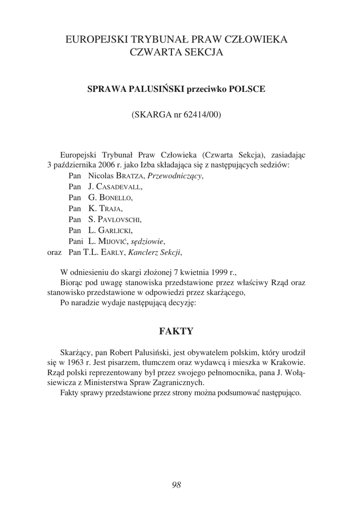 EUROPEJSKI TRYBUNAŁ PRAW CZŁOWIEKA CZWARTA SEKCJA SPRAWA PALUSIŃSKI przeciwko POLSCE (SKARGA nr 62414/00) Europejski Trybunał Praw Człowieka (Czwarta Sekcja), zasiadając 3 października 2006 r. jako Izba składająca się z następujących sedziów: Pan Nicolas BRATZA, Przewodniczący, Pan J. CASADEVALL, Pan G. BONELLO, Pan K. TRAJA, Pan S. PAVLOVSCHI, Pan L. GARLICKI, Pani L. MIJOVIĆ, sędziowie, oraz Pan T.L. EARLY, Kanclerz Sekcji, W odniesieniu do skargi złożonej 7 kwietnia 1999 r., Biorąc pod uwagę stanowiska przedstawione przez właściwy Rząd oraz stanowisko przedstawione w odpowiedzi przez skarżącego, Po naradzie wydaje następującą decyzję: FAKTY Skarżący, pan Robert Palusiński, jest obywatelem polskim, który urodził się w 1963 r. Jest pisarzem, tłumczem oraz wydawcą i mieszka w Krakowie. Rząd polski reprezentowany był przez swojego pełnomocnika, pana J. Wołąsiewicza z Ministerstwa Spraw Zagranicznych. Fakty sprawy przedstawione przez strony można podsumować następująco. 98 A. Okoliczności sprawy 1. Książka W 1994 r. skarżący opublikował książkę pod tytułem „Narkotyki – przewodnik”. Książka składała się z następujących części: „Część I: Narkotyki miękkie. Marihuana – LSD-25 – Grzyby. Historia – produkcja – sposób użycia – efekty – niebezpieczeństwa”. Książka rozpoczynała się następującym wstępem: „Od autora: Zdając sobie sprawę z faktu, żę wśród osób zainteresowanych w temacie, użycie słowa „Narkotyki” w tytule może budzić kontrowersje wynikające ze złożoności w/w terminu, chciałbym załączyć kilka poniższych zdań wyjaśnienia. W istocie termin „narkotyki” oznacza środki używane w narkozie chirurgicznej oraz znieczulające, nie stosowane w chirurgii (np. morfina), jednakże w języku potocznym powyższe słowo jest rozumiane w o wiele szerszym zakresie, być może z powodu niewyształcenia odpowiedniej i adekwatnej formy w języku polskim, takiej jak np. w j. angielskim ma szeroko stosowane słowo „drug”. Sądzę, że w kształtowaniu szerokości pojęcia słowa „narkotyki” w potocznym rozumieniu dużą rolę odegrała pozycja „Narkotyki i niemyte dusze” S.J.Witkiewicza oraz warstwa znaczeniowa kreowana aktualnie przez media. Prawdopodobnie najbardziej adekwatny tytuł niniejszej pozycji mógłby brzmieć następująco: „Psychospołeczne implikacje farmakodynamiki środków psychoaktywnych oraz ich neurofizjologiczne, kulturowe, jakościowo-ilościowe determinanty, ale moim zdaniem jest to sformułowanie nieco zbyt długie na tytuł popularnej i ogólnodostępnej książki. Korzystając z okazji, chciałbym oświadczyć, że nie jest w najmniejszym stopniu moim zamiarem nakłanianie, zachęcanie czy propagowanie spożywania środków psychotropowych. Zamierzeniem niniejszej publikacji jest wypełnienie zatrważającej luki informacyjnej, z jaką mamy do czynienia w naszym kraju oraz wynikającej z tego, powszechnej ignorancji i nieznajomości podstaw zagadnienia noszącego nazwę (mylącą i często opacznie używaną): narkomania”. Książka była podzielona na następujące rozdziały: 1. Narkotyki – na czym polega problem? 2. Marihuana - delegalizacja - koniec ery Anslingera? - o roślinie i jej przetwarzaniu - bardziej pożyteczna niż szkodliwa - zastosowanie w medycynie - efekty 99 - seks and marihuana 3. LSD – 25 - Dawid i Goliat 4. Grzyby - muchomór czerwony (amanita muscaria) - grzyb – bóstwo. Na odwrocie obwoluty książki skarżący umieścił cytat, który zaczynał się następująco: „Ludzie nie biorą narkotyków, ponieważ są źli. Nie biorą narkotyków z przekory. Używają ich, ponieważ narkotyki sprawiają, że czują się dobrze, wręcz znakomicie”. Cytat przypisany został panu J. C. Flynn, profesorowi z Baylor University w Texasie. 2. Oskarżenie i proces Nieokreślonego dnia w 1995 r. Prokurator Rejonowy w Rzeszowie wszczął postępowanie w oparciu o podejrzenie, że książka skarżącego zawierała instrukcje produkcji i używania narkotyków. Prokurator powołał ekspertów, którzy mieli ocenić treść książki. 7 czerwca 1995 r. prokurator rejonowy oskarżył skarżącego na podstawie art. 32 ustawy o zapobieganiu narkomaniii z 1985 r. o nakłanianie czytelników książki do używania narkotyków. 28 września 1995 r. odbyła się rozprawa przed Sądem Rejonowym w Krakowie. 25 stycznia 1996 r. Sąd Rejonowy dla Krakowa-Śródmieście wydał wyrok w sprawie skarżącego. Został uznany winnym zarzucanego czynu i skazany na piętnaście miesięcy pozbawienia wolności w zawieszeniu na dwa lata oraz grzywnę 2000. Sąd przedstawił następujące uzasadnienie uznania skarżącego winnym. „W świetle zebranego w sprawie materiału dowodowego wina umyślna oskarżonego Roberta Palusińskiego, jak również okoliczności popełnienia zarzucanego mu czynu nie budzą zdaniem Sądu żadnych wątpliwości. Oskarżony R. Palusiński w okresie od września 1994 r. do czerwca 1995 r. opublikował za pośrednictwem własnego wydawnictwa wcześniej napisaną przez siebie książkę pt. „Narkotyki – przewodnik – cz. I Narkotyki miękkie”, którą rozpowszechnił na terenie całego kraju. Decydując się na napisanie wspomnianej książki jednym z celów oskarżonego było osiągnięcie przez niego korzyści majątkowej, co też oskarżony potwierdził w swoich wyjaśnieniach tłumacząc, że chęć zysku jest motywem każdej działalności gospodarczej. Oskarżony działał również w celu osiągnięcia korzyści osobistych, ponieważ publikując swoją książkę oraz sprzedając ją na terenie całego kraju traktował 100 ją jako swój wkład do dyskusji o legalizacji narkotyków i tym samym chciał w ten sposób zaistnieć na rynku wydawniczym. Redagując treść poszczególnych rozdziałów oskarżony oprócz własnych twierdzeń posłużył się szeregiem wybranych przez siebie cytatów z literatur
