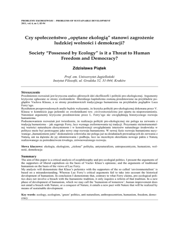 PROBLEMY EKOROZWOJU – PROBLEMS OF SUSTAINABLE DEVELOPMENT 2011, vol. 6, no 1, 83-94 Czy społeczeństwo „opętane ekologią” stanowi zagrożenie ludzkiej wolności i demokracji? Society “Possessed by Ecology” is it a Threat to Human Freedom and Democracy? Zdzisława Piątek Prof. em. Uniwersytet Jagielloński Instytut Filozofii, ul. Grodzka 52, 31-044, Kraków Streszczenie Przedmiotem rozważań jest krytyczna analiza głównych idei ekofilozofii i polityki pro-ekologicznej. Argumenty krytyczne zgłaszane ze strony zwolenników liberalnego kapitalizmu zostaną przedstawione na przykładzie poglądów Vaclava Klausa, a ze strony przedstawicieli tradycyjnego humanizmu na przykładzie poglądów Luca Ferry’ego. Rezultatem przeprowadzonych analiz będzie wykazanie, że krytyka polityki pro-ekologicznej dokonana przez V. Klausa w kontekście jego polemiki ze zwolennikami tzw. environmentalizmu jest oparta na nieporozumieniu. Natomiast argumenty krytyczne przedstawione przez L. Ferry’ego nie uwzględniają historycznego rozwoju humanizmu. Podsumowaniem rozważań jest twierdzenie, że realizacja polityki pro-ekologicznej nie polega na zerwaniu z tradycją humanizmu – jak sugeruje Ferry, lecz wymaga zreformowania tej tradycji. Przyznanie nieinstrumentalnej wartości naturalnym ekosystemom i w konsekwencji uwzględnianie interesów naturalnego środowiska w polityce może być postrzegane jako nowy etap rozwoju humanizmu. W nowej fazie rozwoju humanizmu nazywanego „humanizmem jutra” doskonalenie człowieka nie polega już na działaniach prowadzących do zerwania z Naturą, ani na dążeniu do jej zdominowania i podboju, lecz na mozolnym określaniu nowego paktu z Naturą realizowanego za pośrednictwem trwałego, zrównoważonego rozwoju. Słowa kluczowe: ekologia, ekologizm, „zielona” polityka, antynaturalizm, antropocentryzm, humanizm, wolność, demokracja Summary The aim of this paper is a critical analysis of ecophilosophy and pro-ecologial politics. I present the arguments of the supporters of liberal capitalism on the basis of Vaclav Klaus’s opinions; and the arguments of traditional humanism on the basis of the views of Luc Ferry. My analysis will demonstrate that Klaus’s polemics with the supporters of the so called ‘environmentalism’ is based on a misunderstanding. Whereas Luc Ferry’s critical arguments fail to take into account the historical development of humanism. In conclusion I demonstrate that, contrary to what Ferry claims, pro-ecological politics does not involve a breach with the humanistic tradition, it only requires a reform of that tradition. In a new phase of development of humanism, which we may call the ‘humanism of tomorrow’, human improvement does not entail a breach with Nature, or a conquest of Nature, it entails a new pact with Nature that will be realized by means of sustainable development. Key words: ecology, ecologism, ‘green’ politics, anti-naturalism, anthropocentrism, humanism, freedom, democracy 84 Piątek/Problemy Ekorozwoju/Problems of Sustainable Development 1/2011, 83-94 Uwagi wstępne Określenie społeczeństwo opętane ekologią zaczerpnęłam z propagandowej książeczki Vaclava Klausa Błękitna planeta w zielonych okowach, Co jest zagrożone: klimat czy wolność? (2008) stanowiącej bezkompromisową krytykę tzw. environmentalizmu na przykładzie poglądów Ala Gore’a (1996). Vaclav Klaus twierdzi – powołując się na prace B. Lomborga i F. Rosa Jak ochłodzić Ala Gore’a apostoła ocieplenia, że z powodu niebezpieczeństwa globalnego ocieplenia, dąży on, podobnie jak wielu innych uczestników ruchu „Zielonych”, do radykalnej zmiany podstaw naszej cywilizacji. Al Gore uważa ochronę środowiska naturalnego za „najlepszą zasadę organizacyjną nowoczesnego państwa” wokół której wszystko miałoby się kręcić, co jest po prostu absurdalne” przekonuje Klaus (s. 31). Zarzuca on Al Gore’owi, że wykorzystuje zarówno tematy ekologiczne, jak i działania podejmowane w celu ochrony naturalnego środowiska, do ograniczania ludzkiej wolności. Zielone okowy nakładane na ludzką wolność i demokrację, to jest między innymi, postulat solidarności międzypokoleniowej oraz nakaz uwzględniania kosztów środowiskowych w działalności gospodarczej. W argumentacji Klausa, wyrażenie społeczeństwo opętane ekologią, odnosi się do społeczeństwa, które wprowadza do polityki troskę o ochronę naturalnego środowiska. Wyrażenie to, podobnie jak wiele innych pokrewnych metafor, jest przykładem niezwykle wieloznacznego używania pojęcia „ekologia” we współczesnej literaturze. Jak już o tym pisałam (Piątek, 1997) pojęcie „ekologia” bywa odnoszone zarówno do ekologii jako dyscypliny biologicznej, jak i do ruchów społecznych inspirowanych przez ekologię i nazywanych ekologizmem. To właśnie humanizacja ekologii polegająca na popularyzacji jej podstawowych idei, dała początek społecznym ruchom o charakterze ideologicznym, które w sporach filozoficznych są nazywane ekologizmem, a Klaus nazywa je environmentalizmem. Ekologiści spod znaku Ruchu Wyzwolenia Zwierząt, Greenpeace, czy tzw. Ruchy Zielonych, działając w przestrzeni politycznej walczą o prawa zwierząt, protestują także przeciwko zanieczyszczaniu naturalnego środowiska i organizują wiele spektakularnych akcji na rzecz ochrony środowiska. Drugi nurt wynikający z humanizacji ekologii to ekofilozofia, która koncentruje się na poszukiwaniu filozoficznego uzasadnienia harmonijnej koegzystencji albo inaczej – kohabitacji gatunku ludzkiego z Przyrodą. Przedstawiając poglądy dotyczące filozofii środowiskowej Vaclava Klausa i Luca Ferry’ego będę używać pojęcia ”ekologia” w sposób wieloznaczny, gdyż z racji merytorycznych będę się odwoływać do wszystkich trzech dziedzin, które z niej wyrosły. Mam nadzieję, że kontekst wypo- wiedzi pozwoli odróżnić przywołane znaczenia