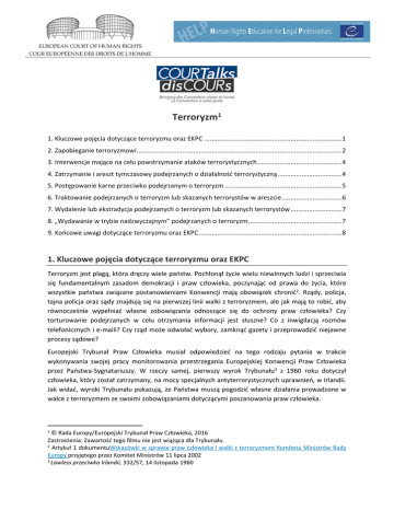 Terroryzm1 1. Kluczowe pojęcia dotyczące terroryzmu oraz EKPC ...........................................................................1 2. Zapobieganie terroryzmowi................................................................................................................2 3. Interwencje mające na celu powstrzymanie ataków terrorystycznych ..............................................4 4. Zatrzymanie i areszt tymczasowy podejrzanych o działalność terrorystyczną ...................................4 5. Postępowanie karne przeciwko podejrzanym o terroryzm ................................................................5 6. Traktowanie podejrzanych o terroryzm lub skazanych terrorystów w areszcie.................................6 7. Wydalenie lub ekstradycja podejrzanych o terroryzm lub skazanych terrorystów ............................7 8. „Wydawanie w trybie nadzwyczajnym” podejrzanych o terroryzm...................................................7 9. Końcowe uwagi dotyczące terroryzmu oraz EKPC..............................................................................8 1. Kluczowe pojęcia dotyczące terroryzmu oraz EKPC Terroryzm jest plagą, która dręczy wiele państw. Pochłonął życie wielu niewinnych ludzi i sprzeciwia się fundamentalnym zasadom demokracji i praw człowieka, poczynając od prawa do życia, które wszystkie państwa związane postanowieniami Konwencji mają obowiązek chronić2. Rządy, policja, tajna policja oraz sądy znajdują się na pierwszej linii walki z terroryzmem, ale jak mają to robić, aby równocześnie wypełniać własne zobowiązania odnoszące się do ochrony praw człowieka? Czy torturowanie podejrzanych w celu otrzymania informacji jest słuszne? Co z inwigilacją rozmów telefonicznych i e-maili? Czy rząd może odwołać wybory, zamknąć gazety i przeprowadzić niejawne procesy sądowe? Europejski Trybunał Praw Człowieka musiał odpowiedzieć na tego rodzaju pytania w trakcie wykonywania swojej pracy monitorowania przestrzegania Europejskiej Konwencji Praw Człowieka przez Państwa-Sygnatariuszy. W rzeczy samej, pierwszy wyrok Trybunału3 z 1960 roku dotyczył człowieka, który został zatrzymany, na mocy specjalnych antyterrorystycznych uprawnień, w Irlandii. Jak widać, wyroki Trybunału pokazują, że Państwa muszą pogodzić własne działania prowadzone w walce z terroryzmem ze swoimi zobowiązaniami dotyczącymi poszanowania praw człowieka. © Rada Europy/Europejski Trybunał Praw Człowieka, 2016 Zastrzeżenia: Zawartość tego filmu nie jest wiążąca dla Trybunału. 2 Artykuł 1 dokumentuWskazówki w sprawie praw człowieka i walki z terroryzmem Komitetu Ministrów Rady Europy przyjętego przez Komitet Ministrów 11 lipca 2002 3 Lawless przeciwko Irlandii, 332/57, 14 listopada 1960 1 Pozwolę sobie zauważyć, że Konwencja daje państwom pewną swobodę działania w przypadku sytuacji, które zostaną uznane za stan niebezpieczeństwa publicznego. Zawarte jest to w Art. 15, który pozwala państwom na uchylenie stosowania niektórych zobowiązań. Uchylenie może nastąpić „w przypadku wojny lub innego niebezpieczeństwa publicznego zagrażającego życiu narodu”. Jakiekolwiek podjęte środki muszą mieścić się w ramach ściśle określonych sytuacji i muszą być w zgodzie z innymi zobowiązaniami państwa wynikającymi z prawa międzynarodowego. Jednakże, odpowiadając również na jedno z postawionych wcześniej pytań, są pewne prawa, które nie mogą zostać uchylone, włączając w to prawo do niebycia poddawanym torturom lub innym formom brutalnego traktowania, zagwarantowane w Art. 3. Jest to jedno z praw uważane przez Konwencję za absolutne i jakiekolwiek uchylenie tego prawa nie jest możliwe w żadnej sytuacji4. Państwa na określonych podstawach mogą ograniczyć większość praw, zawartych w Konwencji, które nie są uważane za prawa absolutne, nawet przed powołaniem się na Art. 15. Obejmuje to sytuacje zagrożenia bezpieczeństwa, jak na przykład bezpośrednie zagrożenie atakiem terrorystycznym, lecz nie tylko. Państwa posiadają, jak zostało to określone przez Trybunał, margines oceny; innymi słowy, zakres swobody w celu zrównoważania praw jednostki wobec interesów bezpieczeństwa narodowego5. Podczas prezentacji zostanie przedstawione, że walka z terroryzmem nie daje Państwom carte blanche na ingerencję w prawa podmiotów znajdujących się w ich jurysdykcji. Rządy zawsze będą musiały wykazać, że środki, które zostały podjęte w celu zwalczania terroryzmu były uzasadnione na podstawie jednej lub kilku podstaw określonych w tekście Konwencji, lub w interpretacji Trybunału zawartej w wyrokach. Spójrzmy teraz na niektóre kluczowe przypadki związane z kwestią terroryzmu. 2. Zapobieganie terroryzmowi W celu zapobiegania terroryzmowi Państwa mogą podjąć środki, które przykładowo, naruszają prawo do poszanowania życia prywatnego, wolności wyrażania opinii lub zrzeszania się oraz prawo do wolnych wyborów. W Art. 8 Konwencji stwierdza się, że każdy ma prawo do poszanowania swojego życia prywatnego i rodzinnego. Jednakże, walka z terroryzmem dopuszcza używanie specjalnych metod inwigilacji w celu zbierania informacji pomocnych w zapobieganiu aktom terrorystycznym oraz podczas aresztowania i sądowego ścigania podejrzanych o terroryzm. Już w latach 70-tych Trybunał przyznał, że legislacja pozwalająca na tajny monitoring poczty, e-maili i telekomunikacji, w społeczeństwie demokratycznym, była w wyjątkowych okolicznościach konieczna, w interesie bezpieczeństwa narodowego i/lub w celu zapobiegania rozruchom lub przestępstwu6. Niedawno Trybunał uznał, że inwigilacja podejrzanych o terroryzm przy użyciu systemu GPS nie naruszała ich prawa do prywatności zagwarantowanego w myśl Art. 87. W tym 4 Alan przeciwko Turcji [GC], 46221/99, § 179, EKPC 2005-IV oraz A. i inni przeciwko Zjednoczonemu Królestwu [GC], 3455