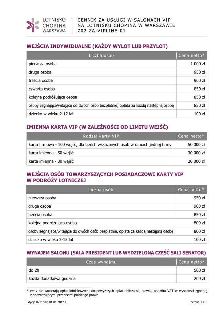 CENNIK ZA USŁUGI W SALONACH VIP NA LOTNISKU CHOPINA W WARSZAWIE Z02-ZA-VIPLINE-01 WEJŚCIA INDYWIDUALNE (KAŻDY WYLOT LUB PRZYLOT) Liczba osób Cena netto* pierwsza osoba 1 000 zł druga osoba 950 zł trzecia osoba 900 zł czwarta osoba 850 zł kolejna podróżująca osoba 850 zł osoby żegnające/witające do dwóch osób bezpłatnie, opłata za każdą następną osobę 850 zł dziecko w wieku 2-12 lat 100 zł IMIENNA KARTA VIP (W ZALEŻNOŚCI OD LIMITU WEJŚĆ) Rodzaj karty VIP Cena netto* karta firmowa - 100 wejść, dla trzech wskazanych osób w ramach jednej firmy 50 000 zł karta imienna - 50 wejść 30 000 zł karta imienna - 30 wejść 20 000 zł WEJŚCIA OSÓB TOWARZYSZĄCYCH POSIADACZOWI KARTY VIP W PODRÓŻY LOTNICZEJ Liczba osób Cena netto* pierwsza osoba 950 zł druga osoba 900 zł trzecia osoba 850 zł kolejna podróżująca osoba 800 zł osoby żegnające/witające do dwóch osób bezpłatnie, opłata za każdą następną osobę 800 zł dziecko w wieku 2-12 lat 100 zł WYNAJEM SALONU (SALA PRESIDENT LUB WYDZIELONA CZĘŚĆ SALI SENATOR) Czas wynajmu Cena netto* do 2h 500 zł każda dodatkowa godzina 200 zł * ceny nie zawierają opłat lotniskowych; do powyższych opłat dolicza się stawkę podatku VAT w wysokości zgodnej z obowiązującymi przepisami polskiego prawa. Edycja 02 z dnia 01.01.2017 r. Strona 1 z 1