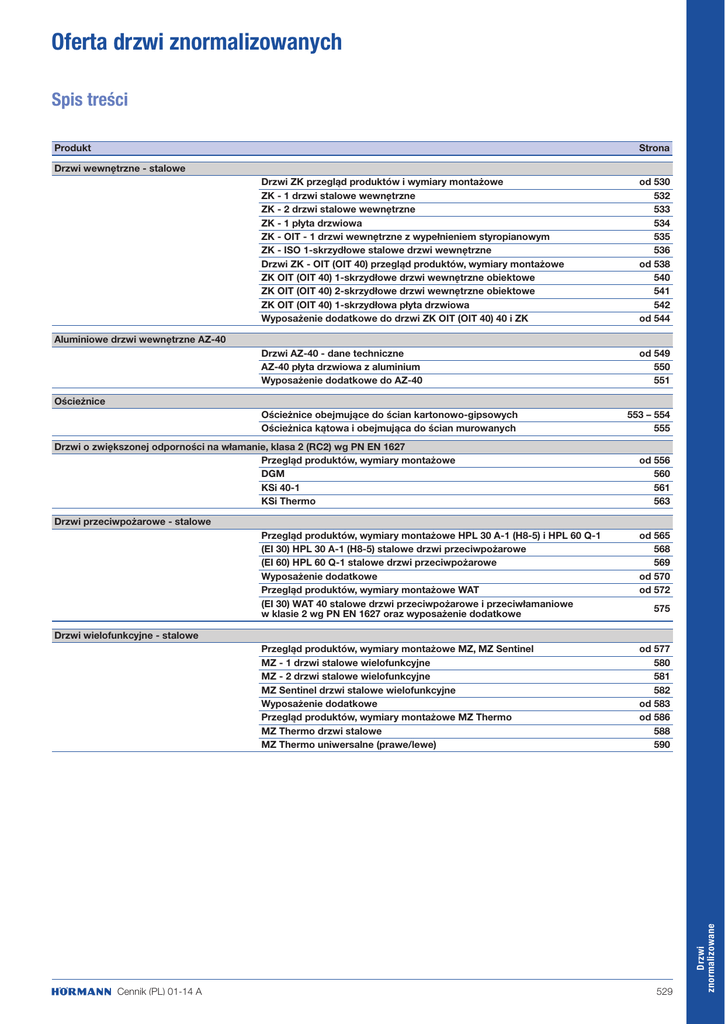 Oferta drzwi znormalizowanych Spis treści Produkt Strona Drzwi wewnętrzne - stalowe Drzwi ZK przegląd produktów i wymiary montażowe ZK - 1 drzwi stalowe wewnętrzne ZK - 2 drzwi stalowe wewnętrzne ZK - 1 płyta drzwiowa ZK - OIT - 1 drzwi wewnętrzne z wypełnieniem styropianowym ZK - ISO 1-skrzydłowe stalowe drzwi wewnętrzne Drzwi ZK - OIT (OIT 40) przegląd produktów, wymiary montażowe ZK OIT (OIT 40) 1-skrzydłowe drzwi wewnętrzne obiektowe ZK OIT (OIT 40) 2-skrzydłowe drzwi wewnętrzne obiektowe ZK OIT (OIT 40) 1-skrzydłowa płyta drzwiowa Wyposażenie dodatkowe do drzwi ZK OIT (OIT 40) 40 i ZK od 530 532 533 534 535 536 od 538 540 541 542 od 544 Drzwi AZ-40 - dane techniczne AZ-40 płyta drzwiowa z aluminium Wyposażenie dodatkowe do AZ-40 od 549 550 551 Aluminiowe drzwi wewnętrzne AZ-40 Ościeżnice Ościeżnice obejmujące do ścian kartonowo-gipsowych Ościeżnica kątowa i obejmująca do ścian murowanych Drzwi o zwiększonej odporności na włamanie, klasa 2 (RC2) wg PN EN 1627 Przegląd produktów, wymiary montażowe DGM KSi 40-1 KSi Thermo 553 – 554 555 od 556 560 561 563 Drzwi przeciwpożarowe - stalowe Przegląd produktów, wymiary montażowe HPL 30 A-1 (H8-5) i HPL 60 Q-1 (EI 30) HPL 30 A-1 (H8-5) stalowe drzwi przeciwpożarowe (EI 60) HPL 60 Q-1 stalowe drzwi przeciwpożarowe Wyposażenie dodatkowe Przegląd produktów, wymiary montażowe WAT (EI 30) WAT 40 stalowe drzwi przeciwpożarowe i przeciwłamaniowe w klasie 2 wg PN EN 1627 oraz wyposażenie dodatkowe od 565 568 569 od 570 od 572 Przegląd produktów, wymiary montażowe MZ, MZ Sentinel MZ - 1 drzwi stalowe wielofunkcyjne MZ - 2 drzwi stalowe wielofunkcyjne MZ Sentinel drzwi stalowe wielofunkcyjne Wyposażenie dodatkowe Przegląd produktów, wymiary montażowe MZ Thermo MZ Thermo drzwi stalowe MZ Thermo uniwersalne (prawe/lewe) od 577 580 581 582 od 583 od 586 588 590 575 Cennik (PL) 01-14 A 529 Drzwi znormalizowane Drzwi wielofunkcyjne - stalowe Drzwi wewnętrzne Przegląd produktów Opis produktu Zastrzegamy sobie prawo do zmian Drzwi znormalizowane Typy Oznaczenie Nr Aprobaty Technicznej Dopuszczone do montażu w ścianach: murowanych betonowych z betonu komórkowego montażowych/przeciwpożarowych Funkcje dodatkowe – standard izolacyjność termiczna U = W/(m2·K) klasa klimatyczna wg RAL RG 426 grupa obciążeniowa wg RAL RG 426 Funkcje dodatkowe z odpowiednim wyposażeniem dymoszczelność izolacyjność akustyczna zwiększona odporność na włamanie Płyta drzwiowa grubość płyty drzwiowej (w mm) grubość blachy (w mm) przeszklenie cienka przylga gruba przylga przylga Zawiasy (standard) płyta drzwiowa z 2 górnymi elementami zawiasów V0020, ościeżnica z 2 przyspawanymi dolnymi elementami zawiasów Zamki (standard) zamek wpuszczany zgodnie z DIN 18251 klasa 3, przystosowany do wkładki patentowej, ze zwykłym zamkiem i 1 zwykłym kluczem Dopuszczony zakres wymiarowy szerokość wymiar w świetle ościeżnicy wysokość 530 ZK-1 AT-15-3435/2014 ZK-2 AT-15-3435/2014 • • • • • • 2,1 III S 40 0,6 • 40 0,6 • • 3-stronna • 3-stronna • • • • 436 - 1186 1468 - 2218 1436 - 2436 1468 - 2218 Cennik (PL) 01-14 A Drzwi wewnętrzne ZK Przegląd produktów Zastrzegamy sobie prawo do zmian Wymiary montażowe Rozmieszczenie kotew ZK wymiar zewnętrzny ościeżnicy = BR + 26 wymiar światła otworu = BR + 10 wymiar zestawczy (BR) Na zamówieniu należy podać kierunek otwierania: wymiar w światle ościeżnicy* (szer. LZ ) lewe OFF wymiar na przyldze = BR - 34 prawe * Wymiar światła przejścia = BR szerokość - 64 mm, BR wysokość - 32 mm. Szerokość światła przejścia przy kącie otwarcia 90° bez uwzględnienia okuć zmniejsza się o 2 mm. ** Element wpuszczany w posadzkę 30 mm. *** od poziomu posadzki wymiar zewnętrzny ościeżnicy = BR + 13*** wymiar zewnętrzny płyty drzwiowej = BR - 15 wymiar na przyldze = BR - 17 wymiar w świetle ościeżnicy * LZ wymiar zestawczy BR wymiar światła otworu = BR + 5 wymiar zewnętrzny płyty drzwiowej = BR - 15 OFF ** ** Element wpuszczony w posadzkę 30 mm Warianty ościeżnic i rodzaje mocowań 10 55 28,5 12 30 45 15 30 Ościeżnica obejmująca Cennik (PL) 01-14 A Montaż w murze na kołki rozporowe 531 Drzwi znormalizowane 8 28,5 MW - grubość ściany Standardowa ościeżnica kątowa Montaż w murze na kołki rozporowe 28 Drzwi wewnętrzne ZK 1-skrzydłowe 40 Wymiar w świetle ościeżnicy (LZ) Opis produktu Gotowy do montażu zestaw drzwiowy jednoskrzydłowy. Drzwi wewnętrzne stalowe ZK posiadają Aprobatę Techniczną Instytutu Techniki Budowlanej w Warszawie AT-15-3435/2014 Płyta drzwiowa o grubości 40 mm, z trójstronną przylgą (gruba przylga), ścianki drzwi wykonane z obustronnie ocynkowanej blachy stalowej o grubości 0,6 mm, wewnątrz wypełnienie mikrowęzowe, sklejone na całej powierzchni ze ściankami stalowymi. Płyta drzwiowa pełna lub z przygotowanym otworem do przeszklenia (zalecana grubość przeszklenia 4-6 mm). Ościeżnica Specjalna spawana ościeżnica kątowa o grubości 1,5 mm, z uszczelką amortyzującą na trzech krawędziach i przyspawanymi kotwami montażowymi. Kierunek otwierania Na zamówieniu należy zaznaczyć kierunek otwierania: Powierzchnia zewnętrzna Płyta drzwiowa z blachy ocynkowanej, do wyboru: • cynkowana, • malowana proszkowo na biało (na bazie RAL 9016) • malowana proszkowo (faktura: gładki mat) w następujących kolorach preferowanych: jasnoniebieski (RAL 5014), jasnoszary (RAL 7035), jasna kość słoniowa (RAL 1015), szary (RAL 7040), czerwony (RAL 3003), ciemnozielony (RAL 6005), antracytowy (RAL 7016), brązowa glinka (RAL 8003), brązowy (RAL 8028), białe aluminium (RAL 9006), • cynkowana i następnie malowana proszkowo (faktura: gładki połysk) na dowolny kolor z palety RAL - za dopłatą, • pokrywana folią z tworzywa sztucznego imitującego drewno: jasny dąb, buk, biały jesion, Dark Oak, Golden Oak, Night Oak i Melinga Dark. Ościeżnica z blachy