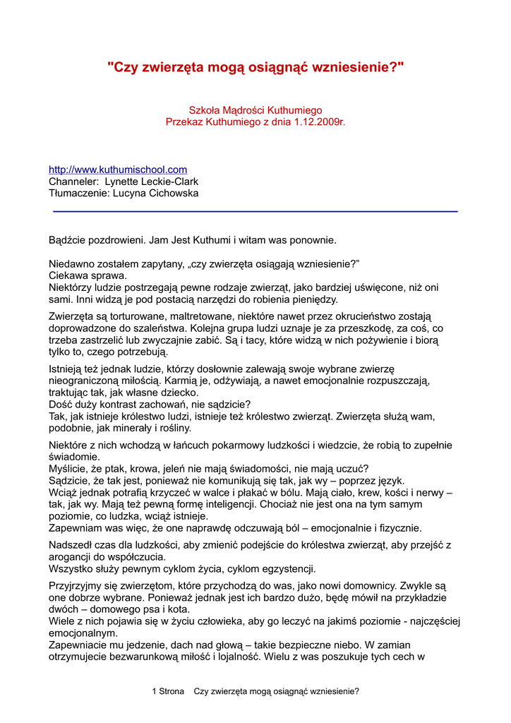 "Czy zwierzęta mogą osiągnąć wzniesienie?" Szkoła Mądrości Kuthumiego Przekaz Kuthumiego z dnia 1.12.2009r. http://www.kuthumischool.com Channeler: Lynette Leckie-Clark Tłumaczenie: Lucyna Cichowska Bądźcie pozdrowieni. Jam Jest Kuthumi i witam was ponownie. Niedawno zostałem zapytany, „czy zwierzęta osiągają wzniesienie?” Ciekawa sprawa. Niektórzy ludzie postrzegają pewne rodzaje zwierząt, jako bardziej uświęcone, niż oni sami. Inni widzą je pod postacią narzędzi do robienia pieniędzy. Zwierzęta są torturowane, maltretowane, niektóre nawet przez okrucieństwo zostają doprowadzone do szaleństwa. Kolejna grupa ludzi uznaje je za przeszkodę, za coś, co trzeba zastrzelić lub zwyczajnie zabić. Są i tacy, które widzą w nich pożywienie i biorą tylko to, czego potrzebują. Istnieją też jednak ludzie, którzy dosłownie zalewają swoje wybrane zwierzę nieograniczoną miłością. Karmią je, odżywiają, a nawet emocjonalnie rozpuszczają, traktując tak, jak własne dziecko. Dość duży kontrast zachowań, nie sądzicie? Tak, jak istnieje królestwo ludzi, istnieje też królestwo zwierząt. Zwierzęta służą wam, podobnie, jak minerały i rośliny. Niektóre z nich wchodzą w łańcuch pokarmowy ludzkości i wiedzcie, że robią to zupełnie świadomie. Myślicie, że ptak, krowa, jeleń nie mają świadomości, nie mają uczuć? Sądzicie, że tak jest, ponieważ nie komunikują się tak, jak wy – poprzez język. Wciąż jednak potrafią krzyczeć w walce i płakać w bólu. Mają ciało, krew, kości i nerwy – tak, jak wy. Mają też pewną formę inteligencji. Chociaż nie jest ona na tym samym poziomie, co ludzka, wciąż istnieje. Zapewniam was więc, że one naprawdę odczuwają ból – emocjonalnie i fizycznie. Nadszedł czas dla ludzkości, aby zmienić podejście do królestwa zwierząt, aby przejść z arogancji do współczucia. Wszystko służy pewnym cyklom życia, cyklom egzystencji. Przyjrzyjmy się zwierzętom, które przychodzą do was, jako nowi domownicy. Zwykle są one dobrze wybrane. Ponieważ jednak jest ich bardzo dużo, będę mówił na przykładzie dwóch – domowego psa i kota. Wiele z nich pojawia się w życiu człowieka, aby go leczyć na jakimś poziomie - najczęściej emocjonalnym. Zapewniacie mu jedzenie, dach nad głową – takie bezpieczne niebo. W zamian otrzymujecie bezwarunkową miłość i lojalność. Wielu z was poszukuje tych cech w 1 Strona Czy zwierzęta mogą osiągnąć wzniesienie? relacjach z ludźmi, jednak nie może ich znaleźć. Dajecie więc dużo miłości i czułości swojemu zwierzęciu, chociaż zwykle jest ono szczęśliwe już wtedy, gdy przebywa z wami w jednym pokoju. Wielu z was zwierza się swoim pupilom z problemów, obaw, uczuć. Czasem możecie dostrzec, jak głęboko się w was wpatrują. W takim momencie rozumieją wasze emocje, wasze uczucia. Pies na przykład, zawsze wstanie, podejdzie do was i jeśli siedzicie, oprze swoją głowę na waszych kolanach. To zastępuje mu możliwość ludzkiego ukochania drugiej osoby. Zwierzęta komunikują się z ludźmi na innym poziomie i rozumieją więcej, niż wam się wydaje. Oczy są jak drzwi do waszej duszy i to również dotyczy tych zwierzęcych. Ci z was, którzy wsłuchują się w głos swojej duszy, wiedzą, o czym mówię. Często trudno jest kochać i dawać całkowicie, bezwarunkowo. Zwierzę to potrafi. Wiele domowych psów tak robi. Nauczyły się, że ich ludzki przyjaciel jest wszystkim, co ma znaczenie. Nauczyły się, że w tej relacji jest miłość, pokój i zaufanie. Stały się bardzo oddane i lojalne. Ilu z was doświadczając bliskich relacji z drugim człowiekiem, może powiedzieć to samo? Ilu potrafi kochać bezwarunkowo? Pomyślcie nad tym przez chwilę. Oznacza to przecież akceptację różnych schematów zachowań tej drugiej osoby, zarówno tych dobrych, jak i tych, które nam przeszkadzają. Czy potraficie prawdziwie je zaakceptować? Pies potrafi. Postrzegacie zwierzęta jako gorsze od siebie, a czasem są one nauczycielami. Nawet, kiedy jesteście zdenerwowani, pies siedzi nieco dalej i czeka, aż ta złość z was ujdzie, aby mógł wejść w wasze pole energetyczne. Robi to bez oceny czy osądu. Są psy i koty, które przychodzą do człowieka, ponieważ dzieliły z nim już poprzednie wcielenie i prawdopodobnie zostały z niego jakieś niedokończone sprawy, dlatego wracają. Podobnie jak dwie ludzkie dusze potrafią się rozpoznać, rozpoznają się też dusza ludzka i zwierzęca. To jest nagłe zrozumienie, nagła świadomość znajomości tej drugiej duszy. Bardzo wygodnie czując się w towarzystwie ludzi, zwierzęta inkarnują na Ziemi z konkretnego powodu. Powiedzenie naszj channelerki przyszło mi właśnie do głowy: „Zaoferuj zwierzęciu dom, a odpłaci ci życzliwością.” Dalej uważacie, że zwierzęta nie są inteligentne? Mówię wam, pomyślcie nad tym jeszcze raz. Zacznijcie obserwować. Zostałem więc zapytany, czy zwierzę może osiągnąć wzniesienie. Czym jest wzniesienie? Jak myślicie, co się wtedy dzieje? Człowiek doświadcza wcielenie za wcieleniem, ucząc się przy tym i zwierzę domowe robi podobnie. Mówię „domowe” nie bez przyczyny. Te zwierzęta noszą w sobie więcej Światła, więcej miłości, idą też inną ścieżką ku wzniesieniu, ponieważ służyły ludzkości i Bogu, tak samo, jak wy. Widzicie, moi przyjaciele, myślicie, że wzniesienie przychodzi przez naukę i studiowanie. Jest ono jednak zrozumieniem i ludzką ekspresją. Nie można go osiągnąć, dopóki nie zacznie się kierować sercem, bezwarunkowo, z miłością i bez osądzania innych. Bez ranienia drugiej osoby czy to fizycznie czy za pomocą słów. Rozumiecie to? Widzicie teraz, jak wiele jest poziomów na drodze do wzniesienia? 2 Strona Czy zwierzęta mogą osiągnąć wzniesienie? Często więzi łączące człowieka i jego zwierzę stają się bardzo silne. I jedno i drugie