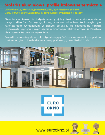 Stolarka aluminiowa, profile izolowane termicznie Drzwi wejściwe, obrotowe, przesuwne, ppoż, dymoszczelne, paniczne Okna, witryny, ścianki, zabudowy balkonów, ppoż, dymoszczelne, Fasady Stolarka aluminiowa to indywidualne projekty dostosowane do oczekiwań naszych Klientów. Zachwycają formą, kolorem, szkleniem, technologicznym rozwiązaniem wymaganym w danym obiekcie. Po uzgodnieniu funkcji użytkowych, wyglądu i wyposażenia w końcowym efekcie otrzymują Państwo idealną stolarkę do własnego obiektu. Produkt niepodobny do innych, odpowiadający Państwa indywidualnym gustom i potrzebom, funkcjonalny i nowoczesny, podnoszący prestiż właściciela. www.eurookno.pl Wyposażenie dodatkowe: duży wybór klamek, pochwytów, stopek podporowych, samozamykacy, zamków dodatkowych i elektromagnetycznych, wkładek “antywłamaniowych” pochwytów panicznych, wypełnień aluminiowych, pakietów 23 szybowych, automatów drzwiowych, otwieraczy naświetli HAUTAU, okuć o podwyższonej odporności na włamanie, bolców antywyważeniowych. Kolory Bogata kolorystyka wg palety RAL oraz w okleinach drewnopodobnych wg palety Renolit, możliwa zgodność z kolorem okien i zbliżona kolorystyka do elewacji budynku, dachu. Partner handlowy Stolarkę aluminiową kupujemy raz na kilkanaście lat, a często raz w życiu i jest to dla nas spory wydatek. Wybór jest duży, konsultacja jest pierwszym krokiem przy wyborze dobrego produktu. Rekomendujemy Państwu naszego Partnera, który zna firmę Eurookno oraz naszą ofertę produktową i będzie umiał dostosować ją do Państwa oczekiwań i potrzeb. PRZESUWNE AUTOMATYCZNE OKNA-DRZWI ZABUDOWY BALKONÓW Aluminiowe konstrukcje produkowane przez Eurookno mają zastosowanie wszędzie tam, gdzie jest wymagana wysoka jakość, trwałość, odpowiednia kolorystyka oraz odporność na wpływ środowiska, podwyższona ochrona przed włamaniem lub ochrona przed skutkami pożaru i d y m u . P ro f i l e a l u m i n i o we u m oż l i w i a j ą konstruowanie różnego rodzaju kształtów i form. Aluminium jako materiał konstrukcyjny nadaje stolarce estetyczny i trwały wygląd oraz wieloletnie i bezpieczne użytkowanie. Wyroby z aluminium są łatwe w pielęgnacji i praktycznie nie wymagają konserwacji. Są bardzo odporne na wpływ czynników atmosferycznych i wyjątkowo trwałe. OKNA- DRZWI PPOŻ ANTYPANICZNE Tak dynamiczny rozwój firmy zawdzięczamy zastosowaniu najnowszych technologii, wysoce wykwalifikowanej kadrze kierowniczej oraz profesjonalnej załodze. Dzięki wysokiej jakości naszych produktów kreujemy cenioną markę jaką jest Euro Okno. FASADY Eurookno to firma, która od 2000 roku dostarcza Państwu stolarkę PCV i aluminium. Z biegiem czasu rośnie jakość naszych produktów, tak jak zmieniają się Państwa wymagania. Jesteśmy wiodącym producentem stolarki otworowej w północnowschodniej części Polski z przeszło 15 letnim doświadczeniem, a nasza pozycja na rynku ogólnopolskim stale rośnie. Okna i drzwi wykonane z wysokiej jakości aluminium, profile wielokomorowe od 3 do 6 komór, wysokiej stabilności, z możliwością stosowania różnego rodzaju dodatkowych elementów izolacyjnych. System pozwala uzyskać smukłe i wytrzymałe konstrukcje okien i drzwi, wyróżniające się wysokiej jakości izolacją cieplną. Drzwi przesuwne automatyczne lub manualne wbudowane indywidualnie, w większych przeszkleniach lub fasadach. System aluminiow y, przeznaczony do wykonywania przeszkleń balkonów. Ideę tego rozwiązania stanowią okna przesuwne w poziomie. Zbudowane z niego okna chronią o t w a r t ą p r z e s t r z e ń b a l ko n ó w p r z e d niekorzystnymi warunkami atmosferycznymi tzn. wiatrem, deszczem, śniegiem oraz zabrudzeniem i hałasem. Konstrukcje utrudniają jednocześnie włamanie, co jest szczególnie istotną cechą w mieszkaniach parterowych. System drzwi i okien stosowany jest w wewnętrznych lub zewnętrznych przegrodach przeciwpożarowych z drzwiami jedno i dwuskrzydłowymi o klasie odporności ogniowej Ei15, Ei30, Ei45 lub Ei60 według normy PN-EN 13501-2+A:2010 Aluminiowe drzwi z klamką antypaniczną, mogą być profilowe, p r z y my ko w e , d o d a t ko w o p ł a s zc zo w e przeciwpożarowe. Są to drzwi wyposażone w specjalny układ okuć w kilku wariantach zapewniające bezpieczne i szybkie wydostanie się z pomieszczeń w razie niebezpieczeństwa. Dzięki różnym wariantom, można dopasować drzwi wraz z okuciami idealnie pasujące do przeznaczenia pomieszczeń, w którym będą montowane bezpiecznie, oraz do wymagań Klienta. System fasadowy pozwala na elastyczne t w o r ze n i e i m p o n u j ą c yc h , w y d a j nyc h i funkcjonalnych elewacji. System spełnia wysokie wymagania konstruktorskie stawiane współczesnym ścianom osłonowym z możliwością wykonywania ciekawych i śmiałych architektonicznie konstrukcji. System fasadowy stosowany w wewnętrznych i zewnętrznych fasadach, naświetlach i zadaszeniach. Eurookno ul. Warszawska 21; 16-400 Suwałki tel. 87 565 05 05 e-mail: [email protected] www.eurookno.pl Niniejsza publikacja ma charakter informacyjny i nie stanowi oferty w rozumieniu prawa