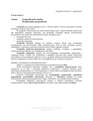 Geografia (semestr 3 / gimnazjum) Lekcja numer 1 Temat: Geografia jako nauka. Współrzędne geograficzne. Geografia jest nauką opisującą świat, w którym żyjemy. Wyraz geographia (z języka greckiego) oznacza 'opis ziemi'. W geografii wykorzystuje się wiele metod badawczych z takich dziedzin naukowych jak: kartografia, geologia, statystyka, czy ekonomia. Geografia opisuje zróżnicowanie przyrodnicze oraz społeczno-ekonomiczne Ziemi. Dzielimy ją na: • geografię fizyczną, • geografię społeczno-ekonomiczną, • geografię regionalną. Geografia fizyczna zajmuje się budową wnętrza Ziemi oraz czynnikami kształtującymi jej powierzchnię. Bada rozmieszczenie wód na kuli ziemskiej, procesy zachodzące w powietrzu, pozwala zrozumieć prawa fizyki rządzące światem. Geografia społeczno-ekonomiczna opisuje problemy związane z gospodarką, rozmieszczeniem ludności oraz działalnością człowieka. Geografia regionalna zajmuje się poszczególnymi kontynentami, państwami i regionami Ziemi. Czerpie ona wiadomości z geografii fizycznej (aby opisać środowisko przyrodnicze poszczególnych regionów) oraz z geografii społeczno-ekonomicznej (dostarcza danych związanych z życiem ludzi oraz ich działalnością na wybranym obszarze). ŹRÓDŁA INFORMACJI GEOGRAFICZNEJ Jednym z ważniejszych źródeł informacji geograficznych jest atlas. Wiele potrzebnych informacji znajduje się w rocznikach statystycznych, które wydawane są co roku i zawierają najnowsze wiadomości z różnych dziedzin życia. Informacje przedstawione są w nich najczęściej w formie tabel zawierających dane liczbowe, dane te dotyczą najczęściej poprzedniego roku (rys.1). Cennych wiadomości dostarczają też encyklopedie, podręczniki, czasopisma geograficzne, przewodniki turystyczne. Również w Internecie znajduje się wiele różnorodnych informacji geograficznych, zdjęć, schematów, czy interaktywnych animacji. Poszukując informacji dotyczących regionu w którym mieszkamy, możemy przeprowadzać własne obserwacje terenowe oraz udać się do odpowiednich urzędów. Copyright © 2003-2009 by Menedzer.pl All rights reserved 1 Rys.1. Przykład tabeli z danymi z rocznika statystycznego KSZTAŁT I WYMIARY ZIEMI W przeszłości wyobrażano sobie kształt Ziemi w różny sposób: w starożytności często przedstawiano świat jako wypukłą tarczę, spoczywającą na grzbietach różnych zwierząt, w średniowieczu jako dysk pływający po bezkresnym oceanie (przy czym uważano, że Słońce i gwiazdy codziennie wynurzały się z oceanu na wschodzie a zanurzały w nim na zachodzie). Pierwsze dowody na kulistość Ziemi przedstawił w IV w. p.n.e. Arystoteles (grecki filozof). Natomiast w III w. p.n.e. Eratostenes z Cyreny po raz pierwszy dokonał pomiaru wielkości Ziemi. Zmierzył on kąt padania promieni słonecznych w dwóch egipskich miastach – Aleksandrii i Syene. Znając odległość pomiędzy nimi i porównując wyniki obliczeń, wyliczył on obwód Ziemi. Pomimo tego że kulistość Ziemi stwierdzono już w starożytności, aż do połowy XVI w. panował pogląd, że Ziemia znajduje się w centrum wszechświata, a pozostałe ciała niebieskie krążą wokół niej. Teorię tę obalił Mikołaj Kopernik, który stwierdził, że to Ziemia wraz z innymi planetami obiega Słońce. W XVII w. odkryto, że Ziemia nie ma kształtu idealnej kuli. Obrót wokół własnej osi sprawia bowiem, że Ziemia jest spłaszczona przy biegunach. Bryłę o takich kształtach nazywa się elipsoidą. Dzięki precyzyjnym pomiarom wykonanym w ostatnich latach stwierdzono, że różnica pomiędzy promieniem równikowym a promieniem biegunowym wynosi ok. 21 km. Ponieważ Ziemia ma kształt bardziej nieregularny niż elipsoida, jej bryle nadano nazwę geoida. Copyright © 2003-2009 by Menedzer.pl All rights reserved 2 WSPÓŁRZĘDNE GEOGRAFICZNE Ziemia obraca się wokół niewidocznej osi, przechodzącej przez jej środek i bieguny. Jednym z jej modeli jest globus. Ponieważ jest on bardzo dużym pomniejszeniem naszej planety, nie da się na nim przedstawić spłaszczenia przy biegunach. Linie widoczne na globusie przecinające się pod kątem prostym to siatka geograficzna. Linie łączące bieguny to południki, natomiast linie przebiegające równolegle do równika to równoleżniki. Wartości południków i równoleżników przedstawiane są w miarach kątowych, czyli stopniach (°). Cechy południków: • wszystkie mają taką samą długość, • mają kształt półokręgów przebiegających od jednego bieguna do drugiego. Cechy równoleżników: • są różnej długości, • mają kształt okręgów zmniejszających się wraz z odległością od równika. W 1884 r. na podstawie międzynarodowego porozumienia, południkowi przechodzącemu przez Królewskie Obserwatorium Astronomiczne w Greenwich, w Londynie, przyporządkowano wartość 0° i nazywa się go południkiem początkowym. Mierzy się od niego długość geograficzną w kierunku wschodnim i zachodnim. Po przeciwnej stronie globu znajduje się południk 180°. Wraz z południkiem 0° dzieli on kulę ziemską na dwie półkule: wschodnią (na wschód od południka 0° aż do południka 180°) i zachodnią (na zachód od południka 0° aż do południka 180°). W przeciwieństwie do południków równoleżniki mają różną długość. Najdłuższym z nich jest równik, który dzieli kulę ziemską na dwie półkule: północną (na północ od równika) i południową (na południe od równika). Im bliżej biegunów tym równoleżniki są krótsze. Południków i równoleżników jest nieskończona liczba, a na mapach i globusie pokazuje się tylko niektóre z nich. Z nieskończonej liczby równoleżników wyróżnia się dwa zwrotniki: zwrotnik Raka (23°27'N) i zwrotnik Koziorożca (23°27'S) oraz dwa koła podbiegunowe: koło podbiegunowe północne (66°33'N) i koło podbiegunowe południowe (66°33'S). Punkty oznaczające bieguny mają 